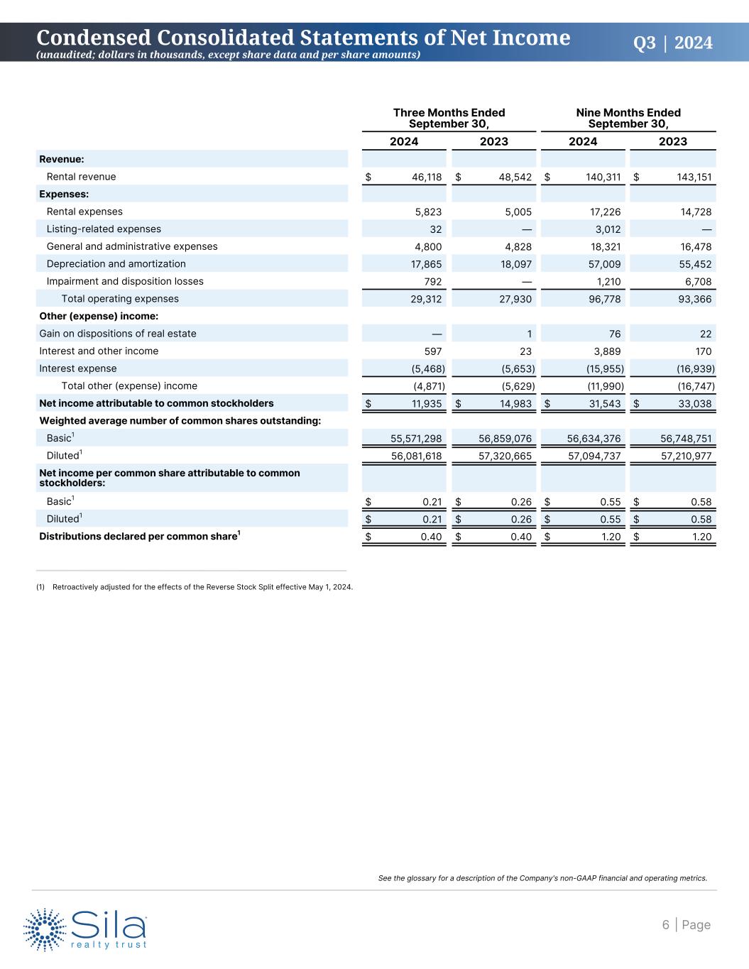 Q3 | 2024 Three Months Ended September 30, Nine Months Ended September 30,   2024 2023 2024 2023 Revenue: Rental revenue $ 46,118 $ 48,542 $ 140,311 $ 143,151 Expenses: Rental expenses 5,823 5,005 17,226 14,728 Listing-related expenses 32 — 3,012 — General and administrative expenses 4,800 4,828 18,321 16,478 Depreciation and amortization 17,865 18,097 57,009 55,452 Impairment and disposition losses 792 — 1,210 6,708 Total operating expenses 29,312 27,930 96,778 93,366 Other (expense) income: Gain on dispositions of real estate — 1 76 22 Interest and other income 597 23 3,889 170 Interest expense (5,468) (5,653) (15,955) (16,939) Total other (expense) income (4,871) (5,629) (11,990) (16,747) Net income attributable to common stockholders $ 11,935 $ 14,983 $ 31,543 $ 33,038 Weighted average number of common shares outstanding: Basic1 55,571,298 56,859,076 56,634,376 56,748,751 Diluted1 56,081,618 57,320,665 57,094,737 57,210,977 Net income per common share attributable to common stockholders: Basic1 $ 0.21 $ 0.26 $ 0.55 $ 0.58 Diluted1 $ 0.21 $ 0.26 $ 0.55 $ 0.58 Distributions declared per common share1 $ 0.40 $ 0.40 $ 1.20 $ 1.20 Condensed Consolidated Statements of Net Income (unaudited; dollars in thousands, except share data and per share amounts) (1) Retroactively adjusted for the effects of the Reverse Stock Split effective May 1, 2024. | Page6 See the glossary for a description of the Company's non-GAAP financial and operating metrics.