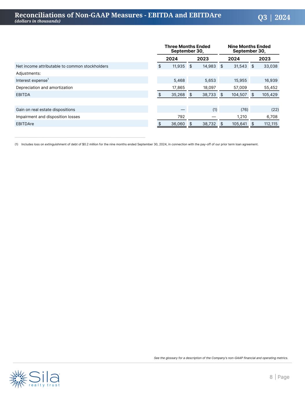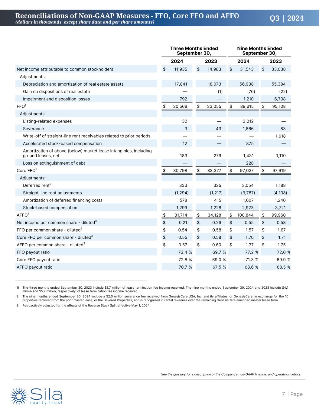 Q3 | 2024 Three Months Ended September 30, Nine Months Ended September 30, 2024 2023 2024 2023 Net income attributable to common stockholders $ 11,935 $ 14,983 $ 31,543 $ 33,038 Adjustments: Depreciation and amortization of real estate assets 17,841 18,073 56,938 55,384 Gain on dispositions of real estate — (1) (76) (22) Impairment and disposition losses 792 — 1,210 6,708 FFO1 $ 30,568 $ 33,055 $ 89,615 $ 95,108 Adjustments: Listing-related expenses 32 — 3,012 — Severance 3 43 1,866 83 Write-off of straight-line rent receivables related to prior periods — — — 1,618 Accelerated stock-based compensation 12 — 875 — Amortization of above (below) market lease intangibles, including ground leases, net 183 279 1,431 1,110 Loss on extinguishment of debt — — 228 — Core FFO1 $ 30,798 $ 33,377 $ 97,027 $ 97,919 Adjustments: Deferred rent2 333 325 3,054 1,188 Straight-line rent adjustments (1,294) (1,217) (3,767) (4,108) Amortization of deferred financing costs 578 415 1,607 1,240 Stock-based compensation 1,299 1,228 2,923 3,721 AFFO1 $ 31,714 $ 34,128 $ 100,844 $ 99,960 Net income per common share - diluted3 $ 0.21 $ 0.26 $ 0.55 $ 0.58 FFO per common share - diluted3 $ 0.54 $ 0.58 $ 1.57 $ 1.67 Core FFO per common share - diluted3 $ 0.55 $ 0.58 $ 1.70 $ 1.71 AFFO per common share - diluted3 $ 0.57 $ 0.60 $ 1.77 $ 1.75 FFO payout ratio 73.4 % 69.7 % 77.2 % 72.0 % Core FFO payout ratio 72.8 % 69.0 % 71.3 % 69.9 % AFFO payout ratio 70.7 % 67.5 % 68.6 % 68.5 % Reconciliations of Non-GAAP Measures - FFO, Core FFO and AFFO (dollars in thousands, except share data and per share amounts) (1) The three months ended September 30, 2023 include $1.7 million of lease termination fee income received. The nine months ended September 30, 2024 and 2023 include $4.1 million and $5.7 million, respectively, of lease termination fee income received. (2) The nine months ended September 30, 2024 include a $2.0 million severance fee received from GenesisCare USA, Inc. and its affiliates, or GenesisCare, in exchange for the 10 properties removed from the prior master lease, or the Severed Properties, and is recognized in rental revenues over the remaining GenesisCare amended master lease term. (3) Retroactively adjusted for the effects of the Reverse Stock Split effective May 1, 2024. | Page7 See the glossary for a description of the Company's non-GAAP financial and operating metrics.