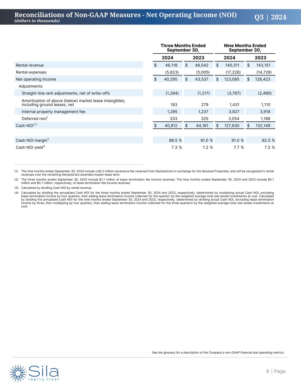Q3 | 2024 Three Months Ended September 30, Nine Months Ended September 30, 2024 2023 2024 2023 Rental revenue $ 46,118 $ 48,542 $ 140,311 $ 143,151 Rental expenses (5,823) (5,005) (17,226) (14,728) Net operating income $ 40,295 $ 43,537 $ 123,085 $ 128,423 Adjustments: Straight-line rent adjustments, net of write-offs (1,294) (1,217) (3,767) (2,490) Amortization of above (below) market lease intangibles, including ground leases, net 183 279 1,431 1,110 Internal property management fee 1,295 1,237 3,827 3,918 Deferred rent1 333 325 3,054 1,188 Cash NOI1,2 $ 40,812 $ 44,161 $ 127,630 $ 132,149 Cash NOI margin3 88.5 % 91.0 % 91.0 % 92.3 % Cash NOI yield4 7.3 % 7.2 % 7.7 % 7.3 % (1) The nine months ended September 30, 2024 include a $2.0 million severance fee received from GenesisCare in exchange for the Severed Properties, and will be recognized in rental revenues over the remaining GenesisCare amended master lease term. (2) The three months ended September 30, 2023 include $1.7 million of lease termination fee income received. The nine months ended September 30, 2024 and 2023 include $4.1 million and $5.7 million, respectively, of lease termination fee income received. (3) Calculated by dividing Cash NOI by rental revenue. (4) Calculated by dividing the annualized Cash NOI for the three months ended September 30, 2024 and 2023, respectively, (determined by multiplying actual Cash NOI, excluding lease termination income by four quarters, then adding lease termination income collected for the quarter) by the weighted average total real estate investments at cost. Calculated by dividing the annualized Cash NOI for the nine months ended September 30, 2024 and 2023, respectively, (determined by dividing actual Cash NOI, excluding lease termination income by three, then multiplying by four quarters, then adding lease termination income collected for the three quarters) by the weighted average total real estate investments at cost. Reconciliations of Non-GAAP Measures - Net Operating Income (NOI) (dollars in thousands) | Page9 See the glossary for a description of the Company's non-GAAP financial and operating metrics.