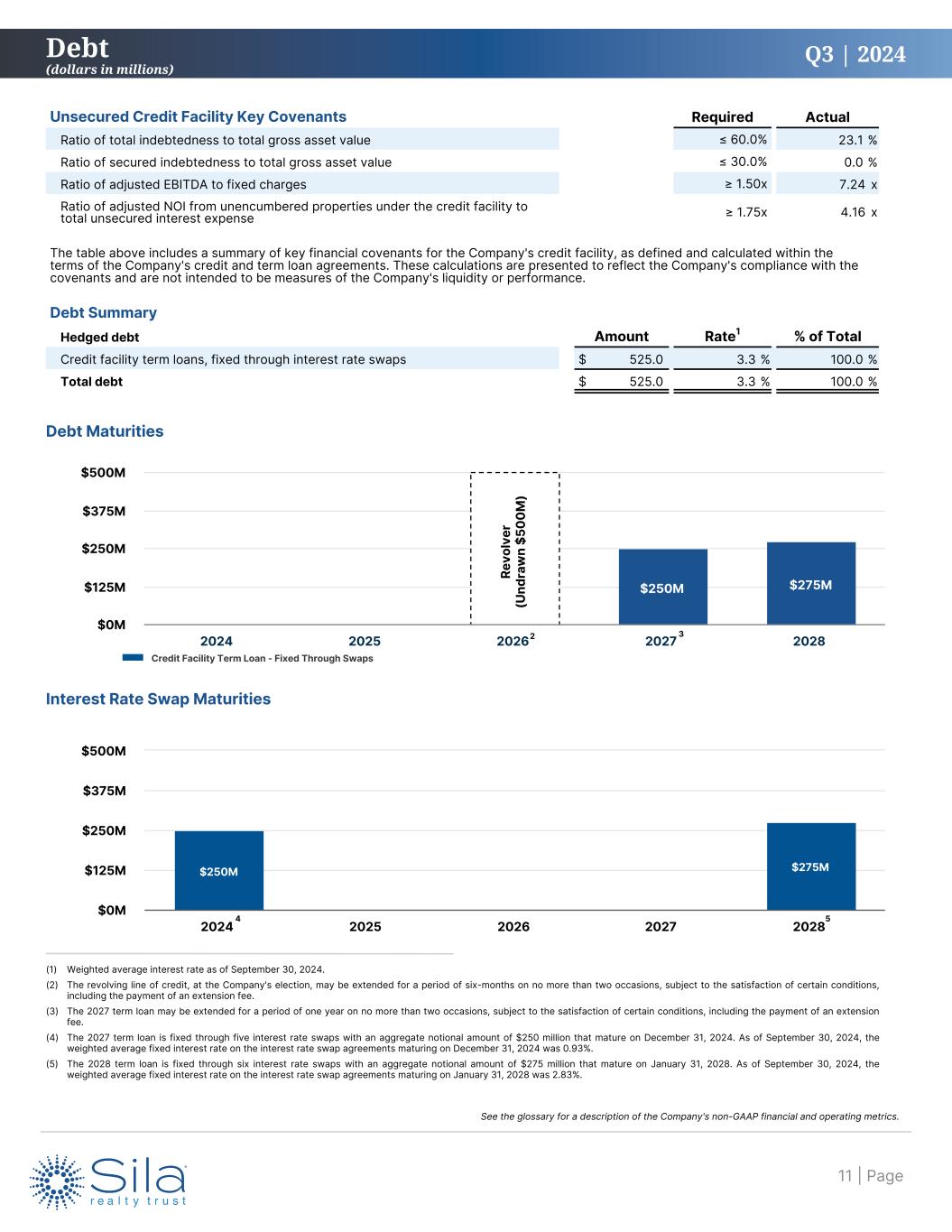 Q3 | 2024 $250M $275M 2024 2025 2026 2027 2028 $0M $125M $250M $375M $500M Unsecured Credit Facility Key Covenants Required Actual Ratio of total indebtedness to total gross asset value ≤ 60.0% 23.1 % Ratio of secured indebtedness to total gross asset value ≤ 30.0% 0.0 % Ratio of adjusted EBITDA to fixed charges ≥ 1.50x 7.24 x Ratio of adjusted NOI from unencumbered properties under the credit facility to total unsecured interest expense ≥ 1.75x 4.16 x The table above includes a summary of key financial covenants for the Company's credit facility, as defined and calculated within the terms of the Company's credit and term loan agreements. These calculations are presented to reflect the Company's compliance with the covenants and are not intended to be measures of the Company's liquidity or performance. Debt Summary Hedged debt Amount Rate1 % of Total Credit facility term loans, fixed through interest rate swaps $ 525.0 3.3 % 100.0 % Total debt $ 525.0 3.3 % 100.0 % Debt Maturities (1) Weighted average interest rate as of September 30, 2024. (2) The revolving line of credit, at the Company's election, may be extended for a period of six-months on no more than two occasions, subject to the satisfaction of certain conditions, including the payment of an extension fee. (3) The 2027 term loan may be extended for a period of one year on no more than two occasions, subject to the satisfaction of certain conditions, including the payment of an extension fee. (4) The 2027 term loan is fixed through five interest rate swaps with an aggregate notional amount of $250 million that mature on December 31, 2024. As of September 30, 2024, the weighted average fixed interest rate on the interest rate swap agreements maturing on December 31, 2024 was 0.93%. (5) The 2028 term loan is fixed through six interest rate swaps with an aggregate notional amount of $275 million that mature on January 31, 2028. As of September 30, 2024, the weighted average fixed interest rate on the interest rate swap agreements maturing on January 31, 2028 was 2.83%. Credit Facility Term Loan - Fixed Through Swaps 2 3 Debt (dollars in millions) Re vo lv er (U nd ra w n $5 00 M ) Interest Rate Swap Maturities $250M $275M 2024 2025 2026 2027 2028 $0M $125M $250M $375M $500M 4 5 | Page11 See the glossary for a description of the Company's non-GAAP financial and operating metrics.