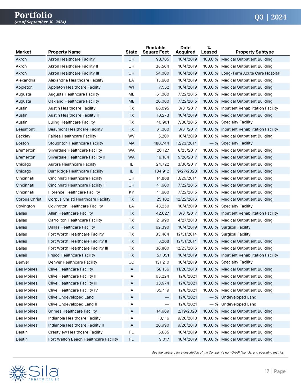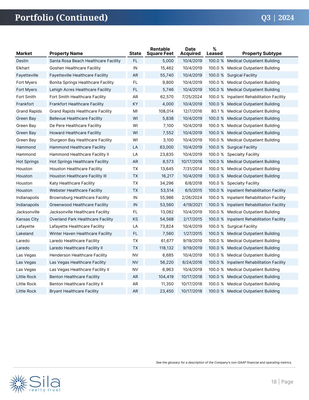 Q3 | 2024 Market Property Name State Rentable Square Feet Date Acquired % Leased Property Subtype Akron Akron Healthcare Facility OH 98,705 10/4/2019 100.0 % Medical Outpatient Building Akron Akron Healthcare Facility II OH 38,564 10/4/2019 100.0 % Medical Outpatient Building Akron Akron Healthcare Facility III OH 54,000 10/4/2019 100.0 % Long-Term Acute Care Hospital Alexandria Alexandria Healthcare Facility LA 15,600 10/4/2019 100.0 % Medical Outpatient Building Appleton Appleton Healthcare Facility WI 7,552 10/4/2019 100.0 % Medical Outpatient Building Augusta Augusta Healthcare Facility ME 51,000 7/22/2015 100.0 % Medical Outpatient Building Augusta Oakland Healthcare Facility ME 20,000 7/22/2015 100.0 % Medical Outpatient Building Austin Austin Healthcare Facility TX 66,095 3/31/2017 100.0 % Inpatient Rehabilitation Facility Austin Austin Healthcare Facility II TX 18,273 10/4/2019 100.0 % Medical Outpatient Building Austin Luling Healthcare Facility TX 40,901 7/30/2015 100.0 % Specialty Facility Beaumont Beaumont Healthcare Facility TX 61,000 3/31/2017 100.0 % Inpatient Rehabilitation Facility Beckley Fairlea Healthcare Facility WV 5,200 10/4/2019 100.0 % Medical Outpatient Building Boston Stoughton Healthcare Facility MA 180,744 12/23/2014 — % Specialty Facility Bremerton Silverdale Healthcare Facility WA 26,127 8/25/2017 100.0 % Medical Outpatient Building Bremerton Silverdale Healthcare Facility II WA 19,184 9/20/2017 100.0 % Medical Outpatient Building Chicago Aurora Healthcare Facility IL 24,722 3/30/2017 100.0 % Medical Outpatient Building Chicago Burr Ridge Healthcare Facility IL 104,912 9/27/2023 100.0 % Medical Outpatient Building Cincinnati Cincinnati Healthcare Facility OH 14,868 10/29/2014 100.0 % Medical Outpatient Building Cincinnati Cincinnati Healthcare Facility III OH 41,600 7/22/2015 100.0 % Medical Outpatient Building Cincinnati Florence Healthcare Facility KY 41,600 7/22/2015 100.0 % Medical Outpatient Building Corpus Christi Corpus Christi Healthcare Facility TX 25,102 12/22/2016 100.0 % Medical Outpatient Building Covington Covington Healthcare Facility LA 43,250 10/4/2019 100.0 % Specialty Facility Dallas Allen Healthcare Facility TX 42,627 3/31/2017 100.0 % Inpatient Rehabilitation Facility Dallas Carrollton Healthcare Facility TX 21,990 4/27/2018 100.0 % Medical Outpatient Building Dallas Dallas Healthcare Facility TX 62,390 10/4/2019 100.0 % Surgical Facility Dallas Fort Worth Healthcare Facility TX 83,464 12/31/2014 100.0 % Surgical Facility Dallas Fort Worth Healthcare Facility II TX 8,268 12/31/2014 100.0 % Medical Outpatient Building Dallas Fort Worth Healthcare Facility III TX 36,800 12/23/2015 100.0 % Medical Outpatient Building Dallas Frisco Healthcare Facility TX 57,051 10/4/2019 100.0 % Inpatient Rehabilitation Facility Denver Denver Healthcare Facility CO 131,210 10/4/2019 100.0 % Specialty Facility Des Moines Clive Healthcare Facility IA 58,156 11/26/2018 100.0 % Medical Outpatient Building Des Moines Clive Healthcare Facility II IA 63,224 12/8/2021 100.0 % Medical Outpatient Building Des Moines Clive Healthcare Facility III IA 33,974 12/8/2021 100.0 % Medical Outpatient Building Des Moines Clive Healthcare Facility IV IA 35,419 12/8/2021 100.0 % Medical Outpatient Building Des Moines Clive Undeveloped Land IA — 12/8/2021 — % Undeveloped Land Des Moines Clive Undeveloped Land II IA — 12/8/2021 — % Undeveloped Land Des Moines Grimes Healthcare Facility IA 14,669 2/19/2020 100.0 % Medical Outpatient Building Des Moines Indianola Healthcare Facility IA 18,116 9/26/2018 100.0 % Medical Outpatient Building Des Moines Indianola Healthcare Facility II IA 20,990 9/26/2018 100.0 % Medical Outpatient Building Destin Crestview Healthcare Facility FL 5,685 10/4/2019 100.0 % Medical Outpatient Building Destin Fort Walton Beach Healthcare Facility FL 9,017 10/4/2019 100.0 % Medical Outpatient Building Portfolio (as of September 30, 2024) | Page17 See the glossary for a description of the Company's non-GAAP financial and operating metrics.