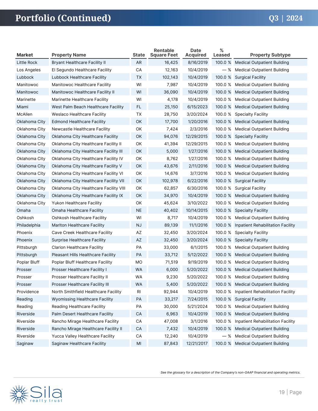 Q3 | 2024 Market Property Name State Rentable Square Feet Date Acquired % Leased Property Subtype Destin Santa Rosa Beach Healthcare Facility FL 5,000 10/4/2019 100.0 % Medical Outpatient Building Elkhart Goshen Healthcare Facility IN 15,462 10/4/2019 100.0 % Medical Outpatient Building Fayetteville Fayetteville Healthcare Facility AR 55,740 10/4/2019 100.0 % Surgical Facility Fort Myers Bonita Springs Healthcare Facility FL 9,800 10/4/2019 100.0 % Medical Outpatient Building Fort Myers Lehigh Acres Healthcare Facility FL 5,746 10/4/2019 100.0 % Medical Outpatient Building Fort Smith Fort Smith Healthcare Facility AR 62,570 7/25/2024 100.0 % Inpatient Rehabilitation Facility Frankfort Frankfort Healthcare Facility KY 4,000 10/4/2019 100.0 % Medical Outpatient Building Grand Rapids Grand Rapids Healthcare Facility MI 108,014 12/7/2016 80.1 % Medical Outpatient Building Green Bay Bellevue Healthcare Facility WI 5,838 10/4/2019 100.0 % Medical Outpatient Building Green Bay De Pere Healthcare Facility WI 7,100 10/4/2019 100.0 % Medical Outpatient Building Green Bay Howard Healthcare Facility WI 7,552 10/4/2019 100.0 % Medical Outpatient Building Green Bay Sturgeon Bay Healthcare Facility WI 3,100 10/4/2019 100.0 % Medical Outpatient Building Hammond Hammond Healthcare Facility LA 63,000 10/4/2019 100.0 % Surgical Facility Hammond Hammond Healthcare Facility II LA 23,835 10/4/2019 100.0 % Specialty Facility Hot Springs Hot Springs Healthcare Facility AR 8,573 10/17/2018 100.0 % Medical Outpatient Building Houston Houston Healthcare Facility TX 13,645 7/31/2014 100.0 % Medical Outpatient Building Houston Houston Healthcare Facility III TX 16,217 10/4/2019 100.0 % Medical Outpatient Building Houston Katy Healthcare Facility TX 34,296 6/8/2018 100.0 % Specialty Facility Houston Webster Healthcare Facility TX 53,514 6/5/2015 100.0 % Inpatient Rehabilitation Facility Indianapolis Brownsburg Healthcare Facility IN 55,986 2/26/2024 100.0 % Inpatient Rehabilitation Facility Indianapolis Greenwood Healthcare Facility IN 53,560 4/19/2021 100.0 % Inpatient Rehabilitation Facility Jacksonville Jacksonville Healthcare Facility FL 13,082 10/4/2019 100.0 % Medical Outpatient Building Kansas City Overland Park Healthcare Facility KS 54,568 2/17/2015 100.0 % Inpatient Rehabilitation Facility Lafayette Lafayette Healthcare Facility LA 73,824 10/4/2019 100.0 % Surgical Facility Lakeland Winter Haven Healthcare Facility FL 7,560 1/27/2015 100.0 % Medical Outpatient Building Laredo Laredo Healthcare Facility TX 61,677 9/19/2019 100.0 % Medical Outpatient Building Laredo Laredo Healthcare Facility II TX 118,132 9/19/2019 100.0 % Medical Outpatient Building Las Vegas Henderson Healthcare Facility NV 6,685 10/4/2019 100.0 % Medical Outpatient Building Las Vegas Las Vegas Healthcare Facility NV 56,220 6/24/2016 100.0 % Inpatient Rehabilitation Facility Las Vegas Las Vegas Healthcare Facility II NV 6,963 10/4/2019 100.0 % Medical Outpatient Building Little Rock Benton Healthcare Facility AR 104,419 10/17/2018 100.0 % Medical Outpatient Building Little Rock Benton Healthcare Facility II AR 11,350 10/17/2018 100.0 % Medical Outpatient Building Little Rock Bryant Healthcare Facility AR 23,450 10/17/2018 100.0 % Medical Outpatient Building Portfolio (Continued) | Page18 See the glossary for a description of the Company's non-GAAP financial and operating metrics.