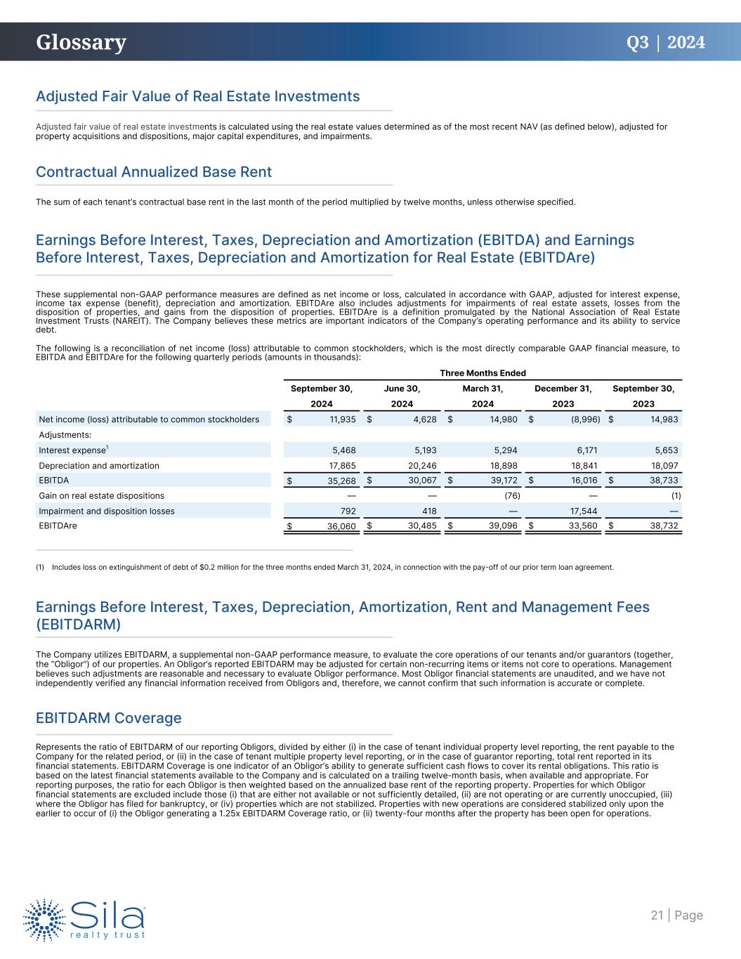 Q3 | 2024 Contractual Annualized Base Rent The sum of each tenant’s contractual base rent in the last month of the period multiplied by twelve months, unless otherwise specified. Earnings Before Interest, Taxes, Depreciation and Amortization (EBITDA) and Earnings Before Interest, Taxes, Depreciation and Amortization for Real Estate (EBITDAre) These supplemental non-GAAP performance measures are defined as net income or loss, calculated in accordance with GAAP, adjusted for interest expense, income tax expense (benefit), depreciation and amortization. EBITDAre also includes adjustments for impairments of real estate assets, losses from the disposition of properties, and gains from the disposition of properties. EBITDAre is a definition promulgated by the National Association of Real Estate Investment Trusts (NAREIT). The Company believes these metrics are important indicators of the Company’s operating performance and its ability to service debt. The following is a reconciliation of net income (loss) attributable to common stockholders, which is the most directly comparable GAAP financial measure, to EBITDA and EBITDAre for the following quarterly periods (amounts in thousands): Adjusted Fair Value of Real Estate Investments Adjusted fair value of real estate investments is calculated using the real estate values determined as of the most recent NAV (as defined below), adjusted for property acquisitions and dispositions, major capital expenditures, and impairments. Three Months Ended September 30, June 30, March 31, December 31, September 30, 2024 2024 2024 2023 2023 Net income (loss) attributable to common stockholders $ 11,935 $ 4,628 $ 14,980 $ (8,996) $ 14,983 Adjustments: Interest expense1 5,468 5,193 5,294 6,171 5,653 Depreciation and amortization 17,865 20,246 18,898 18,841 18,097 EBITDA $ 35,268 $ 30,067 $ 39,172 $ 16,016 $ 38,733 Gain on real estate dispositions — — (76) — (1) Impairment and disposition losses 792 418 — 17,544 — EBITDAre $ 36,060 $ 30,485 $ 39,096 $ 33,560 $ 38,732 Glossary Earnings Before Interest, Taxes, Depreciation, Amortization, Rent and Management Fees (EBITDARM) EBITDARM Coverage The Company utilizes EBITDARM, a supplemental non-GAAP performance measure, to evaluate the core operations of our tenants and/or guarantors (together, the “Obligor”) of our properties. An Obligor’s reported EBITDARM may be adjusted for certain non-recurring items or items not core to operations. Management believes such adjustments are reasonable and necessary to evaluate Obligor performance. Most Obligor financial statements are unaudited, and we have not independently verified any financial information received from Obligors and, therefore, we cannot confirm that such information is accurate or complete. Represents the ratio of EBITDARM of our reporting Obligors, divided by either (i) in the case of tenant individual property level reporting, the rent payable to the Company for the related period, or (ii) in the case of tenant multiple property level reporting, or in the case of guarantor reporting, total rent reported in its financial statements. EBITDARM Coverage is one indicator of an Obligor’s ability to generate sufficient cash flows to cover its rental obligations. This ratio is based on the latest financial statements available to the Company and is calculated on a trailing twelve-month basis, when available and appropriate. For reporting purposes, the ratio for each Obligor is then weighted based on the annualized base rent of the reporting property. Properties for which Obligor financial statements are excluded include those (i) that are either not available or not sufficiently detailed, (ii) are not operating or are currently unoccupied, (iii) where the Obligor has filed for bankruptcy, or (iv) properties which are not stabilized. Properties with new operations are considered stabilized only upon the earlier to occur of (i) the Obligor generating a 1.25x EBITDARM Coverage ratio, or (ii) twenty-four months after the property has been open for operations. (1) Includes loss on extinguishment of debt of $0.2 million for the three months ended March 31, 2024, in connection with the pay-off of our prior term loan agreement. | Page21