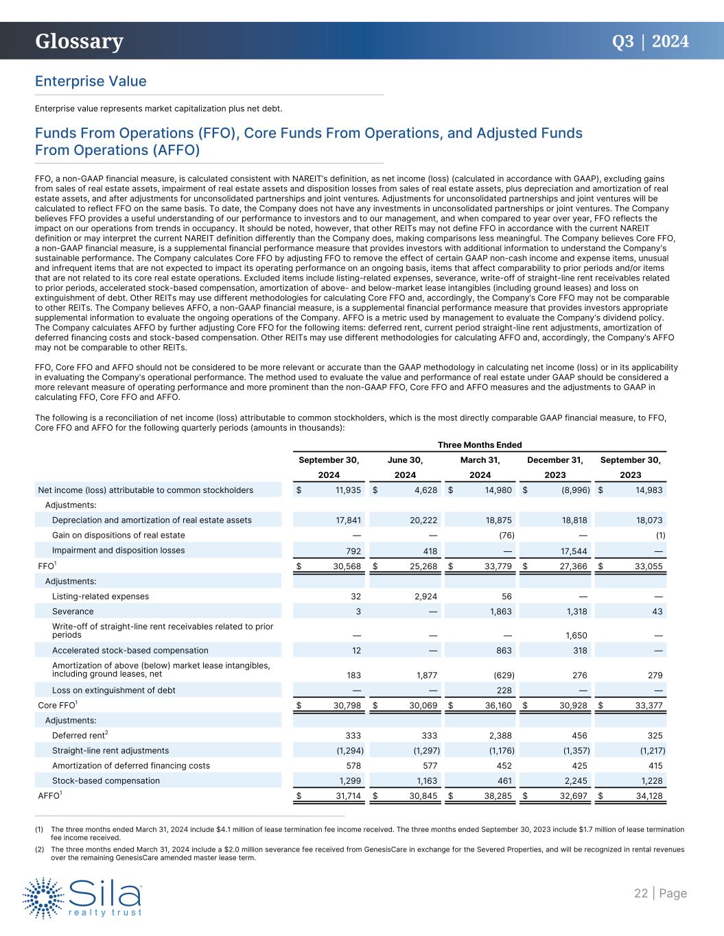 Q3 | 2024 Three Months Ended September 30, June 30, March 31, December 31, September 30, 2024 2024 2024 2023 2023 Net income (loss) attributable to common stockholders $ 11,935 $ 4,628 $ 14,980 $ (8,996) $ 14,983 Adjustments: Depreciation and amortization of real estate assets 17,841 20,222 18,875 18,818 18,073 Gain on dispositions of real estate — — (76) — (1) Impairment and disposition losses 792 418 — 17,544 — FFO1 $ 30,568 $ 25,268 $ 33,779 $ 27,366 $ 33,055 Adjustments: Listing-related expenses 32 2,924 56 — — Severance 3 — 1,863 1,318 43 Write-off of straight-line rent receivables related to prior periods — — — 1,650 — Accelerated stock-based compensation 12 — 863 318 — Amortization of above (below) market lease intangibles, including ground leases, net 183 1,877 (629) 276 279 Loss on extinguishment of debt — — 228 — — Core FFO1 $ 30,798 $ 30,069 $ 36,160 $ 30,928 $ 33,377 Adjustments: Deferred rent2 333 333 2,388 456 325 Straight-line rent adjustments (1,294) (1,297) (1,176) (1,357) (1,217) Amortization of deferred financing costs 578 577 452 425 415 Stock-based compensation 1,299 1,163 461 2,245 1,228 AFFO1 $ 31,714 $ 30,845 $ 38,285 $ 32,697 $ 34,128 The following is a reconciliation of net income (loss) attributable to common stockholders, which is the most directly comparable GAAP financial measure, to FFO, Core FFO and AFFO for the following quarterly periods (amounts in thousands): Funds From Operations (FFO), Core Funds From Operations, and Adjusted Funds From Operations (AFFO) FFO, a non-GAAP financial measure, is calculated consistent with NAREIT’s definition, as net income (loss) (calculated in accordance with GAAP), excluding gains from sales of real estate assets, impairment of real estate assets and disposition losses from sales of real estate assets, plus depreciation and amortization of real estate assets, and after adjustments for unconsolidated partnerships and joint ventures. Adjustments for unconsolidated partnerships and joint ventures will be calculated to reflect FFO on the same basis. To date, the Company does not have any investments in unconsolidated partnerships or joint ventures. The Company believes FFO provides a useful understanding of our performance to investors and to our management, and when compared to year over year, FFO reflects the impact on our operations from trends in occupancy. It should be noted, however, that other REITs may not define FFO in accordance with the current NAREIT definition or may interpret the current NAREIT definition differently than the Company does, making comparisons less meaningful. The Company believes Core FFO, a non-GAAP financial measure, is a supplemental financial performance measure that provides investors with additional information to understand the Company's sustainable performance. The Company calculates Core FFO by adjusting FFO to remove the effect of certain GAAP non-cash income and expense items, unusual and infrequent items that are not expected to impact its operating performance on an ongoing basis, items that affect comparability to prior periods and/or items that are not related to its core real estate operations. Excluded items include listing-related expenses, severance, write-off of straight-line rent receivables related to prior periods, accelerated stock-based compensation, amortization of above- and below-market lease intangibles (including ground leases) and loss on extinguishment of debt. Other REITs may use different methodologies for calculating Core FFO and, accordingly, the Company’s Core FFO may not be comparable to other REITs. The Company believes AFFO, a non-GAAP financial measure, is a supplemental financial performance measure that provides investors appropriate supplemental information to evaluate the ongoing operations of the Company. AFFO is a metric used by management to evaluate the Company's dividend policy. The Company calculates AFFO by further adjusting Core FFO for the following items: deferred rent, current period straight-line rent adjustments, amortization of deferred financing costs and stock-based compensation. Other REITs may use different methodologies for calculating AFFO and, accordingly, the Company’s AFFO may not be comparable to other REITs. FFO, Core FFO and AFFO should not be considered to be more relevant or accurate than the GAAP methodology in calculating net income (loss) or in its applicability in evaluating the Company's operational performance. The method used to evaluate the value and performance of real estate under GAAP should be considered a more relevant measure of operating performance and more prominent than the non-GAAP FFO, Core FFO and AFFO measures and the adjustments to GAAP in calculating FFO, Core FFO and AFFO. Glossary Enterprise Value Enterprise value represents market capitalization plus net debt. (1) The three months ended March 31, 2024 include $4.1 million of lease termination fee income received. The three months ended September 30, 2023 include $1.7 million of lease termination fee income received. (2) The three months ended March 31, 2024 include a $2.0 million severance fee received from GenesisCare in exchange for the Severed Properties, and will be recognized in rental revenues over the remaining GenesisCare amended master lease term. | Page22