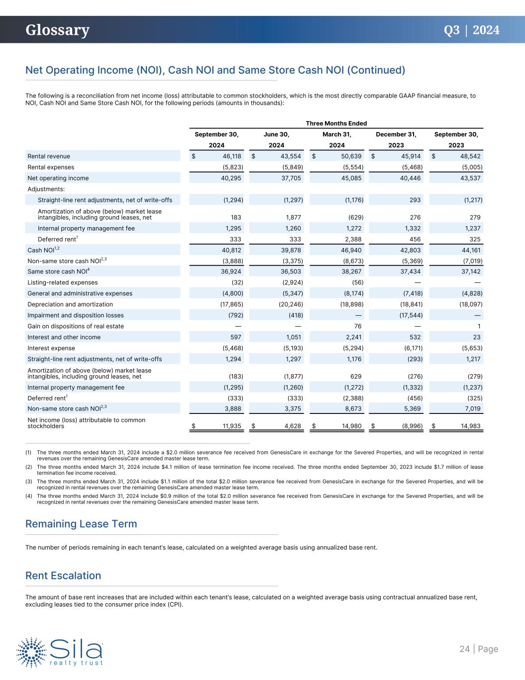 Q3 | 2024 The following is a reconciliation from net income (loss) attributable to common stockholders, which is the most directly comparable GAAP financial measure, to NOI, Cash NOI and Same Store Cash NOI, for the following periods (amounts in thousands): Net Operating Income (NOI), Cash NOI and Same Store Cash NOI (Continued) Three Months Ended September 30, June 30, March 31, December 31, September 30, 2024 2024 2024 2023 2023 Rental revenue $ 46,118 $ 43,554 $ 50,639 $ 45,914 $ 48,542 Rental expenses (5,823) (5,849) (5,554) (5,468) (5,005) Net operating income 40,295 37,705 45,085 40,446 43,537 Adjustments: Straight-line rent adjustments, net of write-offs (1,294) (1,297) (1,176) 293 (1,217) Amortization of above (below) market lease intangibles, including ground leases, net 183 1,877 (629) 276 279 Internal property management fee 1,295 1,260 1,272 1,332 1,237 Deferred rent1 333 333 2,388 456 325 Cash NOI1,2 40,812 39,878 46,940 42,803 44,161 Non-same store cash NOI2,3 (3,888) (3,375) (8,673) (5,369) (7,019) Same store cash NOI4 36,924 36,503 38,267 37,434 37,142 Listing-related expenses (32) (2,924) (56) — — General and administrative expenses (4,800) (5,347) (8,174) (7,418) (4,828) Depreciation and amortization (17,865) (20,246) (18,898) (18,841) (18,097) Impairment and disposition losses (792) (418) — (17,544) — Gain on dispositions of real estate — — 76 — 1 Interest and other income 597 1,051 2,241 532 23 Interest expense (5,468) (5,193) (5,294) (6,171) (5,653) Straight-line rent adjustments, net of write-offs 1,294 1,297 1,176 (293) 1,217 Amortization of above (below) market lease intangibles, including ground leases, net (183) (1,877) 629 (276) (279) Internal property management fee (1,295) (1,260) (1,272) (1,332) (1,237) Deferred rent1 (333) (333) (2,388) (456) (325) Non-same store cash NOI2,3 3,888 3,375 8,673 5,369 7,019 Net income (loss) attributable to common stockholders $ 11,935 $ 4,628 $ 14,980 $ (8,996) $ 14,983 Glossary Remaining Lease Term The number of periods remaining in each tenant’s lease, calculated on a weighted average basis using annualized base rent. Rent Escalation The amount of base rent increases that are included within each tenant’s lease, calculated on a weighted average basis using contractual annualized base rent, excluding leases tied to the consumer price index (CPI). (1) The three months ended March 31, 2024 include a $2.0 million severance fee received from GenesisCare in exchange for the Severed Properties, and will be recognized in rental revenues over the remaining GenesisCare amended master lease term. (2) The three months ended March 31, 2024 include $4.1 million of lease termination fee income received. The three months ended September 30, 2023 include $1.7 million of lease termination fee income received. (3) The three months ended March 31, 2024 include $1.1 million of the total $2.0 million severance fee received from GenesisCare in exchange for the Severed Properties, and will be recognized in rental revenues over the remaining GenesisCare amended master lease term. (4) The three months ended March 31, 2024 include $0.9 million of the total $2.0 million severance fee received from GenesisCare in exchange for the Severed Properties, and will be recognized in rental revenues over the remaining GenesisCare amended master lease term. | Page24
