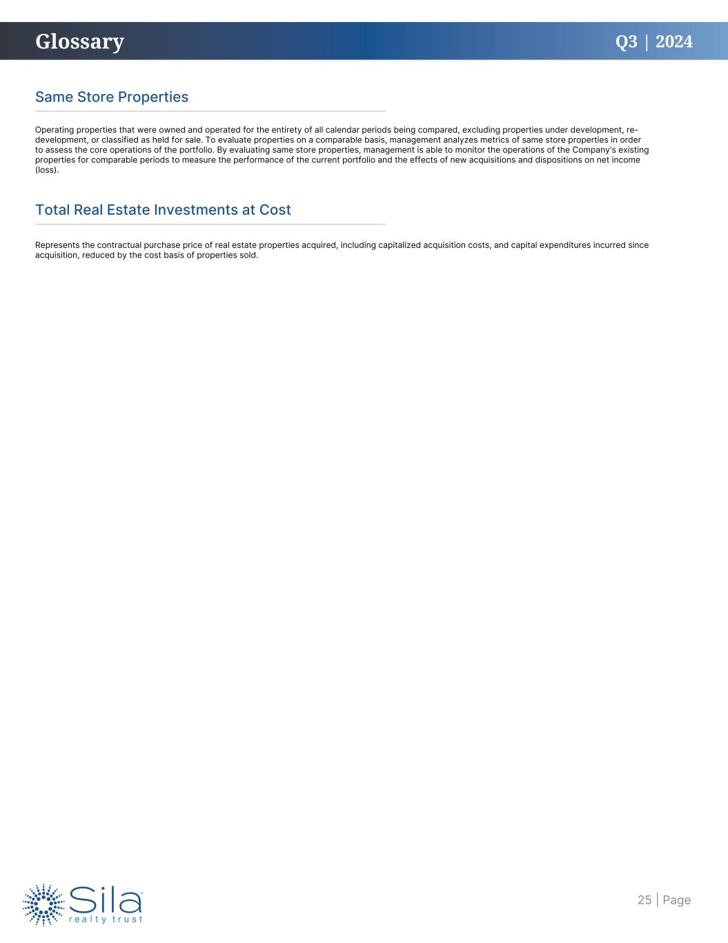Q3 | 2024 Total Real Estate Investments at Cost Represents the contractual purchase price of real estate properties acquired, including capitalized acquisition costs, and capital expenditures incurred since acquisition, reduced by the cost basis of properties sold. Same Store Properties Operating properties that were owned and operated for the entirety of all calendar periods being compared, excluding properties under development, re- development, or classified as held for sale. To evaluate properties on a comparable basis, management analyzes metrics of same store properties in order to assess the core operations of the portfolio. By evaluating same store properties, management is able to monitor the operations of the Company's existing properties for comparable periods to measure the performance of the current portfolio and the effects of new acquisitions and dispositions on net income (loss). Glossary | Page25