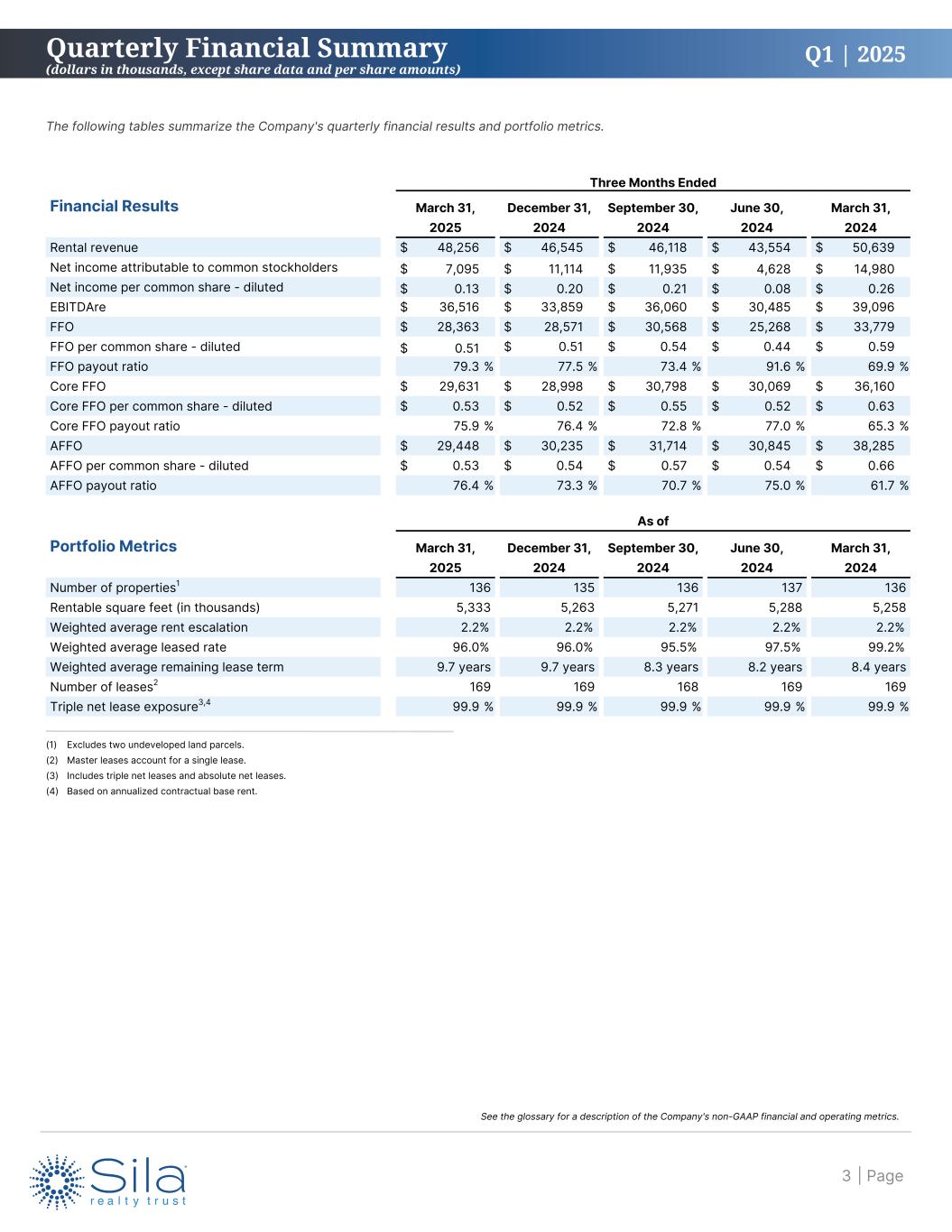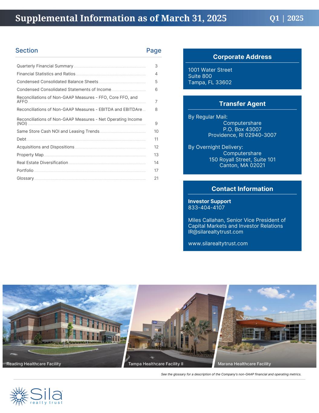 Q1 | 2025 Section Page Corporate Address 1001 Water Street Suite 800 Tampa, FL 33602 Transfer Agent By Regular Mail: Computershare P.O. Box 43007 Providence, RI 02940-3007 By Overnight Delivery: Computershare 150 Royall Street, Suite 101 Canton, MA 02021 Contact Information Investor Support 833-404-4107 Miles Callahan, Senior Vice President of Capital Markets and Investor Relations IR@silarealtytrust.com www.silarealtytrust.com Quarterly Financial Summary ..................................................................... 3 Financial Statistics and Ratios ................................................................... 4 Condensed Consolidated Balance Sheets ............................................. 5 Condensed Consolidated Statements of Income ................................. 6 Reconciliations of Non-GAAP Measures - FFO, Core FFO, and AFFO ................................................................................................................. 7 Reconciliations of Non-GAAP Measures - EBITDA and EBITDAre ... 8 Reconciliations of Non-GAAP Measures - Net Operating Income (NOI) ................................................................................................................. 9 Same Store Cash NOI and Leasing Trends ............................................ 10 Debt .................................................................................................................. 11 Acquisitions and Dispositions .................................................................... 12 Property Map .................................................................................................. 13 Real Estate Diversification .......................................................................... 14 Portfolio ........................................................................................................... 17 Glossary ........................................................................................................... 21 Supplemental Information as of March 31, 2025 See the glossary for a description of the Company's non-GAAP financial and operating metrics.