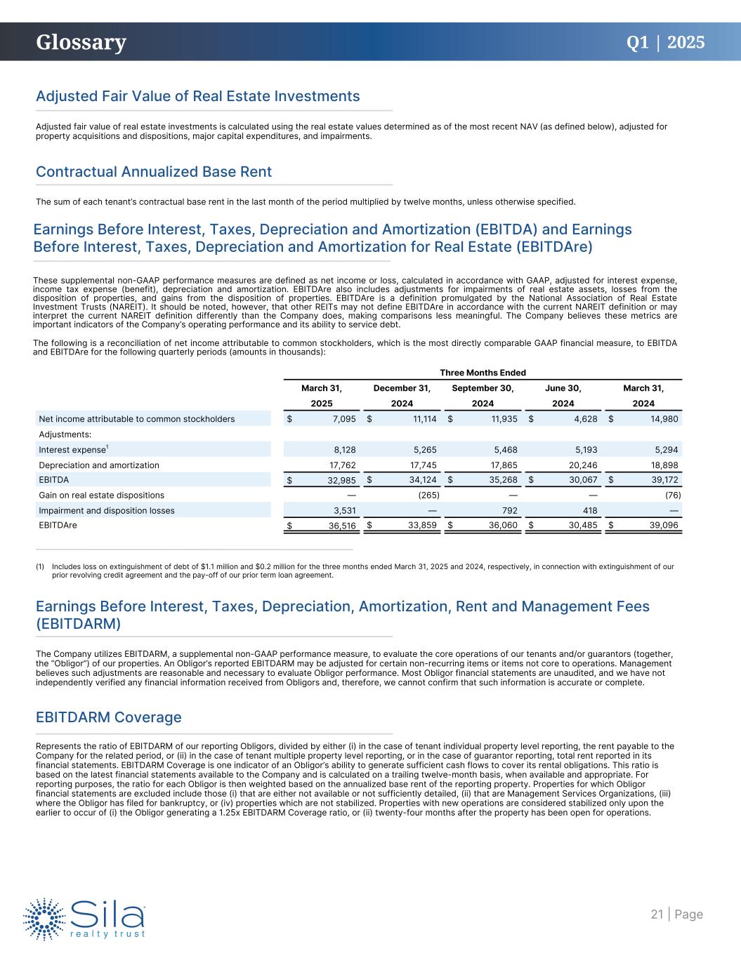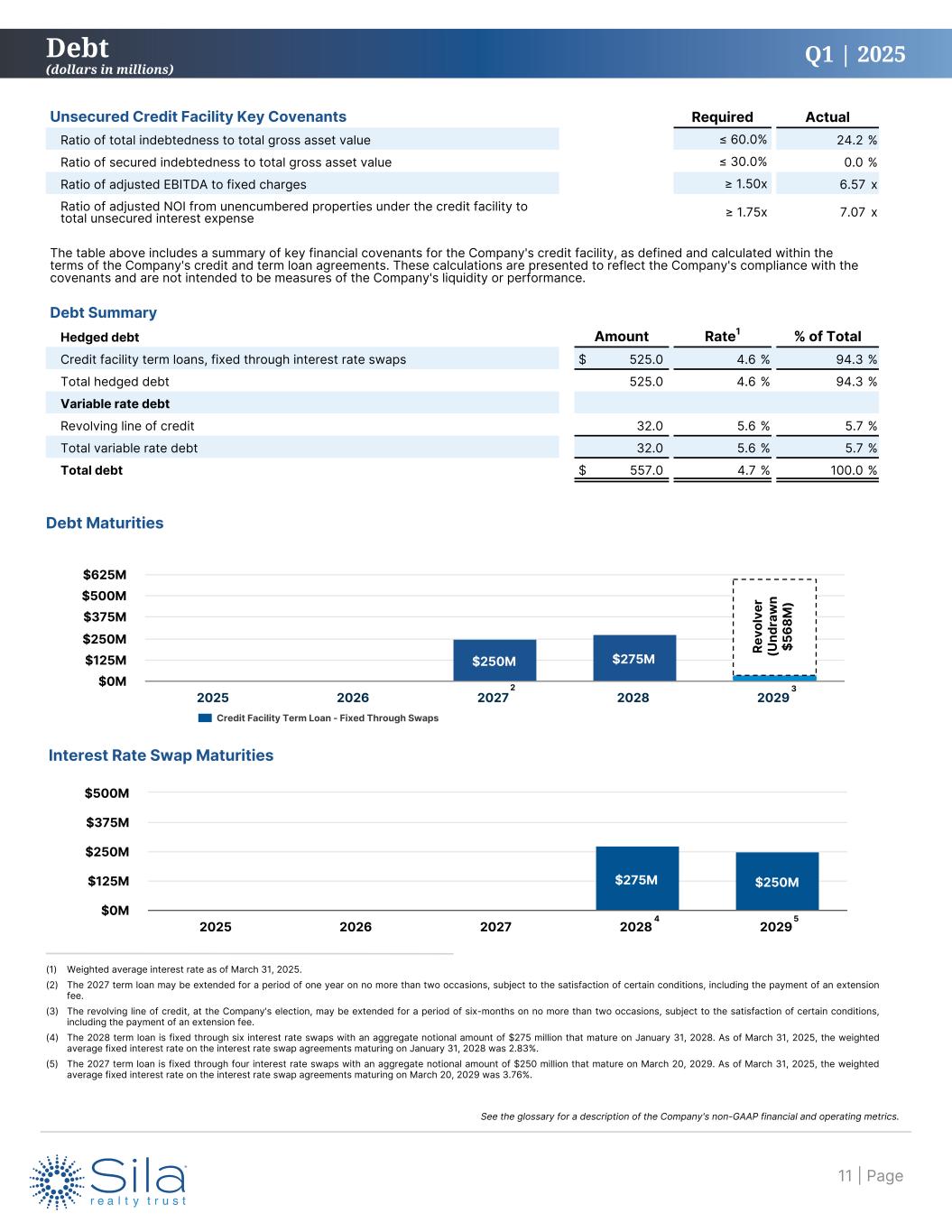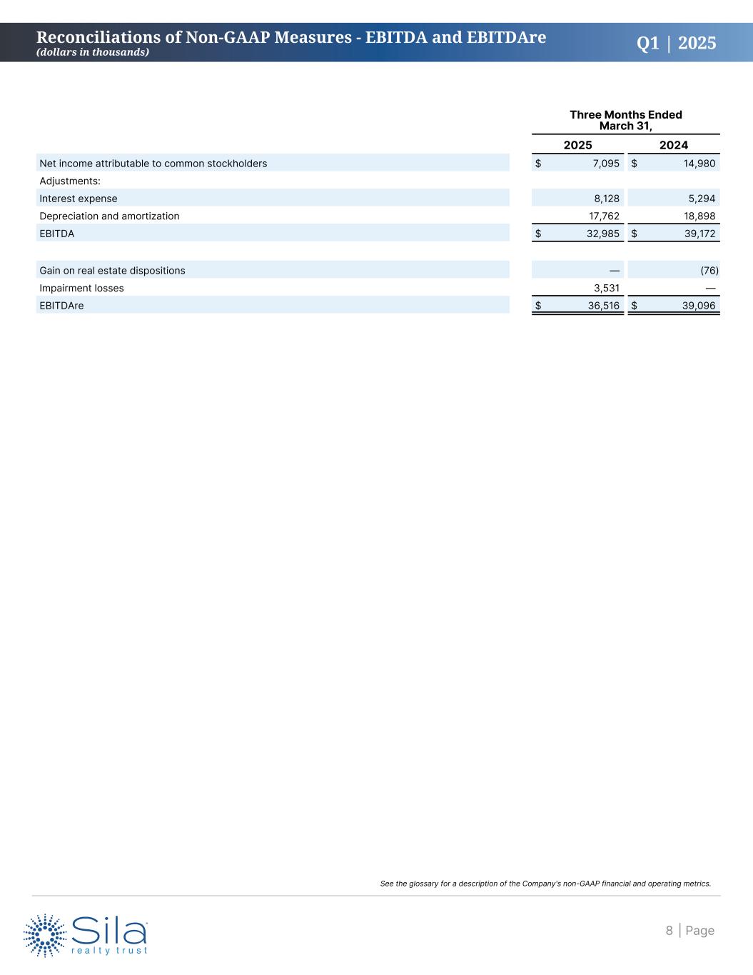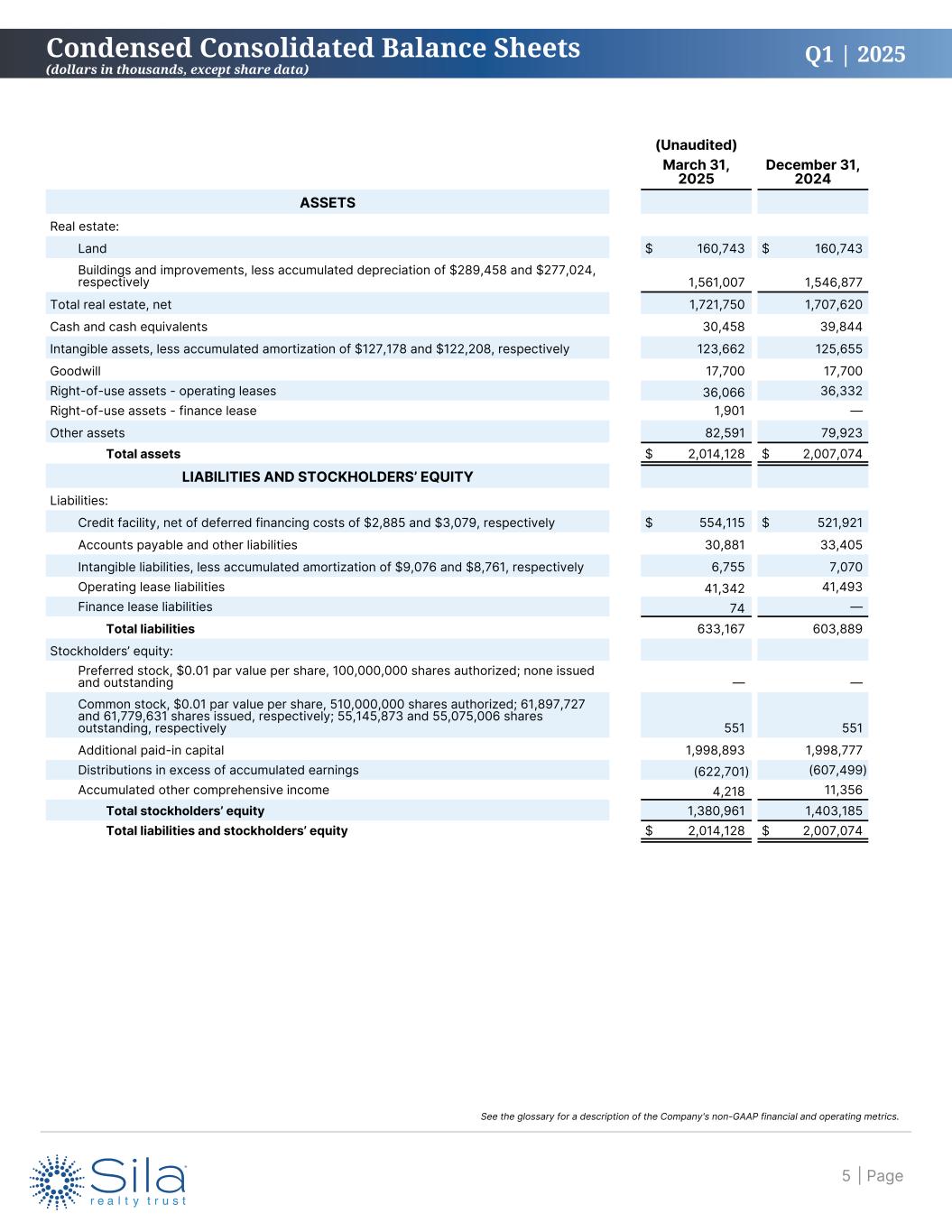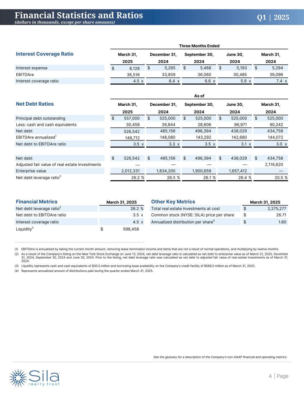 Q1 | 2025 Three Months Ended Interest Coverage Ratio March 31, December 31, September 30, June 30, March 31, 2025 2024 2024 2024 2024 Interest expense $ 8,128 $ 5,265 $ 5,468 $ 5,193 $ 5,294 EBITDAre 36,516 33,859 36,060 30,485 39,096 Interest coverage ratio 4.5 x 6.4 x 6.6 x 5.9 x 7.4 x As of Net Debt Ratios March 31, December 31, September 30, June 30, March 31, 2025 2024 2024 2024 2024 Principal debt outstanding $ 557,000 $ 525,000 $ 525,000 $ 525,000 $ 525,000 Less: cash and cash equivalents 30,458 39,844 28,606 86,971 90,242 Net debt 526,542 485,156 496,394 438,029 434,758 EBITDAre annualized1 149,712 148,080 143,292 142,680 144,072 Net debt to EBITDAre ratio 3.5 x 3.3 x 3.5 x 3.1 x 3.0 x Net debt $ 526,542 $ 485,156 $ 496,394 $ 438,029 $ 434,758 Adjusted fair value of real estate investments — — — — 2,119,620 Enterprise value 2,012,331 1,834,200 1,900,659 1,657,412 — Net debt leverage ratio2 26.2 % 26.5 % 26.1 % 26.4 % 20.5 % Financial Metrics March 31, 2025 Other Key Metrics March 31, 2025 Net debt leverage ratio2 26.2 % Total real estate investments at cost $ 2,275,277 Net debt to EBITDAre ratio 3.5 x Common stock (NYSE: SILA) price per share $ 26.71 Interest coverage ratio 4.5 x Annualized distribution per share4 $ 1.60 Liquidity3 $ 598,458 (1) EBITDAre is annualized by taking the current month amount, removing lease termination income and items that are not a result of normal operations, and multiplying by twelve months. (2) As a result of the Company's listing on the New York Stock Exchange on June 13, 2024, net debt leverage ratio is calculated as net debt to enterprise value as of March 31, 2025, December 31, 2024, September 30, 2024 and June 30, 2024. Prior to the listing, net debt leverage ratio was calculated as net debt to adjusted fair value of real estate investments as of March 31, 2024. (3) Liquidity represents cash and cash equivalents of $30.5 million and borrowing base availability on the Company’s credit facility of $568.0 million as of March 31, 2025. (4) Represents annualized amount of distributions paid during the quarter ended March 31, 2025. Financial Statistics and Ratios (dollars in thousands, except per share amounts) | Page4 See the glossary for a description of the Company's non-GAAP financial and operating metrics.