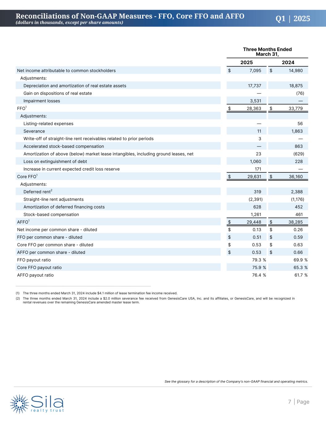 Q1 | 2025 Three Months Ended March 31, 2025 2024 Net income attributable to common stockholders $ 7,095 $ 14,980 Adjustments: Depreciation and amortization of real estate assets 17,737 18,875 Gain on dispositions of real estate — (76) Impairment losses 3,531 — FFO1 $ 28,363 $ 33,779 Adjustments: Listing-related expenses — 56 Severance 11 1,863 Write-off of straight-line rent receivables related to prior periods 3 — Accelerated stock-based compensation — 863 Amortization of above (below) market lease intangibles, including ground leases, net 23 (629) Loss on extinguishment of debt 1,060 228 Increase in current expected credit loss reserve 171 — Core FFO1 $ 29,631 $ 36,160 Adjustments: Deferred rent2 319 2,388 Straight-line rent adjustments (2,391) (1,176) Amortization of deferred financing costs 628 452 Stock-based compensation 1,261 461 AFFO1 $ 29,448 $ 38,285 Net income per common share - diluted $ 0.13 $ 0.26 FFO per common share - diluted $ 0.51 $ 0.59 Core FFO per common share - diluted $ 0.53 $ 0.63 AFFO per common share - diluted $ 0.53 $ 0.66 FFO payout ratio 79.3 % 69.9 % Core FFO payout ratio 75.9 % 65.3 % AFFO payout ratio 76.4 % 61.7 % Reconciliations of Non-GAAP Measures - FFO, Core FFO and AFFO (dollars in thousands, except per share amounts) (1) The three months ended March 31, 2024 include $4.1 million of lease termination fee income received. (2) The three months ended March 31, 2024 include a $2.0 million severance fee received from GenesisCare USA, Inc. and its affiliates, or GenesisCare, and will be recognized in rental revenues over the remaining GenesisCare amended master lease term. | Page7 See the glossary for a description of the Company's non-GAAP financial and operating metrics.