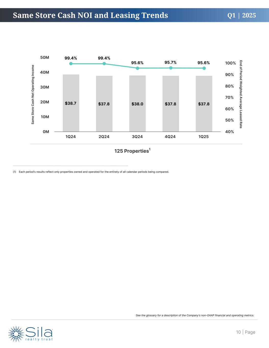 Q1 | 2025 This presentation contains certain financial information not derived in accordance with the United States generally accepted accounting principles (GAAP). These items include earnings before interest, income taxes, depreciation and amortization (EBITDA), EBITDA for real estate (EBITDAre), earnings before interest, income taxes, depreciation, amortization, rent and management fees (EBITDARM), funds from operations (FFO), core funds from operations (Core FFO), adjusted funds from operations (AFFO), net debt, net operating income (NOI), cash NOI, and same store cash NOI, as well as ratios derived from the foregoing. These measures (and the methodologies used to derive them) may not be comparable to those used by other companies. Refer to the glossary for a detailed explanation of these terms and reconciliations to the most directly comparable GAAP measures, as well as others appearing in the supplement. Management considers each item an important supplemental measure of operating and financial performance and believes they are frequently used by interested parties in the evaluation of real estate investment trusts. These measures should not be considered as alternatives, or superior measures, to net income or loss as an indicator of the Company's performance and should be considered only as a supplement to net income or loss and cash flows from operating, investing or financing activities as measures of profitability and/or liquidity, computed in accordance with GAAP. Certain statements contained herein, other than historical fact, may be considered “forward-looking statements” within the meaning of Section 27A of the Securities Act of 1933, as amended, and Section 21E of the Securities Exchange Act of 1934, as amended, and are intended to be covered by the safe harbor provided by the same. These statements are based on management’s current expectations and beliefs and are subject to a number of trends and uncertainties. No forward-looking statement is intended to, nor shall it, serve as a guarantee of future performance. You can identify the forward-looking statements by the use of words such as “anticipate,” “believe,” “continue,” “could,” “estimate,” “expect,” “intend,” “may,” “outlook,” “plan,” “potential,” “predict,” “project,” “seek,” “should,” “will” and other similar terms and phrases, including references to expected lease expiration and annualized base rent trends and extensions of the Company's term loan and revolving line of credit. Forward-looking statements are subject to various risks and uncertainties and factors that could cause actual results to differ materially from the expectations of Sila Realty Trust, Inc. (the "Company"), and investors should not rely on forward-looking statements since they involve known and unknown risks, uncertainties and other factors, which are, in some cases, beyond the Company’s control and could materially affect the Company’s results of operations, financial condition, cash flows, performance or future achievements or events, including those described under the section entitled Part I, Item 1A. “Risk Factors” of the Company's 2024 Annual Report on Form 10-K, as filed with the SEC on March 3, 2025. The Company undertakes no obligation to publicly update or revise any forward-looking statement, whether as a result of new information, future events, or otherwise, except as required by law. Forward Looking Statements Non-GAAP Measures Unaudited Financial Information Disclosures All quarterly information presented in this supplement is unaudited and should be read in conjunction with the Company’s audited consolidated financial statements (and the notes thereto) included in the Annual Report on Form 10-K for the year ended December 31, 2024, as filed with the SEC on March 3, 2025. See the glossary for a description of the Company's non-GAAP financial and operating metrics.
