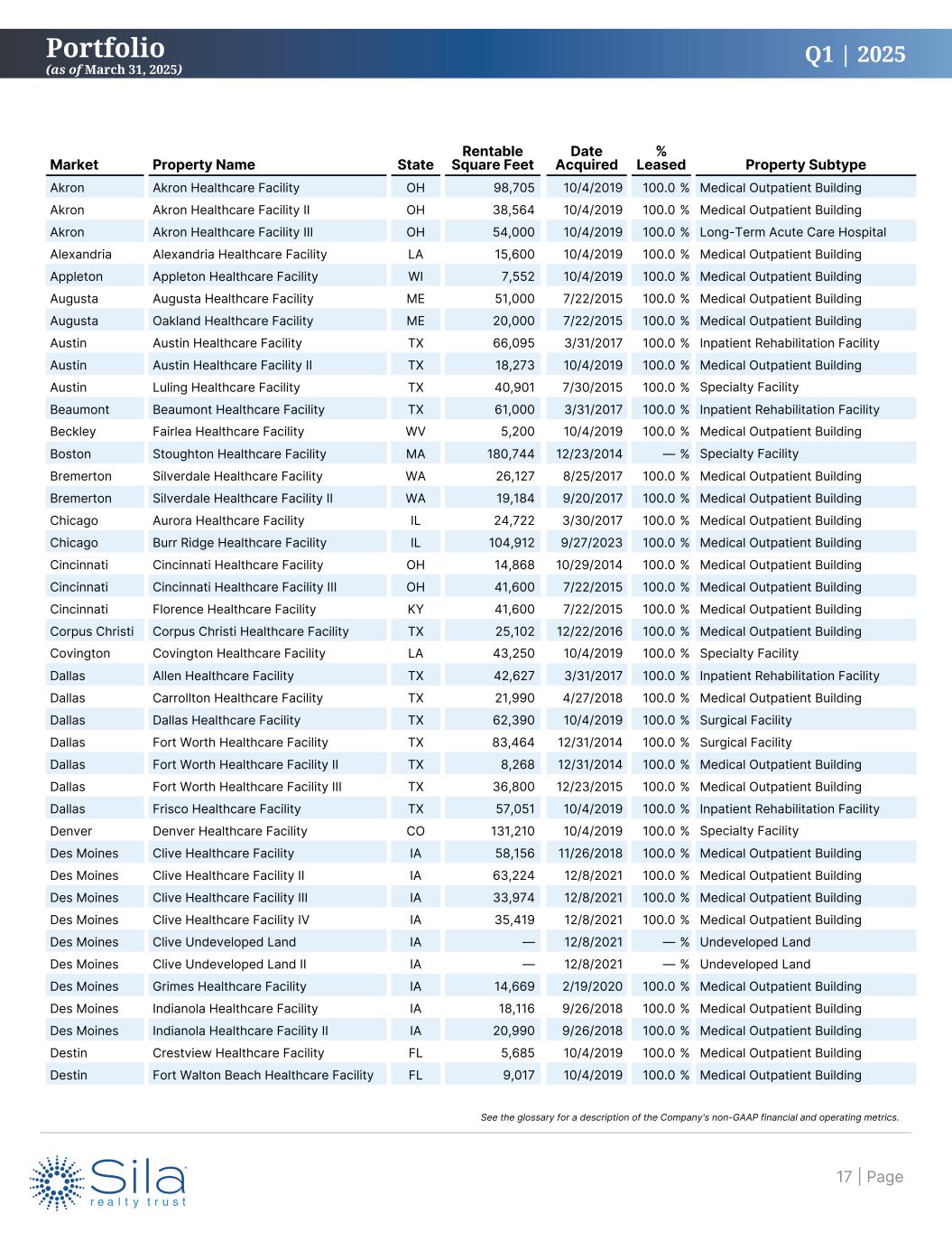 Q1 | 2025 Market Property Name State Rentable Square Feet Date Acquired % Leased Property Subtype Akron Akron Healthcare Facility OH 98,705 10/4/2019 100.0 % Medical Outpatient Building Akron Akron Healthcare Facility II OH 38,564 10/4/2019 100.0 % Medical Outpatient Building Akron Akron Healthcare Facility III OH 54,000 10/4/2019 100.0 % Long-Term Acute Care Hospital Alexandria Alexandria Healthcare Facility LA 15,600 10/4/2019 100.0 % Medical Outpatient Building Appleton Appleton Healthcare Facility WI 7,552 10/4/2019 100.0 % Medical Outpatient Building Augusta Augusta Healthcare Facility ME 51,000 7/22/2015 100.0 % Medical Outpatient Building Augusta Oakland Healthcare Facility ME 20,000 7/22/2015 100.0 % Medical Outpatient Building Austin Austin Healthcare Facility TX 66,095 3/31/2017 100.0 % Inpatient Rehabilitation Facility Austin Austin Healthcare Facility II TX 18,273 10/4/2019 100.0 % Medical Outpatient Building Austin Luling Healthcare Facility TX 40,901 7/30/2015 100.0 % Specialty Facility Beaumont Beaumont Healthcare Facility TX 61,000 3/31/2017 100.0 % Inpatient Rehabilitation Facility Beckley Fairlea Healthcare Facility WV 5,200 10/4/2019 100.0 % Medical Outpatient Building Boston Stoughton Healthcare Facility MA 180,744 12/23/2014 — % Specialty Facility Bremerton Silverdale Healthcare Facility WA 26,127 8/25/2017 100.0 % Medical Outpatient Building Bremerton Silverdale Healthcare Facility II WA 19,184 9/20/2017 100.0 % Medical Outpatient Building Chicago Aurora Healthcare Facility IL 24,722 3/30/2017 100.0 % Medical Outpatient Building Chicago Burr Ridge Healthcare Facility IL 104,912 9/27/2023 100.0 % Medical Outpatient Building Cincinnati Cincinnati Healthcare Facility OH 14,868 10/29/2014 100.0 % Medical Outpatient Building Cincinnati Cincinnati Healthcare Facility III OH 41,600 7/22/2015 100.0 % Medical Outpatient Building Cincinnati Florence Healthcare Facility KY 41,600 7/22/2015 100.0 % Medical Outpatient Building Corpus Christi Corpus Christi Healthcare Facility TX 25,102 12/22/2016 100.0 % Medical Outpatient Building Covington Covington Healthcare Facility LA 43,250 10/4/2019 100.0 % Specialty Facility Dallas Allen Healthcare Facility TX 42,627 3/31/2017 100.0 % Inpatient Rehabilitation Facility Dallas Carrollton Healthcare Facility TX 21,990 4/27/2018 100.0 % Medical Outpatient Building Dallas Dallas Healthcare Facility TX 62,390 10/4/2019 100.0 % Surgical Facility Dallas Fort Worth Healthcare Facility TX 83,464 12/31/2014 100.0 % Surgical Facility Dallas Fort Worth Healthcare Facility II TX 8,268 12/31/2014 100.0 % Medical Outpatient Building Dallas Fort Worth Healthcare Facility III TX 36,800 12/23/2015 100.0 % Medical Outpatient Building Dallas Frisco Healthcare Facility TX 57,051 10/4/2019 100.0 % Inpatient Rehabilitation Facility Denver Denver Healthcare Facility CO 131,210 10/4/2019 100.0 % Specialty Facility Des Moines Clive Healthcare Facility IA 58,156 11/26/2018 100.0 % Medical Outpatient Building Des Moines Clive Healthcare Facility II IA 63,224 12/8/2021 100.0 % Medical Outpatient Building Des Moines Clive Healthcare Facility III IA 33,974 12/8/2021 100.0 % Medical Outpatient Building Des Moines Clive Healthcare Facility IV IA 35,419 12/8/2021 100.0 % Medical Outpatient Building Des Moines Clive Undeveloped Land IA — 12/8/2021 — % Undeveloped Land Des Moines Clive Undeveloped Land II IA — 12/8/2021 — % Undeveloped Land Des Moines Grimes Healthcare Facility IA 14,669 2/19/2020 100.0 % Medical Outpatient Building Des Moines Indianola Healthcare Facility IA 18,116 9/26/2018 100.0 % Medical Outpatient Building Des Moines Indianola Healthcare Facility II IA 20,990 9/26/2018 100.0 % Medical Outpatient Building Destin Crestview Healthcare Facility FL 5,685 10/4/2019 100.0 % Medical Outpatient Building Destin Fort Walton Beach Healthcare Facility FL 9,017 10/4/2019 100.0 % Medical Outpatient Building Portfolio (as of March 31, 2025) | Page17 See the glossary for a description of the Company's non-GAAP financial and operating metrics.