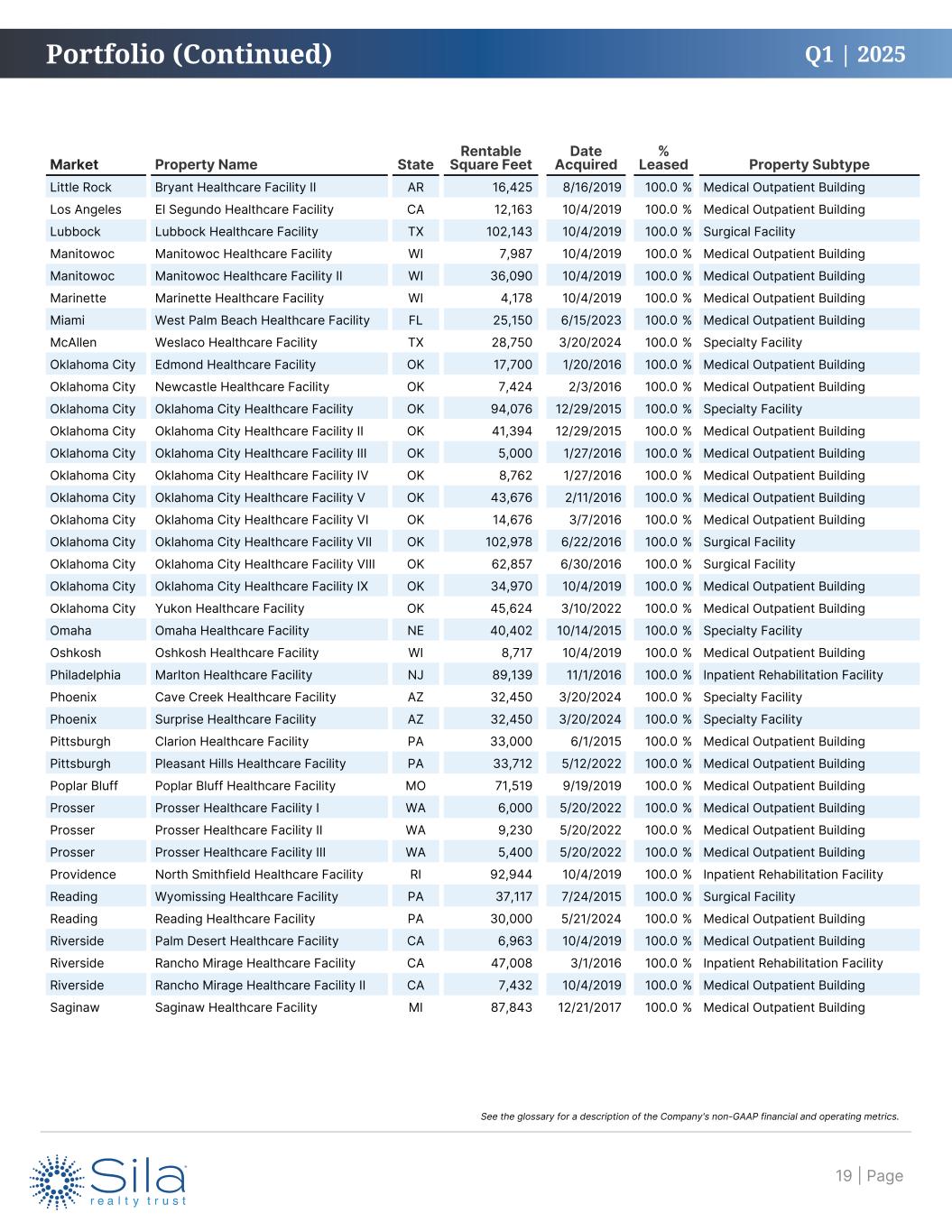 Q1 | 2025 Market Property Name State Rentable Square Feet Date Acquired % Leased Property Subtype Destin Santa Rosa Beach Healthcare Facility FL 5,000 10/4/2019 100.0 % Medical Outpatient Building Elkhart Goshen Healthcare Facility IN 15,462 10/4/2019 100.0 % Medical Outpatient Building Fayetteville Fayetteville Healthcare Facility AR 55,740 10/4/2019 100.0 % Surgical Facility Fort Myers Bonita Springs Healthcare Facility FL 9,800 10/4/2019 100.0 % Medical Outpatient Building Fort Myers Lehigh Acres Healthcare Facility FL 5,746 10/4/2019 100.0 % Medical Outpatient Building Fort Smith Fort Smith Healthcare Facility AR 62,570 7/25/2024 100.0 % Inpatient Rehabilitation Facility Frankfort Frankfort Healthcare Facility KY 4,000 10/4/2019 100.0 % Medical Outpatient Building Grand Rapids Grand Rapids Healthcare Facility MI 108,014 12/7/2016 80.1 % Medical Outpatient Building Green Bay Bellevue Healthcare Facility WI 5,838 10/4/2019 100.0 % Medical Outpatient Building Green Bay De Pere Healthcare Facility WI 7,100 10/4/2019 100.0 % Medical Outpatient Building Green Bay Howard Healthcare Facility WI 7,552 10/4/2019 100.0 % Medical Outpatient Building Green Bay Sturgeon Bay Healthcare Facility WI 3,100 10/4/2019 100.0 % Medical Outpatient Building Hammond Hammond Healthcare Facility LA 63,000 10/4/2019 100.0 % Surgical Facility Hammond Hammond Healthcare Facility II LA 23,835 10/4/2019 100.0 % Specialty Facility Hot Springs Hot Springs Healthcare Facility AR 8,573 10/17/2018 100.0 % Medical Outpatient Building Houston Houston Healthcare Facility TX 13,645 7/31/2014 100.0 % Medical Outpatient Building Houston Houston Healthcare Facility III TX 16,217 10/4/2019 100.0 % Medical Outpatient Building Houston Katy Healthcare Facility TX 34,296 6/8/2018 100.0 % Specialty Facility Houston Webster Healthcare Facility TX 53,514 6/5/2015 100.0 % Inpatient Rehabilitation Facility Indianapolis Brownsburg Healthcare Facility IN 55,986 2/26/2024 100.0 % Inpatient Rehabilitation Facility Indianapolis Greenwood Healthcare Facility IN 53,560 4/19/2021 100.0 % Inpatient Rehabilitation Facility Jacksonville Jacksonville Healthcare Facility FL 13,082 10/4/2019 100.0 % Medical Outpatient Building Kansas City Overland Park Healthcare Facility KS 54,568 2/17/2015 100.0 % Inpatient Rehabilitation Facility Knoxville Knoxville Healthcare Facility TN 70,005 3/4/2025 100.0 % Inpatient Rehabilitation Facility Lafayette Lafayette Healthcare Facility LA 73,824 10/4/2019 100.0 % Surgical Facility Lakeland Winter Haven Healthcare Facility FL 7,560 1/27/2015 100.0 % Medical Outpatient Building Laredo Laredo Healthcare Facility TX 61,677 9/19/2019 100.0 % Medical Outpatient Building Laredo Laredo Healthcare Facility II TX 118,132 9/19/2019 100.0 % Medical Outpatient Building Las Vegas Henderson Healthcare Facility NV 6,685 10/4/2019 100.0 % Medical Outpatient Building Las Vegas Las Vegas Healthcare Facility NV 56,220 6/24/2016 100.0 % Inpatient Rehabilitation Facility Las Vegas Las Vegas Healthcare Facility II NV 6,963 10/4/2019 100.0 % Medical Outpatient Building Little Rock Benton Healthcare Facility AR 104,419 10/17/2018 100.0 % Medical Outpatient Building Little Rock Benton Healthcare Facility II AR 11,350 10/17/2018 100.0 % Medical Outpatient Building Little Rock Bryant Healthcare Facility AR 23,450 10/17/2018 100.0 % Medical Outpatient Building Portfolio (Continued) | Page18 See the glossary for a description of the Company's non-GAAP financial and operating metrics.
