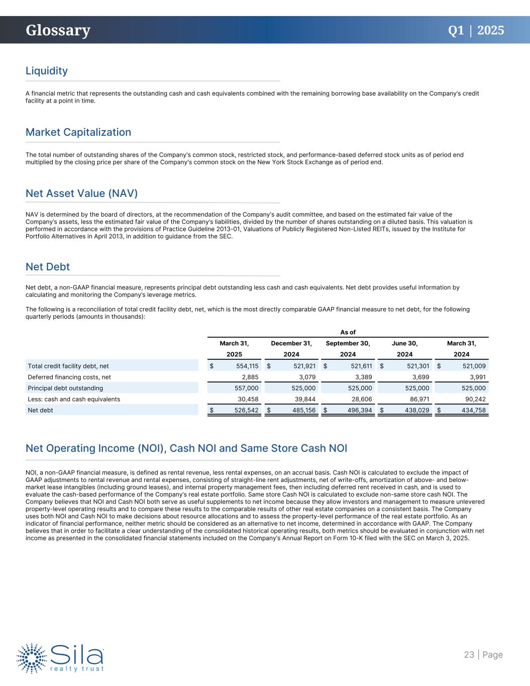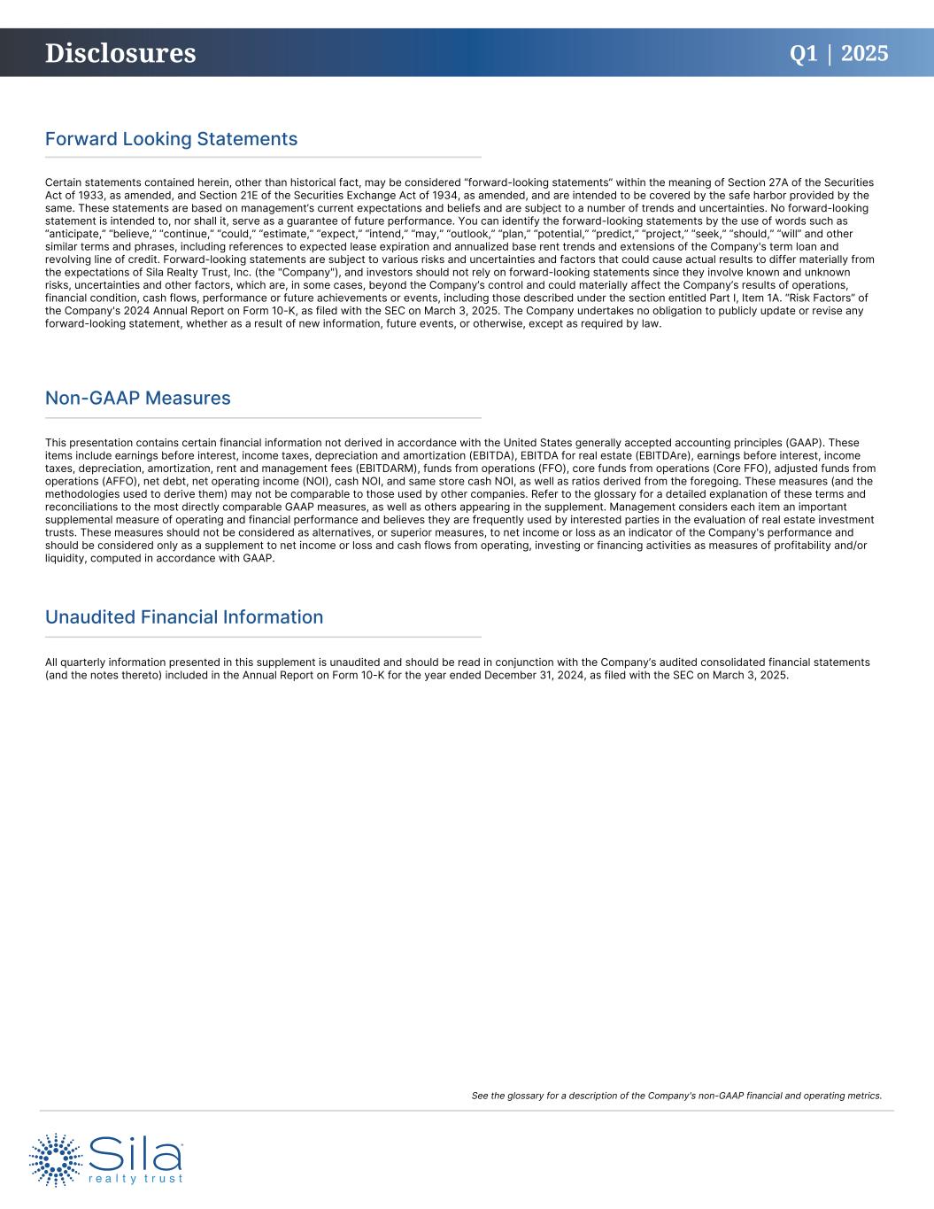 Q1 | 2025 This presentation contains certain financial information not derived in accordance with the United States generally accepted accounting principles (GAAP). These items include earnings before interest, income taxes, depreciation and amortization (EBITDA), EBITDA for real estate (EBITDAre), earnings before interest, income taxes, depreciation, amortization, rent and management fees (EBITDARM), funds from operations (FFO), core funds from operations (Core FFO), adjusted funds from operations (AFFO), net debt, net operating income (NOI), cash NOI, and same store cash NOI, as well as ratios derived from the foregoing. These measures (and the methodologies used to derive them) may not be comparable to those used by other companies. Refer to the glossary for a detailed explanation of these terms and reconciliations to the most directly comparable GAAP measures, as well as others appearing in the supplement. Management considers each item an important supplemental measure of operating and financial performance and believes they are frequently used by interested parties in the evaluation of real estate investment trusts. These measures should not be considered as alternatives, or superior measures, to net income or loss as an indicator of the Company's performance and should be considered only as a supplement to net income or loss and cash flows from operating, investing or financing activities as measures of profitability and/or liquidity, computed in accordance with GAAP. Certain statements contained herein, other than historical fact, may be considered “forward-looking statements” within the meaning of Section 27A of the Securities Act of 1933, as amended, and Section 21E of the Securities Exchange Act of 1934, as amended, and are intended to be covered by the safe harbor provided by the same. These statements are based on management’s current expectations and beliefs and are subject to a number of trends and uncertainties. No forward-looking statement is intended to, nor shall it, serve as a guarantee of future performance. You can identify the forward-looking statements by the use of words such as “anticipate,” “believe,” “continue,” “could,” “estimate,” “expect,” “intend,” “may,” “outlook,” “plan,” “potential,” “predict,” “project,” “seek,” “should,” “will” and other similar terms and phrases, including references to expected lease expiration and annualized base rent trends and extensions of the Company's term loan and revolving line of credit. Forward-looking statements are subject to various risks and uncertainties and factors that could cause actual results to differ materially from the expectations of Sila Realty Trust, Inc. (the "Company"), and investors should not rely on forward-looking statements since they involve known and unknown risks, uncertainties and other factors, which are, in some cases, beyond the Company’s control and could materially affect the Company’s results of operations, financial condition, cash flows, performance or future achievements or events, including those described under the section entitled Part I, Item 1A. “Risk Factors” of the Company's 2024 Annual Report on Form 10-K, as filed with the SEC on March 3, 2025. The Company undertakes no obligation to publicly update or revise any forward-looking statement, whether as a result of new information, future events, or otherwise, except as required by law. Forward Looking Statements Non-GAAP Measures Unaudited Financial Information Disclosures All quarterly information presented in this supplement is unaudited and should be read in conjunction with the Company’s audited consolidated financial statements (and the notes thereto) included in the Annual Report on Form 10-K for the year ended December 31, 2024, as filed with the SEC on March 3, 2025. See the glossary for a description of the Company's non-GAAP financial and operating metrics.