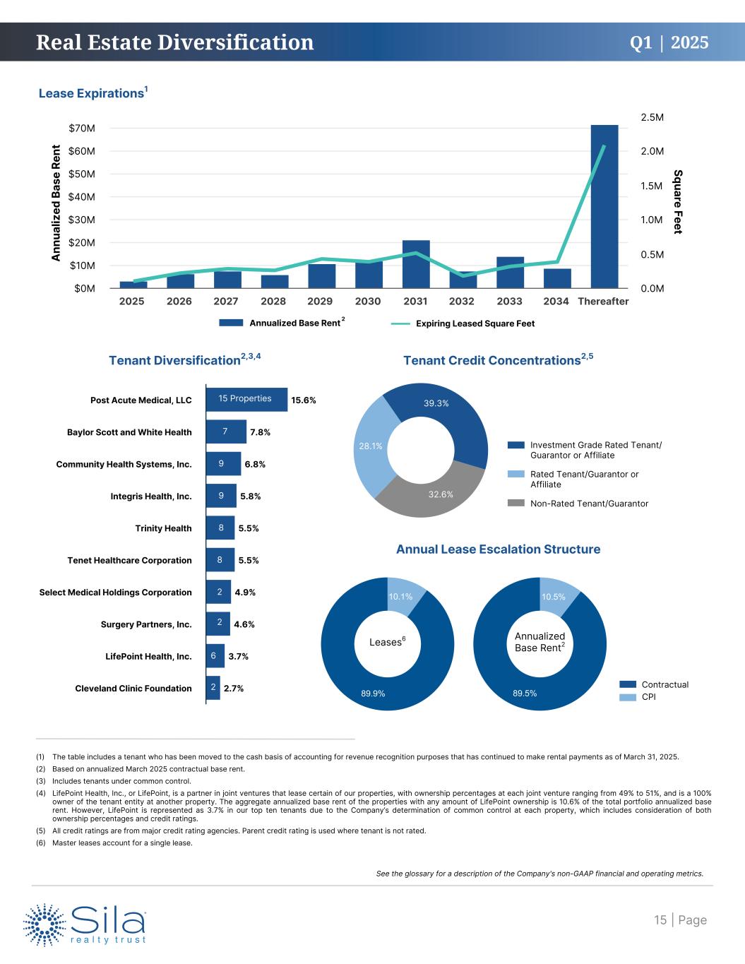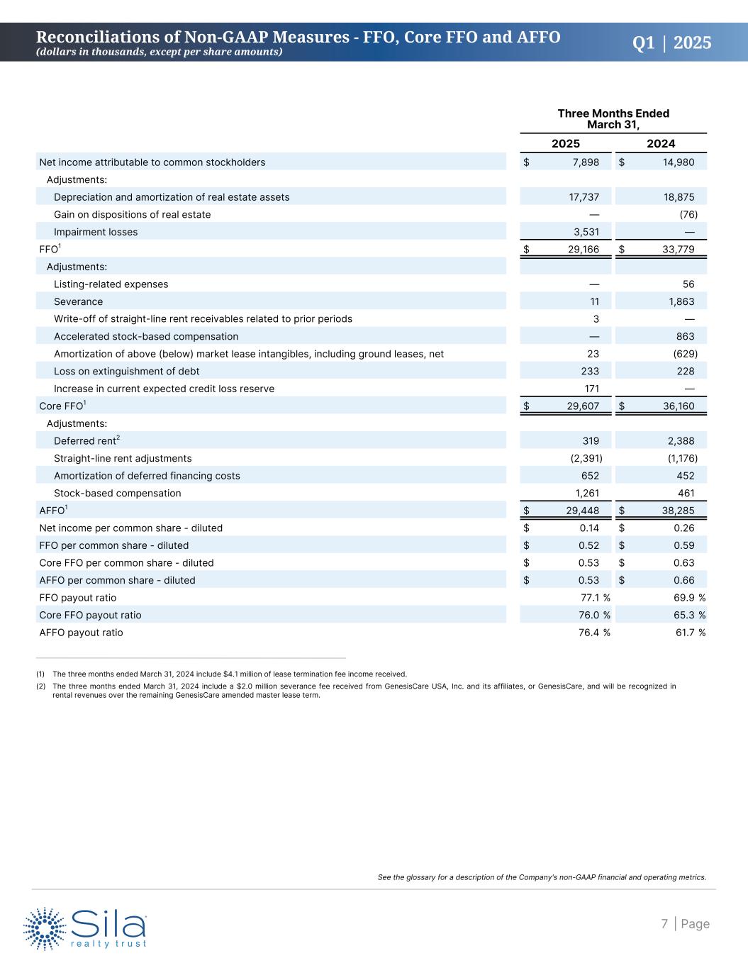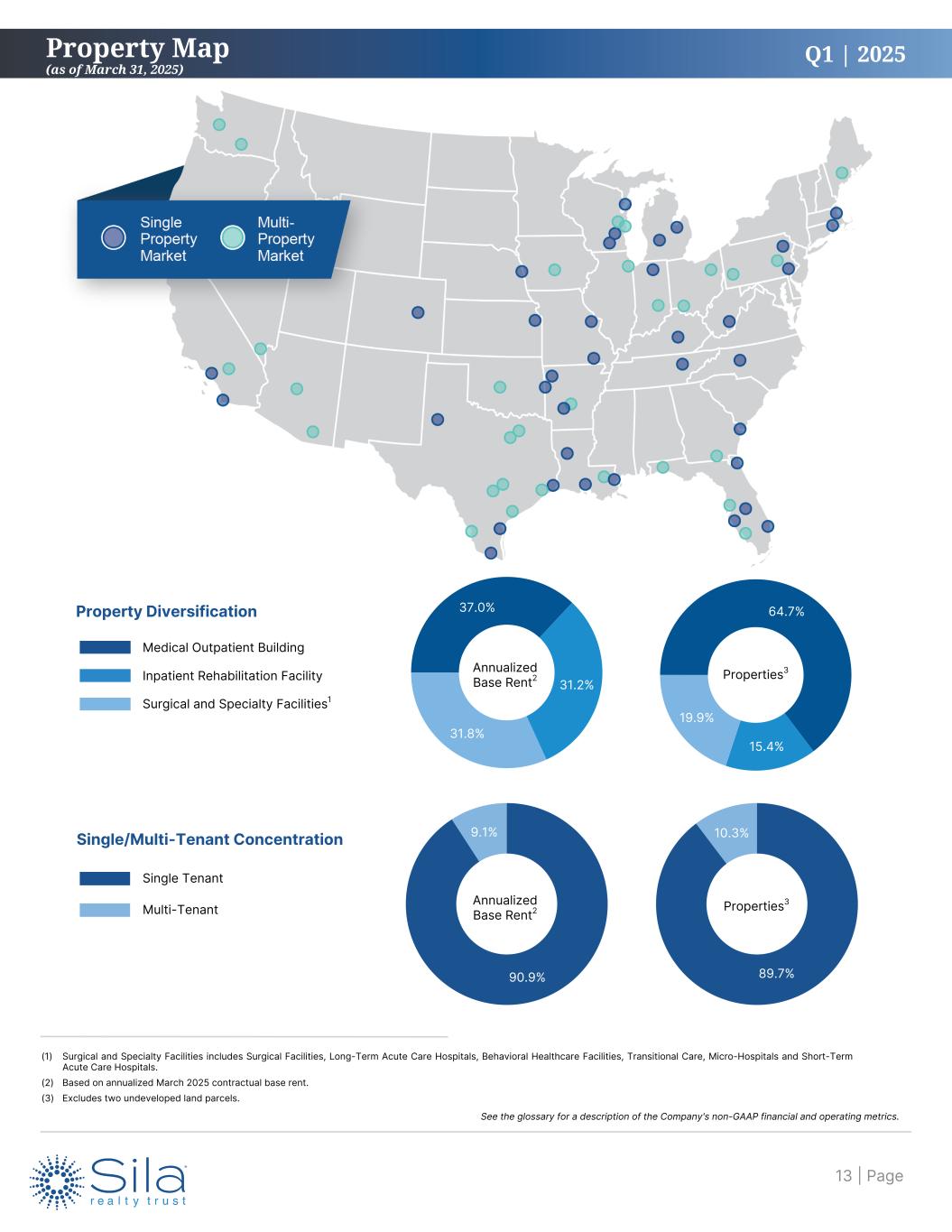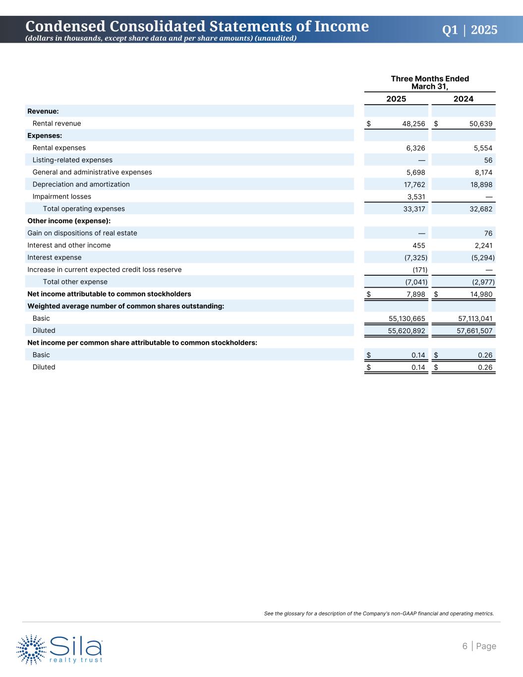 Q1 | 2025 Section Page Corporate Address 1001 Water Street Suite 800 Tampa, FL 33602 Transfer Agent By Regular Mail: Computershare P.O. Box 43007 Providence, RI 02940-3007 By Overnight Delivery: Computershare 150 Royall Street, Suite 101 Canton, MA 02021 Contact Information Investor Support 833-404-4107 Miles Callahan, Senior Vice President of Capital Markets and Investor Relations IR@silarealtytrust.com www.silarealtytrust.com Quarterly Financial Summary ..................................................................... 3 Financial Statistics and Ratios ................................................................... 4 Condensed Consolidated Balance Sheets ............................................. 5 Condensed Consolidated Statements of Income ................................. 6 Reconciliations of Non-GAAP Measures - FFO, Core FFO, and AFFO ................................................................................................................. 7 Reconciliations of Non-GAAP Measures - EBITDA and EBITDAre ... 8 Reconciliations of Non-GAAP Measures - Net Operating Income (NOI) ................................................................................................................. 9 Same Store Cash NOI and Leasing Trends ............................................ 10 Debt .................................................................................................................. 11 Acquisitions and Dispositions .................................................................... 12 Property Map .................................................................................................. 13 Real Estate Diversification .......................................................................... 14 Portfolio ........................................................................................................... 17 Glossary ........................................................................................................... 21 Supplemental Information as of March 31, 2025 See the glossary for a description of the Company's non-GAAP financial and operating metrics.