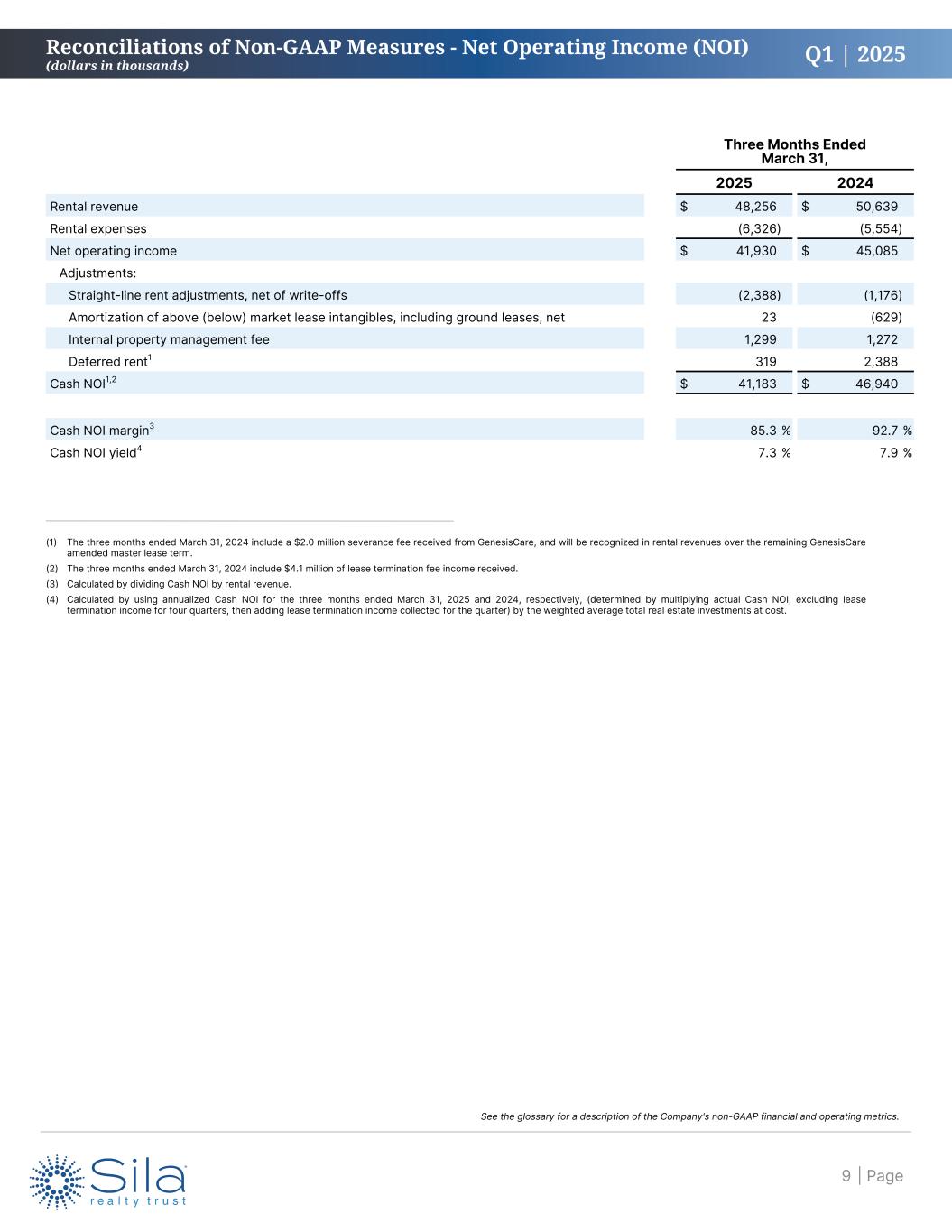 Q1 | 2025 Three Months Ended March 31, 2025 2024 Rental revenue $ 48,256 $ 50,639 Rental expenses (6,326) (5,554) Net operating income $ 41,930 $ 45,085 Adjustments: Straight-line rent adjustments, net of write-offs (2,388) (1,176) Amortization of above (below) market lease intangibles, including ground leases, net 23 (629) Internal property management fee 1,299 1,272 Deferred rent1 319 2,388 Cash NOI1,2 $ 41,183 $ 46,940 Cash NOI margin3 85.3 % 92.7 % Cash NOI yield4 7.3 % 7.9 % (1) The three months ended March 31, 2024 include a $2.0 million severance fee received from GenesisCare, and will be recognized in rental revenues over the remaining GenesisCare amended master lease term. (2) The three months ended March 31, 2024 include $4.1 million of lease termination fee income received. (3) Calculated by dividing Cash NOI by rental revenue. (4) Calculated by using annualized Cash NOI for the three months ended March 31, 2025 and 2024, respectively, (determined by multiplying actual Cash NOI, excluding lease termination income for four quarters, then adding lease termination income collected for the quarter) by the weighted average total real estate investments at cost. Reconciliations of Non-GAAP Measures - Net Operating Income (NOI) (dollars in thousands) | Page9 See the glossary for a description of the Company's non-GAAP financial and operating metrics.