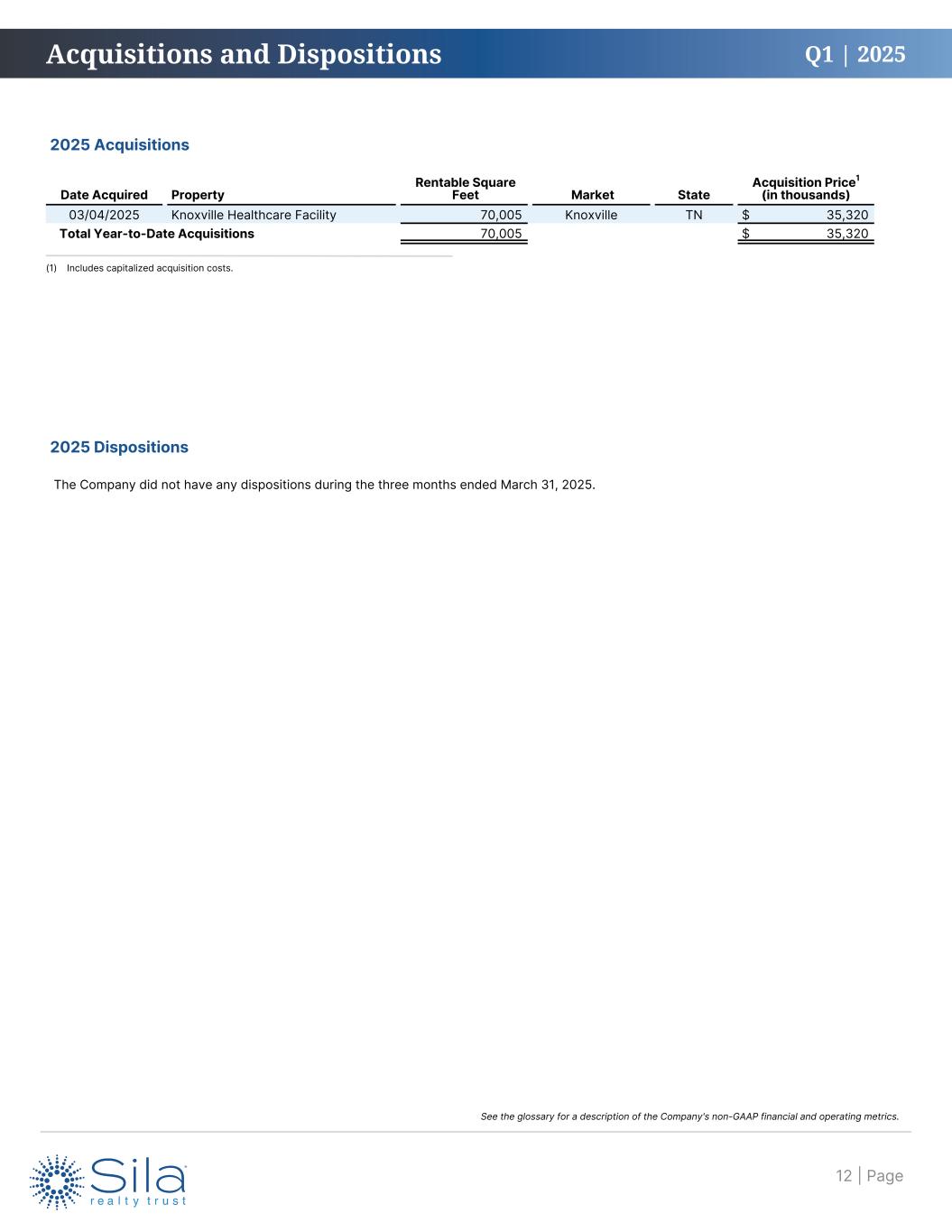 Q1 | 2025 2025 Acquisitions Date Acquired Property Rentable Square Feet Market State Acquisition Price1 (in thousands) 03/04/2025 Knoxville Healthcare Facility 70,005 Knoxville TN $ 35,320 Total Year-to-Date Acquisitions 70,005 $ 35,320 2025 Dispositions Acquisitions and Dispositions (1) Includes capitalized acquisition costs. | Page12 See the glossary for a description of the Company's non-GAAP financial and operating metrics. The Company did not have any dispositions during the three months ended March 31, 2025.