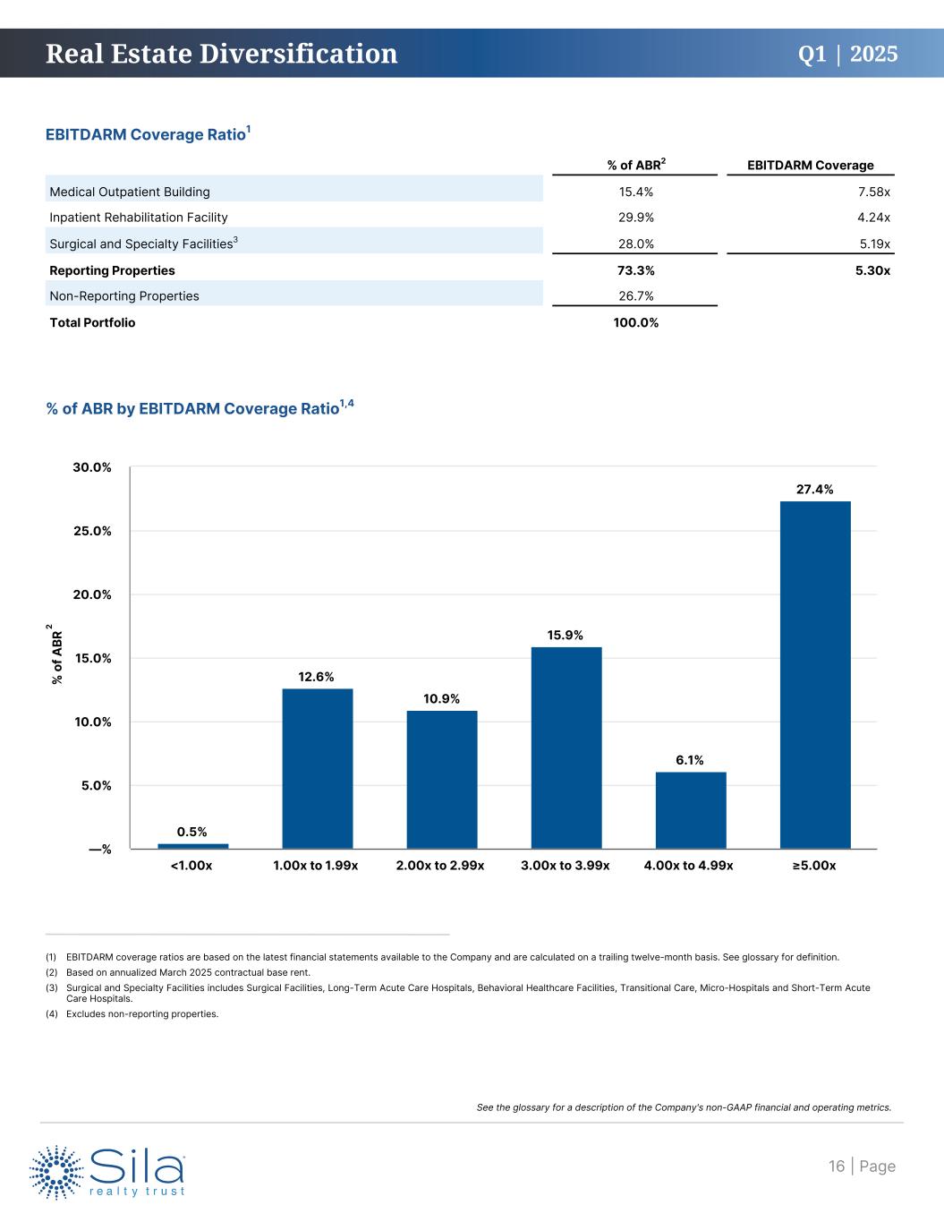 Q1 | 2025 15.6% 7.8% 6.8% 5.8% 5.5% 5.5% 4.9% 4.6% 3.7% 2.7% Post Acute Medical, LLC Baylor Scott and White Health Community Health Systems, Inc. Integris Health, Inc. Trinity Health Tenet Healthcare Corporation Select Medical Holdings Corporation Surgery Partners, Inc. LifePoint Health, Inc. Cleveland Clinic Foundation 28.1% 39.3% 32.6% A nn ua liz ed B as e Re nt Square Feet 2025 2026 2027 2028 2029 2030 2031 2032 2033 2034 Thereafter $0M $10M $20M $30M $40M $50M $60M $70M 0.0M 0.5M 1.0M 1.5M 2.0M 2.5M Tenant Diversification2,3,4 Lease Expirations1 (1) The table includes a tenant who has been moved to the cash basis of accounting for revenue recognition purposes that has continued to make rental payments as of March 31, 2025. (2) Based on annualized March 2025 contractual base rent. (3) Includes tenants under common control. (4) LifePoint Health, Inc., or LifePoint, is a partner in joint ventures that lease certain of our properties, with ownership percentages at each joint venture ranging from 49% to 51%, and is a 100% owner of the tenant entity at another property. The aggregate annualized base rent of the properties with any amount of LifePoint ownership is 10.6% of the total portfolio annualized base rent. However, LifePoint is represented as 3.7% in our top ten tenants due to the Company’s determination of common control at each property, which includes consideration of both ownership percentages and credit ratings. (5) All credit ratings are from major credit rating agencies. Parent credit rating is used where tenant is not rated. (6) Master leases account for a single lease. Annualized Base Rent Expiring Leased Square Feet Tenant Credit Concentrations2,5 Investment Grade Rated Tenant/ Guarantor or Affiliate Rated Tenant/Guarantor or Affiliate Non-Rated Tenant/Guarantor 2 Real Estate Diversification Annual Lease Escalation Structure 10.1% 89.9% Contractual CPI Leases6 10.5% 89.5% Annualized Base Rent2 15 Properties 7 9 9 8 8 2 2 6 2 | Page15 See the glossary for a description of the Company's non-GAAP financial and operating metrics.
