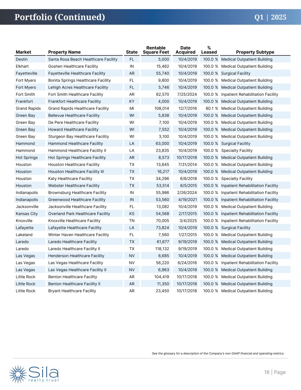 Q1 | 2025 Market Property Name State Rentable Square Feet Date Acquired % Leased Property Subtype Akron Akron Healthcare Facility OH 98,705 10/4/2019 100.0 % Medical Outpatient Building Akron Akron Healthcare Facility II OH 38,564 10/4/2019 100.0 % Medical Outpatient Building Akron Akron Healthcare Facility III OH 54,000 10/4/2019 100.0 % Long-Term Acute Care Hospital Alexandria Alexandria Healthcare Facility LA 15,600 10/4/2019 100.0 % Medical Outpatient Building Appleton Appleton Healthcare Facility WI 7,552 10/4/2019 100.0 % Medical Outpatient Building Augusta Augusta Healthcare Facility ME 51,000 7/22/2015 100.0 % Medical Outpatient Building Augusta Oakland Healthcare Facility ME 20,000 7/22/2015 100.0 % Medical Outpatient Building Austin Austin Healthcare Facility TX 66,095 3/31/2017 100.0 % Inpatient Rehabilitation Facility Austin Austin Healthcare Facility II TX 18,273 10/4/2019 100.0 % Medical Outpatient Building Austin Luling Healthcare Facility TX 40,901 7/30/2015 100.0 % Specialty Facility Beaumont Beaumont Healthcare Facility TX 61,000 3/31/2017 100.0 % Inpatient Rehabilitation Facility Beckley Fairlea Healthcare Facility WV 5,200 10/4/2019 100.0 % Medical Outpatient Building Boston Stoughton Healthcare Facility MA 180,744 12/23/2014 — % Specialty Facility Bremerton Silverdale Healthcare Facility WA 26,127 8/25/2017 100.0 % Medical Outpatient Building Bremerton Silverdale Healthcare Facility II WA 19,184 9/20/2017 100.0 % Medical Outpatient Building Chicago Aurora Healthcare Facility IL 24,722 3/30/2017 100.0 % Medical Outpatient Building Chicago Burr Ridge Healthcare Facility IL 104,912 9/27/2023 100.0 % Medical Outpatient Building Cincinnati Cincinnati Healthcare Facility OH 14,868 10/29/2014 100.0 % Medical Outpatient Building Cincinnati Cincinnati Healthcare Facility III OH 41,600 7/22/2015 100.0 % Medical Outpatient Building Cincinnati Florence Healthcare Facility KY 41,600 7/22/2015 100.0 % Medical Outpatient Building Corpus Christi Corpus Christi Healthcare Facility TX 25,102 12/22/2016 100.0 % Medical Outpatient Building Covington Covington Healthcare Facility LA 43,250 10/4/2019 100.0 % Specialty Facility Dallas Allen Healthcare Facility TX 42,627 3/31/2017 100.0 % Inpatient Rehabilitation Facility Dallas Carrollton Healthcare Facility TX 21,990 4/27/2018 100.0 % Medical Outpatient Building Dallas Dallas Healthcare Facility TX 62,390 10/4/2019 100.0 % Surgical Facility Dallas Fort Worth Healthcare Facility TX 83,464 12/31/2014 100.0 % Surgical Facility Dallas Fort Worth Healthcare Facility II TX 8,268 12/31/2014 100.0 % Medical Outpatient Building Dallas Fort Worth Healthcare Facility III TX 36,800 12/23/2015 100.0 % Medical Outpatient Building Dallas Frisco Healthcare Facility TX 57,051 10/4/2019 100.0 % Inpatient Rehabilitation Facility Denver Denver Healthcare Facility CO 131,210 10/4/2019 100.0 % Specialty Facility Des Moines Clive Healthcare Facility IA 58,156 11/26/2018 100.0 % Medical Outpatient Building Des Moines Clive Healthcare Facility II IA 63,224 12/8/2021 100.0 % Medical Outpatient Building Des Moines Clive Healthcare Facility III IA 33,974 12/8/2021 100.0 % Medical Outpatient Building Des Moines Clive Healthcare Facility IV IA 35,419 12/8/2021 100.0 % Medical Outpatient Building Des Moines Clive Undeveloped Land IA — 12/8/2021 — % Undeveloped Land Des Moines Clive Undeveloped Land II IA — 12/8/2021 — % Undeveloped Land Des Moines Grimes Healthcare Facility IA 14,669 2/19/2020 100.0 % Medical Outpatient Building Des Moines Indianola Healthcare Facility IA 18,116 9/26/2018 100.0 % Medical Outpatient Building Des Moines Indianola Healthcare Facility II IA 20,990 9/26/2018 100.0 % Medical Outpatient Building Destin Crestview Healthcare Facility FL 5,685 10/4/2019 100.0 % Medical Outpatient Building Destin Fort Walton Beach Healthcare Facility FL 9,017 10/4/2019 100.0 % Medical Outpatient Building Portfolio (as of March 31, 2025) | Page17 See the glossary for a description of the Company's non-GAAP financial and operating metrics.