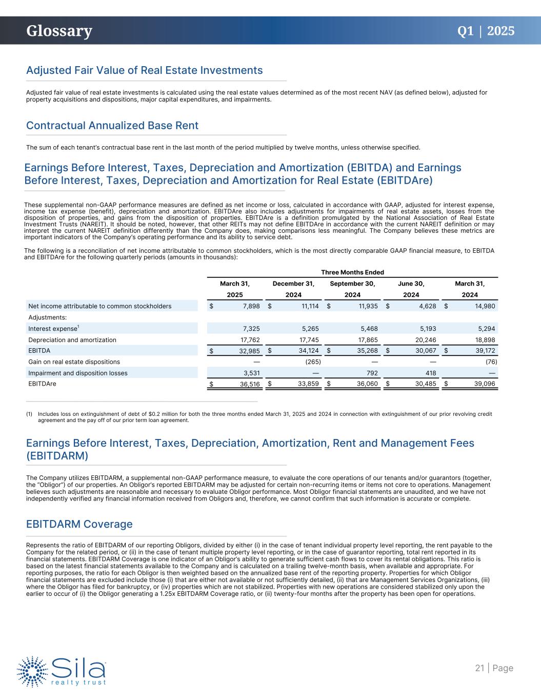 Q1 | 2025 Three Months Ended Interest Coverage Ratio March 31, December 31, September 30, June 30, March 31, 2025 2024 2024 2024 2024 Interest expense $ 7,325 $ 5,265 $ 5,468 $ 5,193 $ 5,294 EBITDAre 36,516 33,859 36,060 30,485 39,096 Interest coverage ratio 5.0 x 6.4 x 6.6 x 5.9 x 7.4 x As of Net Debt Ratios March 31, December 31, September 30, June 30, March 31, 2025 2024 2024 2024 2024 Principal debt outstanding $ 557,000 $ 525,000 $ 525,000 $ 525,000 $ 525,000 Less: cash and cash equivalents 30,458 39,844 28,606 86,971 90,242 Net debt 526,542 485,156 496,394 438,029 434,758 EBITDAre annualized1 149,712 148,080 143,292 142,680 144,072 Net debt to EBITDAre ratio 3.5 x 3.3 x 3.5 x 3.1 x 3.0 x Net debt $ 526,542 $ 485,156 $ 496,394 $ 438,029 $ 434,758 Adjusted fair value of real estate investments — — — — 2,119,620 Enterprise value 2,012,331 1,834,200 1,900,659 1,657,412 — Net debt leverage ratio2 26.2 % 26.5 % 26.1 % 26.4 % 20.5 % Financial Metrics March 31, 2025 Other Key Metrics March 31, 2025 Net debt leverage ratio2 26.2 % Total real estate investments at cost $ 2,275,277 Net debt to EBITDAre ratio 3.5 x Common stock (NYSE: SILA) price per share $ 26.71 Interest coverage ratio 5.0 x Annualized distribution per share4 $ 1.60 Liquidity3 $ 598,458 (1) EBITDAre is annualized by taking the current month amount, removing lease termination income and items that are not a result of normal operations, and multiplying by twelve months. (2) As a result of the Company's listing on the New York Stock Exchange on June 13, 2024, net debt leverage ratio is calculated as net debt to enterprise value as of March 31, 2025, December 31, 2024, September 30, 2024 and June 30, 2024. Prior to the listing, net debt leverage ratio was calculated as net debt to adjusted fair value of real estate investments as of March 31, 2024. (3) Liquidity represents cash and cash equivalents of $30.5 million and borrowing base availability on the Company’s credit facility of $568.0 million as of March 31, 2025. (4) Represents annualized amount of distributions paid during the quarter ended March 31, 2025. Financial Statistics and Ratios (dollars in thousands, except per share amounts) | Page4 See the glossary for a description of the Company's non-GAAP financial and operating metrics.
