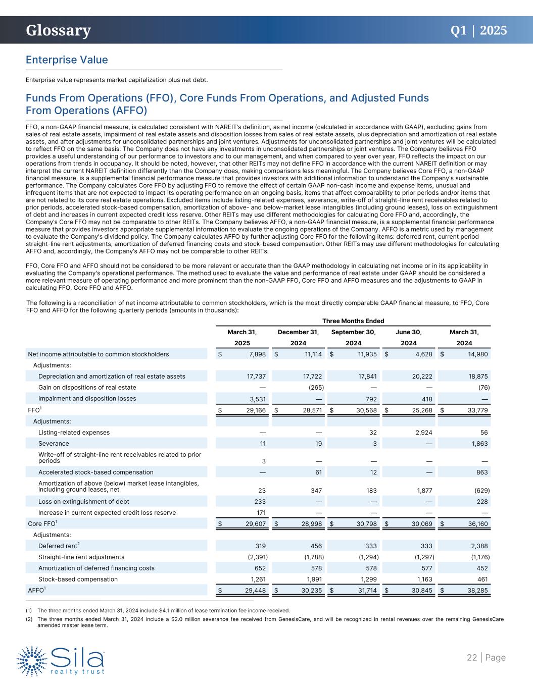 Q1 | 2025 Three Months Ended March 31, December 31, September 30, June 30, March 31, 2025 2024 2024 2024 2024 Net income attributable to common stockholders $ 7,898 $ 11,114 $ 11,935 $ 4,628 $ 14,980 Adjustments: Depreciation and amortization of real estate assets 17,737 17,722 17,841 20,222 18,875 Gain on dispositions of real estate — (265) — — (76) Impairment and disposition losses 3,531 — 792 418 — FFO1 $ 29,166 $ 28,571 $ 30,568 $ 25,268 $ 33,779 Adjustments: Listing-related expenses — — 32 2,924 56 Severance 11 19 3 — 1,863 Write-off of straight-line rent receivables related to prior periods 3 — — — — Accelerated stock-based compensation — 61 12 — 863 Amortization of above (below) market lease intangibles, including ground leases, net 23 347 183 1,877 (629) Loss on extinguishment of debt 233 — — — 228 Increase in current expected credit loss reserve 171 — — — — Core FFO1 $ 29,607 $ 28,998 $ 30,798 $ 30,069 $ 36,160 Adjustments: Deferred rent2 319 456 333 333 2,388 Straight-line rent adjustments (2,391) (1,788) (1,294) (1,297) (1,176) Amortization of deferred financing costs 652 578 578 577 452 Stock-based compensation 1,261 1,991 1,299 1,163 461 AFFO1 $ 29,448 $ 30,235 $ 31,714 $ 30,845 $ 38,285 The following is a reconciliation of net income attributable to common stockholders, which is the most directly comparable GAAP financial measure, to FFO, Core FFO and AFFO for the following quarterly periods (amounts in thousands): Funds From Operations (FFO), Core Funds From Operations, and Adjusted Funds From Operations (AFFO) FFO, a non-GAAP financial measure, is calculated consistent with NAREIT’s definition, as net income (calculated in accordance with GAAP), excluding gains from sales of real estate assets, impairment of real estate assets and disposition losses from sales of real estate assets, plus depreciation and amortization of real estate assets, and after adjustments for unconsolidated partnerships and joint ventures. Adjustments for unconsolidated partnerships and joint ventures will be calculated to reflect FFO on the same basis. The Company does not have any investments in unconsolidated partnerships or joint ventures. The Company believes FFO provides a useful understanding of our performance to investors and to our management, and when compared to year over year, FFO reflects the impact on our operations from trends in occupancy. It should be noted, however, that other REITs may not define FFO in accordance with the current NAREIT definition or may interpret the current NAREIT definition differently than the Company does, making comparisons less meaningful. The Company believes Core FFO, a non-GAAP financial measure, is a supplemental financial performance measure that provides investors with additional information to understand the Company's sustainable performance. The Company calculates Core FFO by adjusting FFO to remove the effect of certain GAAP non-cash income and expense items, unusual and infrequent items that are not expected to impact its operating performance on an ongoing basis, items that affect comparability to prior periods and/or items that are not related to its core real estate operations. Excluded items include listing-related expenses, severance, write-off of straight-line rent receivables related to prior periods, accelerated stock-based compensation, amortization of above- and below-market lease intangibles (including ground leases), loss on extinguishment of debt and increases in current expected credit loss reserve. Other REITs may use different methodologies for calculating Core FFO and, accordingly, the Company’s Core FFO may not be comparable to other REITs. The Company believes AFFO, a non-GAAP financial measure, is a supplemental financial performance measure that provides investors appropriate supplemental information to evaluate the ongoing operations of the Company. AFFO is a metric used by management to evaluate the Company's dividend policy. The Company calculates AFFO by further adjusting Core FFO for the following items: deferred rent, current period straight-line rent adjustments, amortization of deferred financing costs and stock-based compensation. Other REITs may use different methodologies for calculating AFFO and, accordingly, the Company’s AFFO may not be comparable to other REITs. FFO, Core FFO and AFFO should not be considered to be more relevant or accurate than the GAAP methodology in calculating net income or in its applicability in evaluating the Company's operational performance. The method used to evaluate the value and performance of real estate under GAAP should be considered a more relevant measure of operating performance and more prominent than the non-GAAP FFO, Core FFO and AFFO measures and the adjustments to GAAP in calculating FFO, Core FFO and AFFO. Glossary Enterprise Value Enterprise value represents market capitalization plus net debt. (1) The three months ended March 31, 2024 include $4.1 million of lease termination fee income received. (2) The three months ended March 31, 2024 include a $2.0 million severance fee received from GenesisCare, and will be recognized in rental revenues over the remaining GenesisCare amended master lease term. | Page22