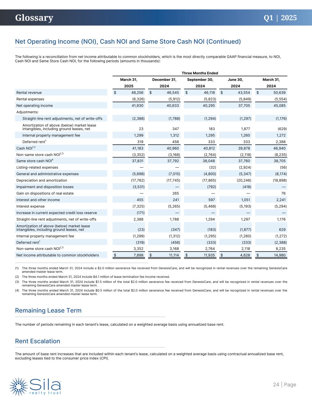 Q1 | 2025 The following is a reconciliation from net income attributable to common stockholders, which is the most directly comparable GAAP financial measure, to NOI, Cash NOI and Same Store Cash NOI, for the following periods (amounts in thousands): Net Operating Income (NOI), Cash NOI and Same Store Cash NOI (Continued) Three Months Ended March 31, December 31, September 30, June 30, March 31, 2025 2024 2024 2024 2024 Rental revenue $ 48,256 $ 46,545 $ 46,118 $ 43,554 $ 50,639 Rental expenses (6,326) (5,912) (5,823) (5,849) (5,554) Net operating income 41,930 40,633 40,295 37,705 45,085 Adjustments: Straight-line rent adjustments, net of write-offs (2,388) (1,788) (1,294) (1,297) (1,176) Amortization of above (below) market lease intangibles, including ground leases, net 23 347 183 1,877 (629) Internal property management fee 1,299 1,312 1,295 1,260 1,272 Deferred rent1 319 456 333 333 2,388 Cash NOI1,2 41,183 40,960 40,812 39,878 46,940 Non-same store cash NOI2,3 (3,352) (3,168) (2,764) (2,118) (8,235) Same store cash NOI4 37,831 37,792 38,048 37,760 38,705 Listing-related expenses — — (32) (2,924) (56) General and administrative expenses (5,698) (7,015) (4,800) (5,347) (8,174) Depreciation and amortization (17,762) (17,745) (17,865) (20,246) (18,898) Impairment and disposition losses (3,531) — (792) (418) — Gain on dispositions of real estate — 265 — — 76 Interest and other income 455 241 597 1,051 2,241 Interest expense (7,325) (5,265) (5,468) (5,193) (5,294) Increase in current expected credit loss reserve (171) — — — — Straight-line rent adjustments, net of write-offs 2,388 1,788 1,294 1,297 1,176 Amortization of above (below) market lease intangibles, including ground leases, net (23) (347) (183) (1,877) 629 Internal property management fee (1,299) (1,312) (1,295) (1,260) (1,272) Deferred rent1 (319) (456) (333) (333) (2,388) Non-same store cash NOI2,3 3,352 3,168 2,764 2,118 8,235 Net income attributable to common stockholders $ 7,898 $ 11,114 $ 11,935 $ 4,628 $ 14,980 Glossary Remaining Lease Term The number of periods remaining in each tenant’s lease, calculated on a weighted average basis using annualized base rent. Rent Escalation The amount of base rent increases that are included within each tenant’s lease, calculated on a weighted average basis using contractual annualized base rent, excluding leases tied to the consumer price index (CPI). (1) The three months ended March 31, 2024 include a $2.0 million severance fee received from GenesisCare, and will be recognized in rental revenues over the remaining GenesisCare amended master lease term. (2) The three months ended March 31, 2024 include $4.1 million of lease termination fee income received. (3) The three months ended March 31, 2024 include $1.5 million of the total $2.0 million severance fee received from GenesisCare, and will be recognized in rental revenues over the remaining GenesisCare amended master lease term. (4) The three months ended March 31, 2024 include $0.5 million of the total $2.0 million severance fee received from GenesisCare, and will be recognized in rental revenues over the remaining GenesisCare amended master lease term. | Page24