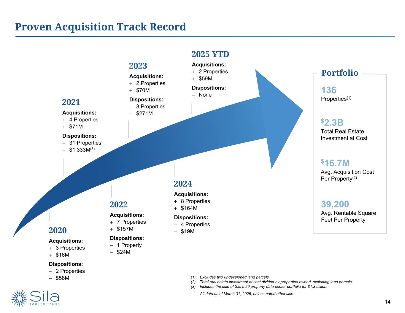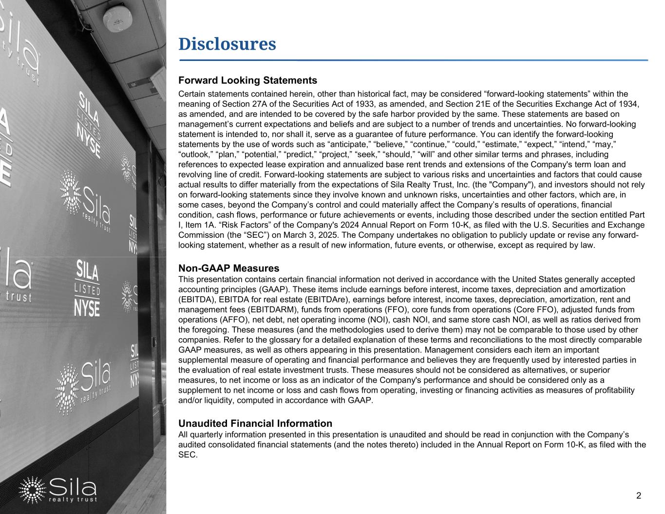 2 Disclosures Forward Looking Statements Certain statements contained herein, other than historical fact, may be considered “forward-looking statements” within the meaning of Section 27A of the Securities Act of 1933, as amended, and Section 21E of the Securities Exchange Act of 1934, as amended, and are intended to be covered by the safe harbor provided by the same. These statements are based on management’s current expectations and beliefs and are subject to a number of trends and uncertainties. No forward-looking statement is intended to, nor shall it, serve as a guarantee of future performance. You can identify the forward-looking statements by the use of words such as “anticipate,” “believe,” “continue,” “could,” “estimate,” “expect,” “intend,” “may,” “outlook,” “plan,” “potential,” “predict,” “project,” “seek,” “should,” “will” and other similar terms and phrases, including references to expected lease expiration and annualized base rent trends and extensions of the Company's term loan and revolving line of credit. Forward-looking statements are subject to various risks and uncertainties and factors that could cause actual results to differ materially from the expectations of Sila Realty Trust, Inc. (the "Company"), and investors should not rely on forward-looking statements since they involve known and unknown risks, uncertainties and other factors, which are, in some cases, beyond the Company’s control and could materially affect the Company’s results of operations, financial condition, cash flows, performance or future achievements or events, including those described under the section entitled Part I, Item 1A. “Risk Factors” of the Company's 2024 Annual Report on Form 10-K, as filed with the U.S. Securities and Exchange Commission (the “SEC”) on March 3, 2025. The Company undertakes no obligation to publicly update or revise any forward- looking statement, whether as a result of new information, future events, or otherwise, except as required by law. Non-GAAP Measures This presentation contains certain financial information not derived in accordance with the United States generally accepted accounting principles (GAAP). These items include earnings before interest, income taxes, depreciation and amortization (EBITDA), EBITDA for real estate (EBITDAre), earnings before interest, income taxes, depreciation, amortization, rent and management fees (EBITDARM), funds from operations (FFO), core funds from operations (Core FFO), adjusted funds from operations (AFFO), net debt, net operating income (NOI), cash NOI, and same store cash NOI, as well as ratios derived from the foregoing. These measures (and the methodologies used to derive them) may not be comparable to those used by other companies. Refer to the glossary for a detailed explanation of these terms and reconciliations to the most directly comparable GAAP measures, as well as others appearing in this presentation. Management considers each item an important supplemental measure of operating and financial performance and believes they are frequently used by interested parties in the evaluation of real estate investment trusts. These measures should not be considered as alternatives, or superior measures, to net income or loss as an indicator of the Company's performance and should be considered only as a supplement to net income or loss and cash flows from operating, investing or financing activities as measures of profitability and/or liquidity, computed in accordance with GAAP. Unaudited Financial Information All quarterly information presented in this presentation is unaudited and should be read in conjunction with the Company’s audited consolidated financial statements (and the notes thereto) included in the Annual Report on Form 10-K, as filed with the SEC. 2