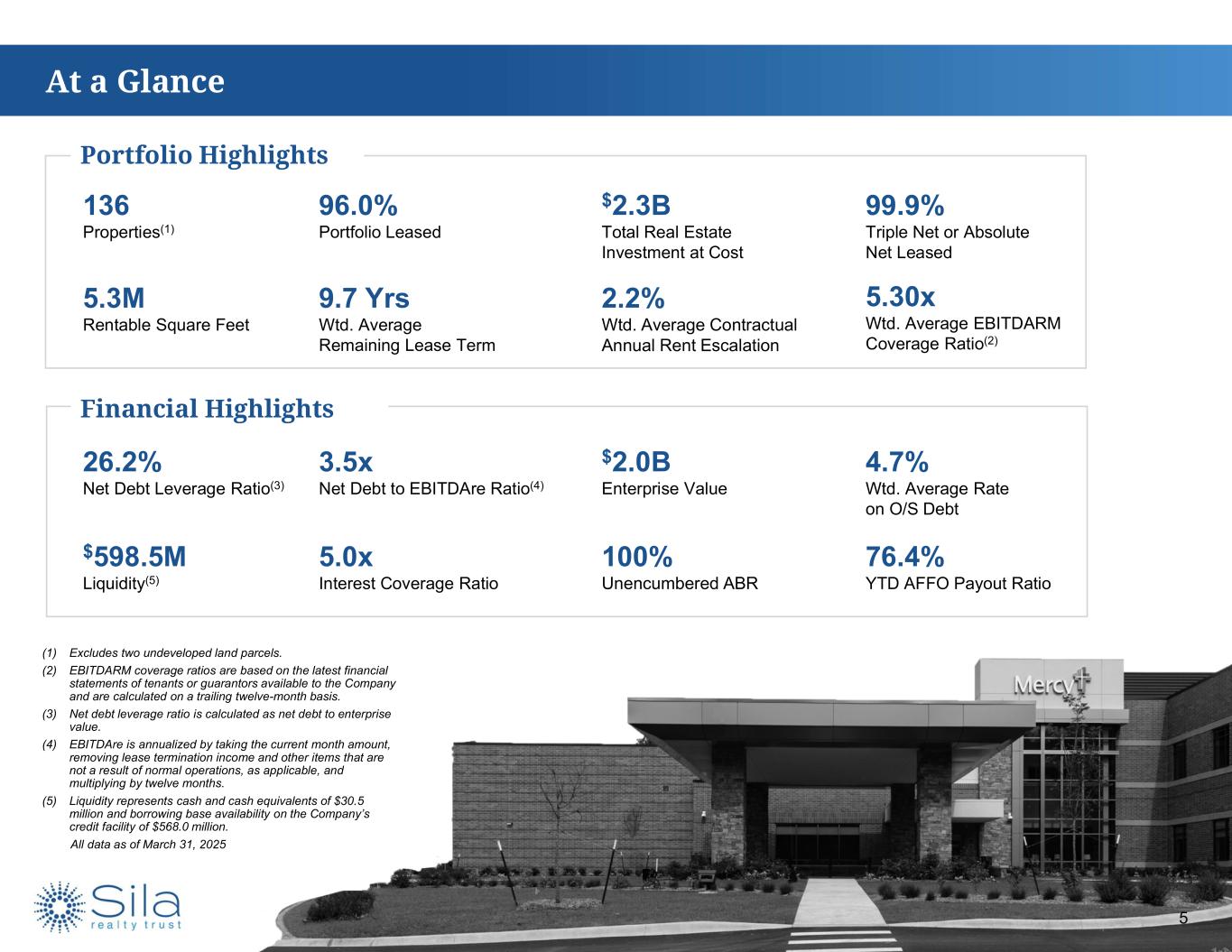 Sila Realty Trust is a net lease REIT focused on institutional quality healthcare properties along the continuum of care. We believe Sila offers REIT investors the best of both worlds - participation in the large and defensive healthcare sector while receiving the benefits of a triple net lease structure, including longer lease terms and an appropriately conservative financial profile.” Michael A. Seton President and Chief Executive Officer Sila Realty Trust, Inc. 4