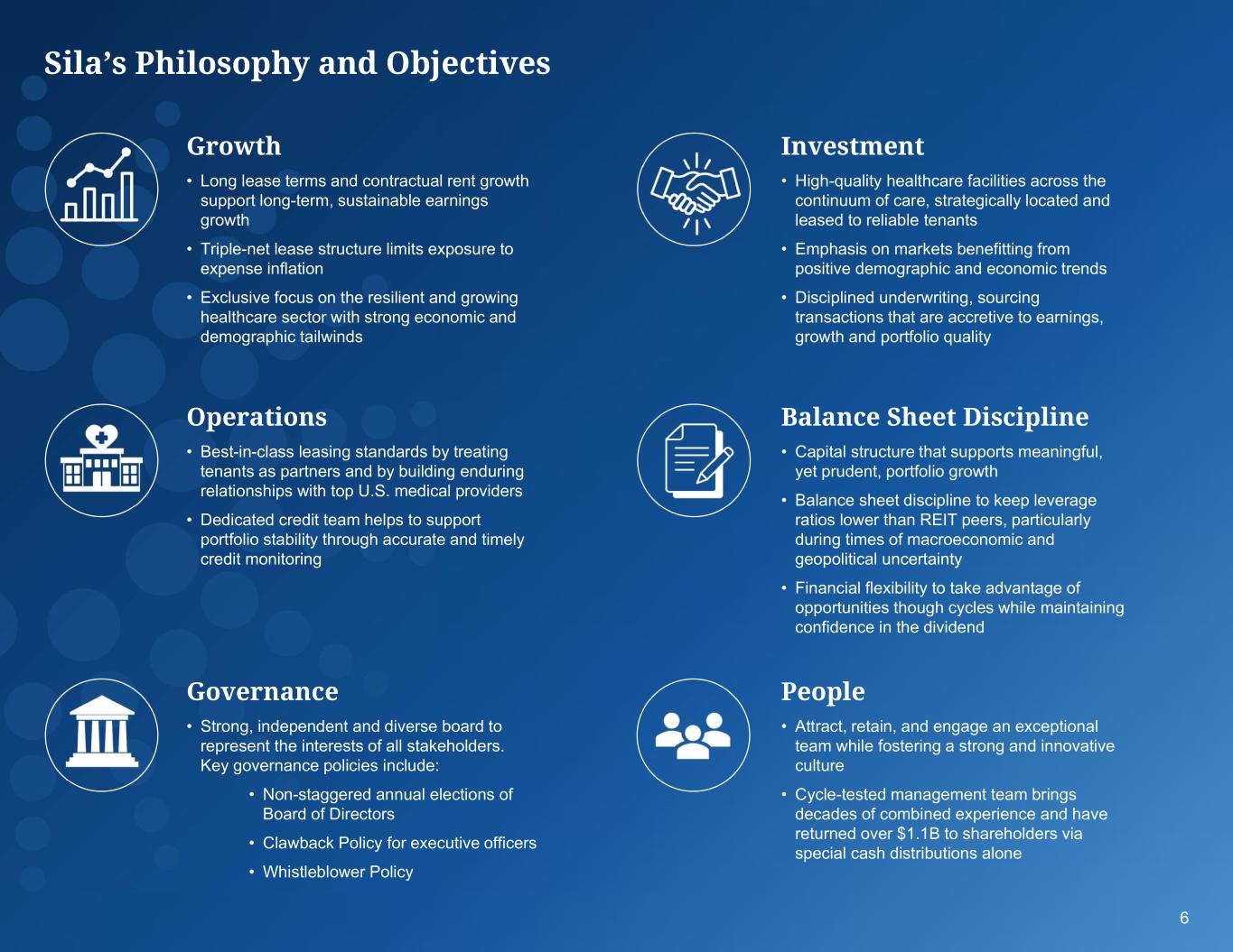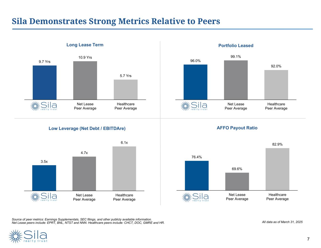 Sila’s Philosophy and Objectives Growth • Long lease terms and contractual rent growth support long-term, sustainable earnings growth • Triple-net lease structure limits exposure to expense inflation • Exclusive focus on the resilient and growing healthcare sector with strong economic and demographic tailwinds Governance • Strong, independent and diverse board to represent the interests of all stakeholders. Key governance policies include: • Non-staggered annual elections of Board of Directors • Clawback Policy for executive officers • Whistleblower Policy Balance Sheet Discipline • Capital structure that supports meaningful, yet prudent, portfolio growth • Balance sheet discipline to keep leverage ratios lower than REIT peers, particularly during times of macroeconomic and geopolitical uncertainty • Financial flexibility to take advantage of opportunities though cycles while maintaining confidence in the dividend Operations • Best-in-class leasing standards by treating tenants as partners and by building enduring relationships with top U.S. medical providers • Dedicated credit team helps to support portfolio stability through accurate and timely credit monitoring 6 People • Attract, retain, and engage an exceptional team while fostering a strong and innovative culture • Cycle-tested management team brings decades of combined experience and have returned over $1.1B to shareholders via special cash distributions alone Investment • High-quality healthcare facilities across the continuum of care, strategically located and leased to reliable tenants • Emphasis on markets benefitting from positive demographic and economic trends • Disciplined underwriting, sourcing transactions that are accretive to earnings, growth and portfolio quality