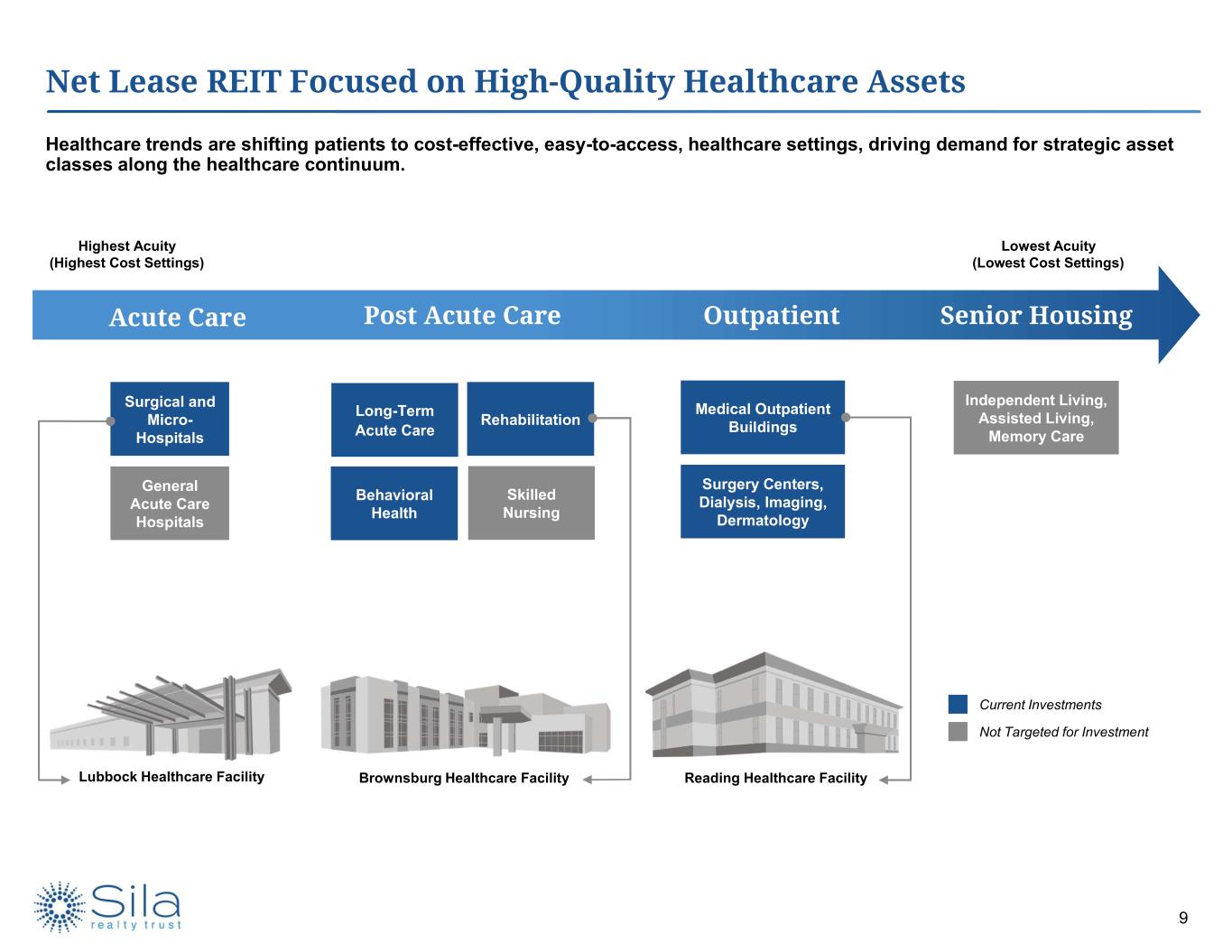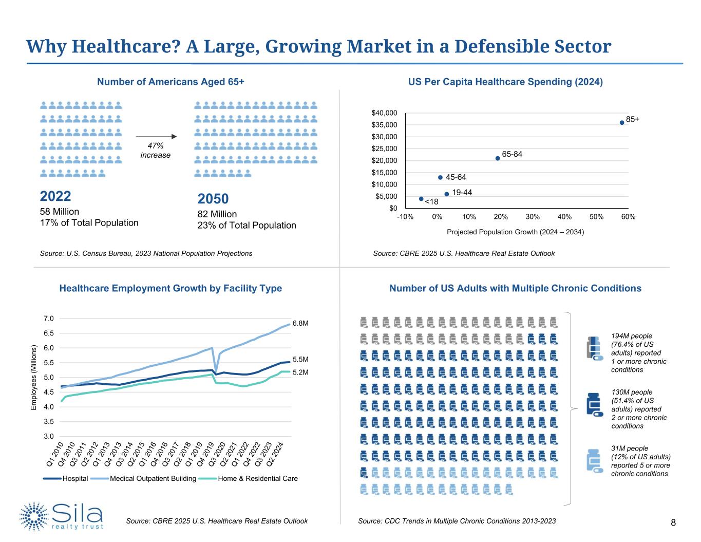 7 Sila Demonstrates Strong Metrics Relative to Peers 9.7 Yrs 10.9 Yrs 5.7 Yrs SILA Net Lease Peer Average Healthcare Peer Average Long Lease Term 96.0% 99.1% 92.0% SILA Net Lease Peer Average Healthcare Peer Average Portfolio Leased 3.5x 4.7x 6.1x SILA Net Lease Peer Average Healthcare Peer Average Low Leverage (Net Debt / EBITDAre) Source of peer metrics: Earnings Supplementals, SEC filings, and other publicly available information. Net Lease peers include: EPRT, BNL, NTST and NNN. Healthcare peers include: CHCT, DOC, GMRE and HR. All data as of March 31, 2025 76.4% 69.6% 82.9% SILA Net Lease Peer Average Healthcare Peer Average AFFO Payout Ratio