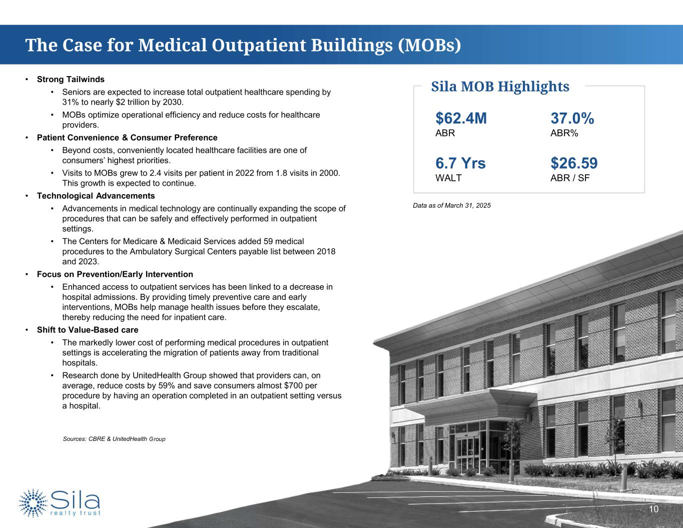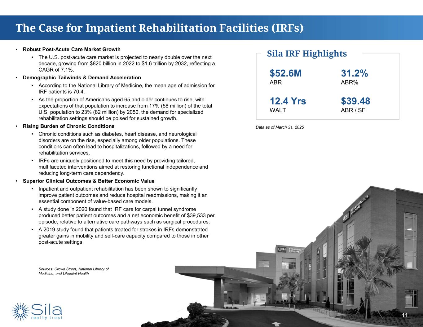 10 Sources: CBRE & UnitedHealth Group $62.4M ABR 37.0% ABR% 6.7 Yrs WALT $26.59 ABR / SF Sila MOB Highlights The Case for Medical Outpatient Buildings (MOBs) • Strong Tailwinds • Seniors are expected to increase total outpatient healthcare spending by 31% to nearly $2 trillion by 2030. • MOBs optimize operational efficiency and reduce costs for healthcare providers. • Patient Convenience & Consumer Preference • Beyond costs, conveniently located healthcare facilities are one of consumers’ highest priorities. • Visits to MOBs grew to 2.4 visits per patient in 2022 from 1.8 visits in 2000. This growth is expected to continue. • Technological Advancements • Advancements in medical technology are continually expanding the scope of procedures that can be safely and effectively performed in outpatient settings. • The Centers for Medicare & Medicaid Services added 59 medical procedures to the Ambulatory Surgical Centers payable list between 2018 and 2023. • Focus on Prevention/Early Intervention • Enhanced access to outpatient services has been linked to a decrease in hospital admissions. By providing timely preventive care and early interventions, MOBs help manage health issues before they escalate, thereby reducing the need for inpatient care. • Shift to Value-Based care • The markedly lower cost of performing medical procedures in outpatient settings is accelerating the migration of patients away from traditional hospitals. • Research done by UnitedHealth Group showed that providers can, on average, reduce costs by 59% and save consumers almost $700 per procedure by having an operation completed in an outpatient setting versus a hospital. Data as of March 31, 2025