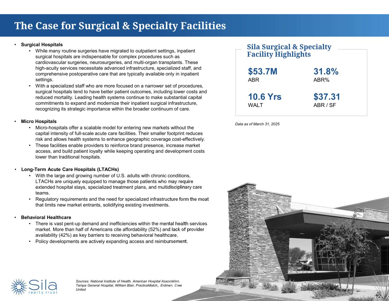 11 • Robust Post-Acute Care Market Growth • The U.S. post-acute care market is projected to nearly double over the next decade, growing from $820 billion in 2022 to $1.6 trillion by 2032, reflecting a CAGR of 7.1%. • Demographic Tailwinds & Demand Acceleration • According to the National Library of Medicine, the mean age of admission for IRF patients is 70.4. • As the proportion of Americans aged 65 and older continues to rise, with expectations of that population to increase from 17% (58 million) of the total U.S. population to 23% (82 million) by 2050, the demand for specialized rehabilitation settings should be poised for sustained growth. • Rising Burden of Chronic Conditions • Chronic conditions such as diabetes, heart disease, and neurological disorders are on the rise, especially among older populations. These conditions can often lead to hospitalizations, followed by a need for rehabilitation services. • IRFs are uniquely positioned to meet this need by providing tailored, multifaceted interventions aimed at restoring functional independence and reducing long-term care dependency. • Superior Clinical Outcomes & Better Economic Value • Inpatient and outpatient rehabilitation has been shown to significantly improve patient outcomes and reduce hospital readmissions, making it an essential component of value-based care models. • A study done in 2020 found that IRF care for carpal tunnel syndrome produced better patient outcomes and a net economic benefit of $39,533 per episode, relative to alternative care pathways such as surgical procedures. • A 2019 study found that patients treated for strokes in IRFs demonstrated greater gains in mobility and self-care capacity compared to those in other post-acute settings. The Case for Inpatient Rehabilitation Facilities (IRFs) $52.6M ABR 31.2% ABR% 12.4 Yrs WALT $39.48 ABR / SF Sila IRF Highlights Sources: Crowd Street, National Library of Medicine, and Lifepoint Health Data as of March 31, 2025