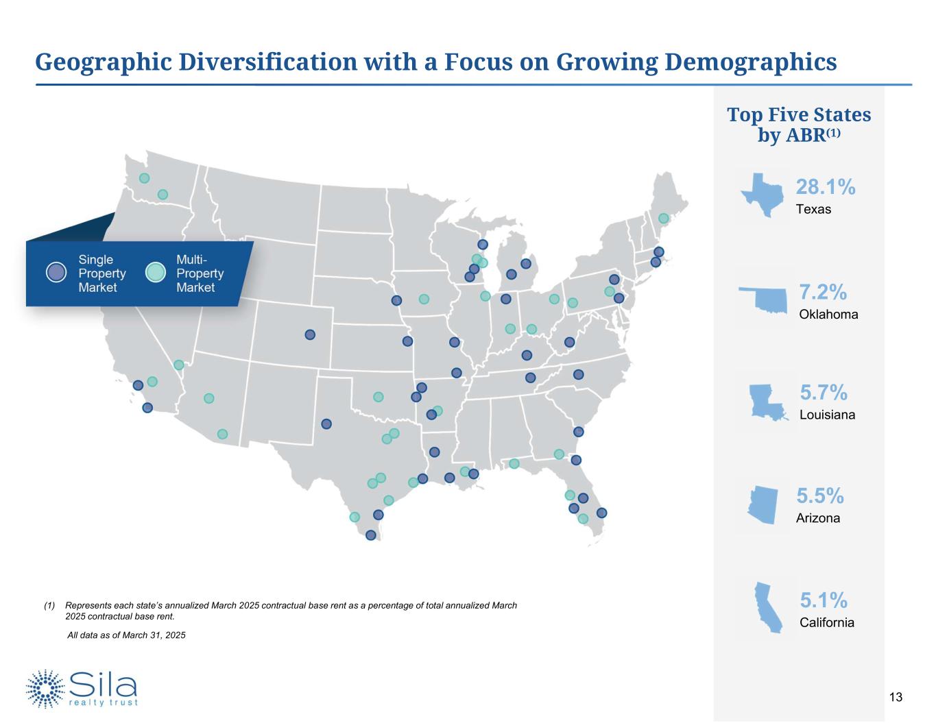 12 • Surgical Hospitals • While many routine surgeries have migrated to outpatient settings, inpatient surgical hospitals are indispensable for complex procedures such as cardiovascular surgeries, neurosurgeries, and multi-organ transplants. These high-acuity services necessitate advanced infrastructure, specialized staff, and comprehensive postoperative care that are typically available only in inpatient settings. • With a specialized staff who are more focused on a narrower set of procedures, surgical hospitals tend to have better patient outcomes, including lower costs and reduced mortality. Leading health systems continue to make substantial capital commitments to expand and modernize their inpatient surgical infrastructure, recognizing its strategic importance within the broader continuum of care. • Micro Hospitals • Micro-hospitals offer a scalable model for entering new markets without the capital intensity of full-scale acute care facilities. Their smaller footprint reduces risk and allows health systems to enhance geographic coverage cost-effectively. • These facilities enable providers to reinforce brand presence, increase market access, and build patient loyalty while keeping operating and development costs lower than traditional hospitals. • Long-Term Acute Care Hospitals (LTACHs) • With the large and growing number of U.S. adults with chronic conditions, LTACHs are uniquely equipped to manage those patients who may require extended hospital stays, specialized treatment plans, and multidisciplinary care teams. • Regulatory requirements and the need for specialized infrastructure form the moat that limits new market entrants, solidifying existing investments. • Behavioral Healthcare • There is vast pent-up demand and inefficiencies within the mental health services market. More than half of Americans cite affordability (52%) and lack of provider availability (42%) as key barriers to receiving behavioral healthcare. • Policy developments are actively expanding access and reimbursement. The Case for Surgical & Specialty Facilities $53.7M ABR 31.8% ABR% 10.6 Yrs WALT $37.31 ABR / SF Sila Surgical & Specialty Facility Highlights Sources: National Institute of Health, American Hospital Association, Tampa General Hospital, William Blair, PracticeMatch,, Erdman, Crea United Data as of March 31, 2025 12