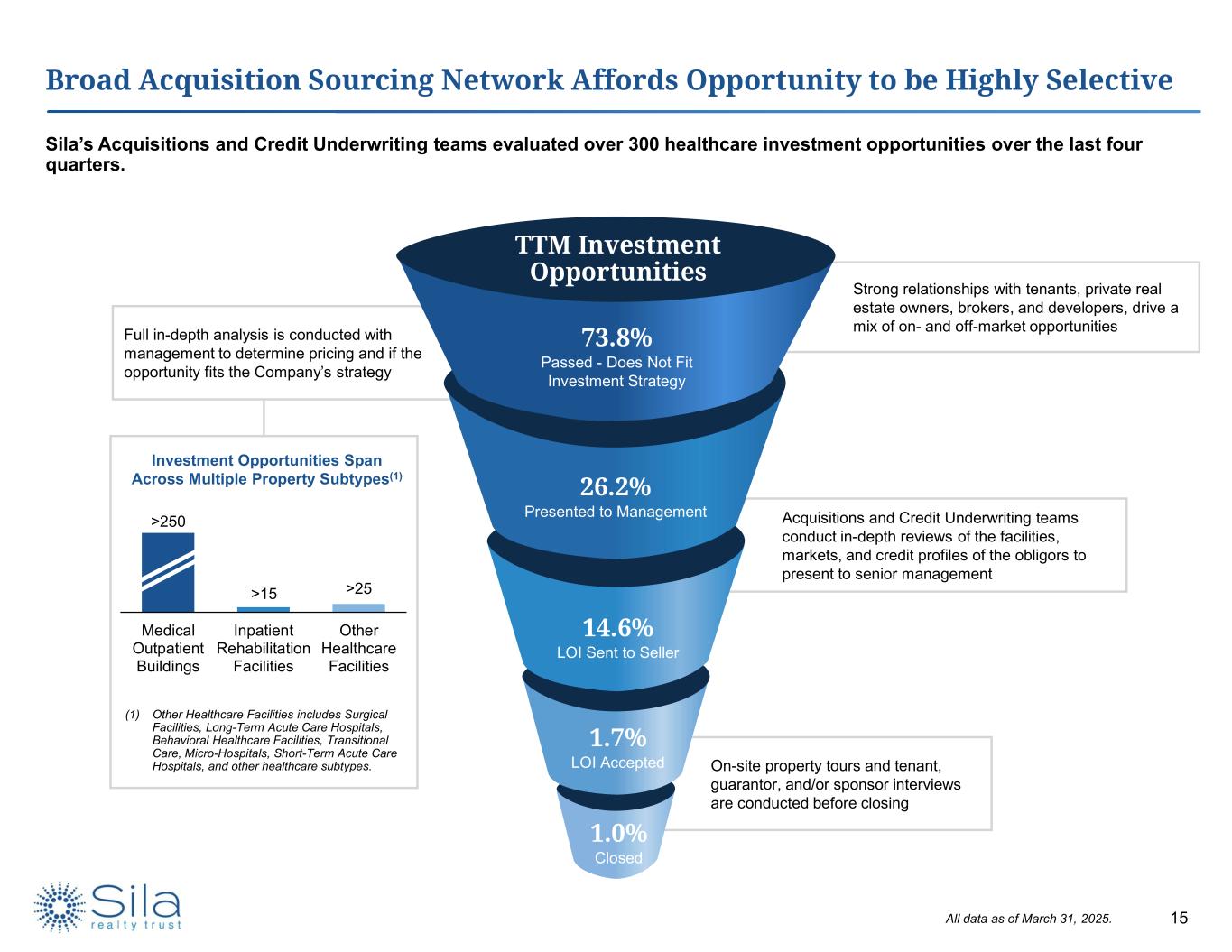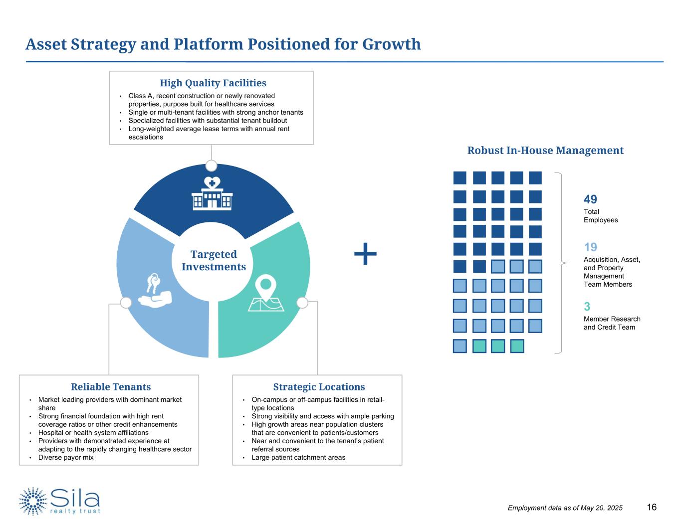 15 Broad Acquisition Sourcing Network Affords Opportunity to be Highly Selective On-site property tours and tenant, guarantor, and/or sponsor interviews are conducted before closing Strong relationships with tenants, private real estate owners, brokers, and developers, drive a mix of on- and off-market opportunitiesFull in-depth analysis is conducted with management to determine pricing and if the opportunity fits the Company’s strategy Acquisitions and Credit Underwriting teams conduct in-depth reviews of the facilities, markets, and credit profiles of the obligors to present to senior management Medical Outpatient Buildings Inpatient Rehabilitation Facilities Other Healthcare Facilities Investment Opportunities Span Across Multiple Property Subtypes(1) >250 >15 >25 (1) Other Healthcare Facilities includes Surgical Facilities, Long-Term Acute Care Hospitals, Behavioral Healthcare Facilities, Transitional Care, Micro-Hospitals, Short-Term Acute Care Hospitals, and other healthcare subtypes. 73.8% Passed - Does Not Fit Investment Strategy 26.2% Presented to Management 14.6% LOI Sent to Seller 1.7% LOI Accepted 1.0% Closed TTM Investment Opportunities Sila’s Acquisitions and Credit Underwriting teams evaluated over 300 healthcare investment opportunities over the last four quarters. All data as of March 31, 2025.