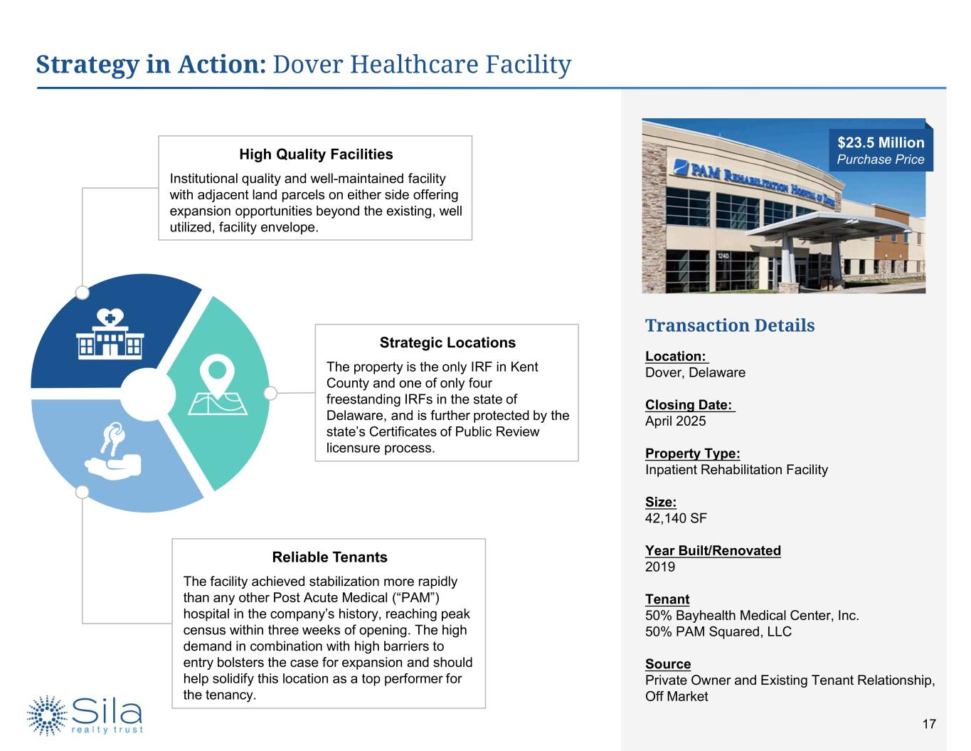 16 Asset Strategy and Platform Positioned for Growth Targeted Investments + High Quality Facilities • Class A, recent construction or newly renovated properties, purpose built for healthcare services • Single or multi-tenant facilities with strong anchor tenants • Specialized facilities with substantial tenant buildout • Long-weighted average lease terms with annual rent escalations Strategic Locations • On-campus or off-campus facilities in retail- type locations • Strong visibility and access with ample parking • High growth areas near population clusters that are convenient to patients/customers • Near and convenient to the tenant’s patient referral sources • Large patient catchment areas Reliable Tenants • Market leading providers with dominant market share • Strong financial foundation with high rent coverage ratios or other credit enhancements • Hospital or health system affiliations • Providers with demonstrated experience at adapting to the rapidly changing healthcare sector • Diverse payor mix Robust In-House Management 49 Total Employees 19 Acquisition, Asset, and Property Management Team Members 3 Member Research and Credit Team Employment data as of May 20, 2025