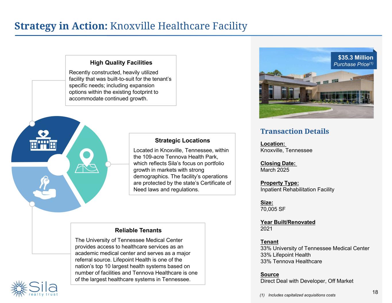 17 Strategy in Action: Dover Healthcare Facility High Quality Facilities Institutional quality and well-maintained facility with adjacent land parcels on either side offering expansion opportunities beyond the existing, well utilized, facility envelope. Strategic Locations The property is the only IRF in Kent County and one of only four freestanding IRFs in the state of Delaware, and is further protected by the state’s Certificates of Public Review licensure process. Reliable Tenants The facility achieved stabilization more rapidly than any other Post Acute Medical (“PAM”) hospital in the company’s history, reaching peak census within three weeks of opening. The high demand in combination with high barriers to entry bolsters the case for expansion and should help solidify this location as a top performer for the tenancy. $23.5 Million Purchase Price Transaction Details Location: Dover, Delaware Closing Date: April 2025 Property Type: Inpatient Rehabilitation Facility Size: 42,140 SF Year Built/Renovated 2019 Tenant 50% Bayhealth Medical Center, Inc. 50% PAM Squared, LLC Source Private Owner and Existing Tenant Relationship, Off Market