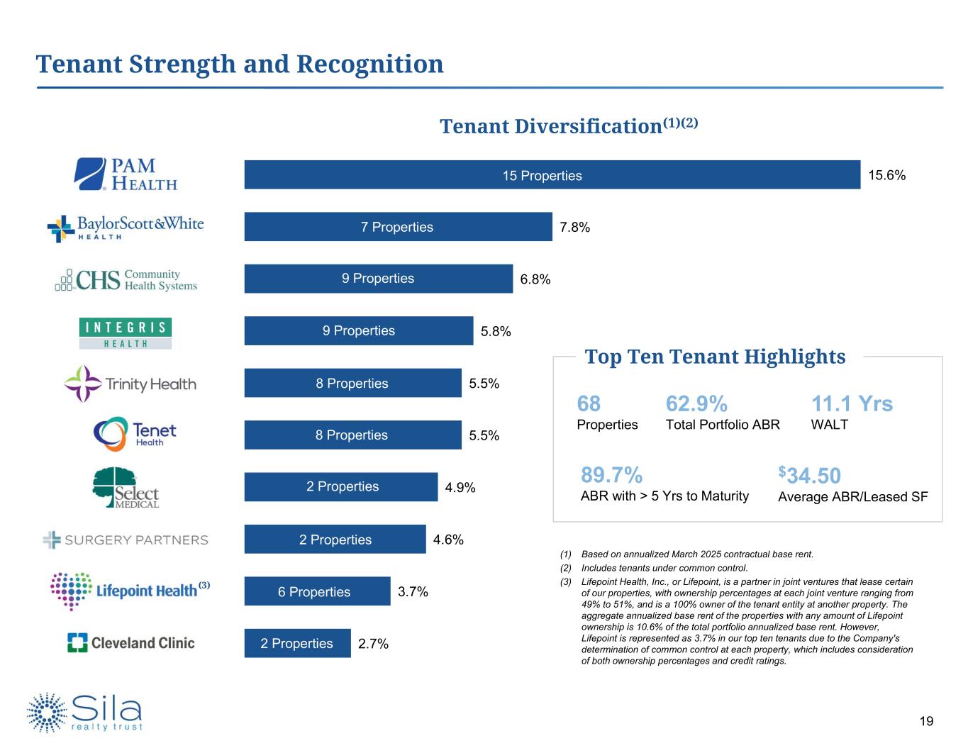 18 Strategy in Action: Knoxville Healthcare Facility High Quality Facilities Recently constructed, heavily utilized facility that was built-to-suit for the tenant’s specific needs; including expansion options within the existing footprint to accommodate continued growth. Strategic Locations Located in Knoxville, Tennessee, within the 109-acre Tennova Health Park, which reflects Sila’s focus on portfolio growth in markets with strong demographics. The facility’s operations are protected by the state’s Certificate of Need laws and regulations. Reliable Tenants The University of Tennessee Medical Center provides access to healthcare services as an academic medical center and serves as a major referral source. Lifepoint Health is one of the nation’s top 10 largest health systems based on number of facilities and Tennova Healthcare is one of the largest healthcare systems in Tennessee. Location: Knoxville, Tennessee Closing Date: March 2025 Property Type: Inpatient Rehabilitation Facility Size: 70,005 SF Year Built/Renovated 2021 Tenant 33% University of Tennessee Medical Center 33% Lifepoint Health 33% Tennova Healthcare Source Direct Deal with Developer, Off Market Transaction Details $35.3 Million Purchase Price(1) (1) Includes capitalized acquisitions costs