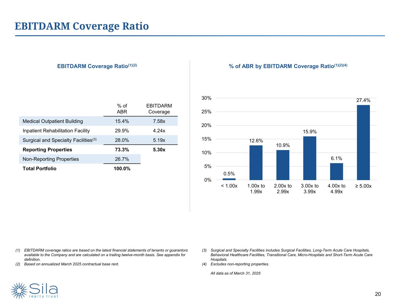 19 2.7% 3.7% 4.6% 4.9% 5.5% 5.5% 5.8% 6.8% 7.8% 15.6% Tenant Strength and Recognition (1) Based on annualized March 2025 contractual base rent. (2) Includes tenants under common control. (3) Lifepoint Health, Inc., or Lifepoint, is a partner in joint ventures that lease certain of our properties, with ownership percentages at each joint venture ranging from 49% to 51%, and is a 100% owner of the tenant entity at another property. The aggregate annualized base rent of the properties with any amount of Lifepoint ownership is 10.6% of the total portfolio annualized base rent. However, Lifepoint is represented as 3.7% in our top ten tenants due to the Company's determination of common control at each property, which includes consideration of both ownership percentages and credit ratings. Tenant Diversification(1)(2) 15 Properties 7 Properties 9 Properties 9 Properties 8 Properties 8 Properties 2 Properties 2 Properties 6 Properties 2 Properties 68 Properties 62.9% Total Portfolio ABR 11.1 Yrs WALT 89.7% ABR with > 5 Yrs to Maturity $34.50 Average ABR/Leased SF Top Ten Tenant Highlights (3)