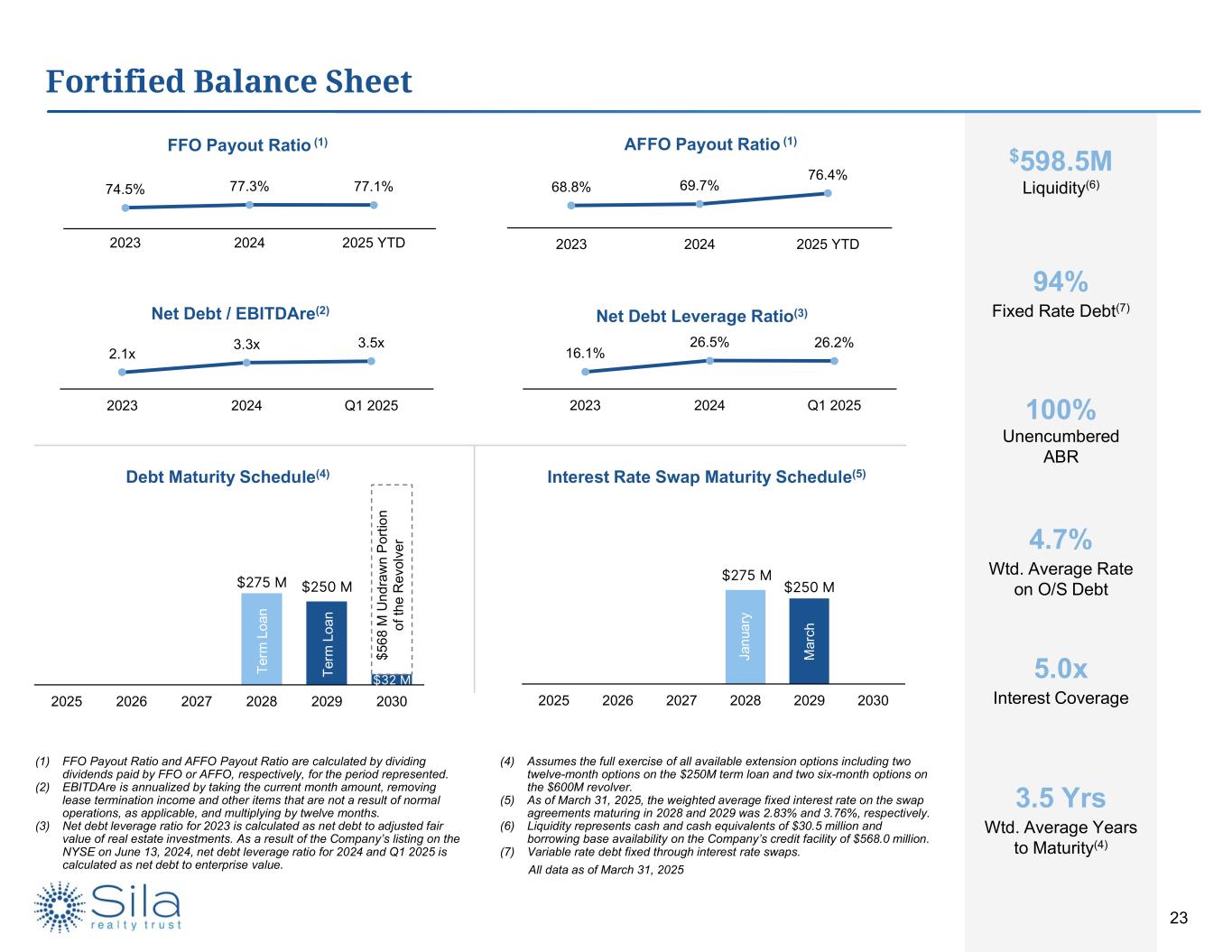 22 Strong Operating Metrics from Long-Term Leases 9.7 Yrs Wtd. Average Remaining Lease Term 96.0% Portfolio Leased 5.3M Rentable Square Feet 80.0% ABR with > 5 Yrs to Maturity 169 Total Leases(3) $32.96 Average ABR/Leased SF Tenant Lease Expiration Schedule(1) (1) The graph includes a tenant who has been moved to the cash basis of accounting for revenue recognition purposes that has continued to make rental payments as of March 31, 2025. (2) Based on annualized March 2025 contractual base rent. (3) Master leases account for a single lease. 0.0M 1.0M 2.0M $0M $20M $40M $60M $80M 2025 2027 2029 2031 2033 Thereafter S q ua re F e et A B R (2 ) Annualized Base Rent Expiring Leased Square Feet Annual Lease Escalation Structure 10.1% 89.9% 10.5% 89.5% CPI Contractual ABR(2) Leases(3) 2.2% Wtd. Average Contractual Annual Rent Escalation