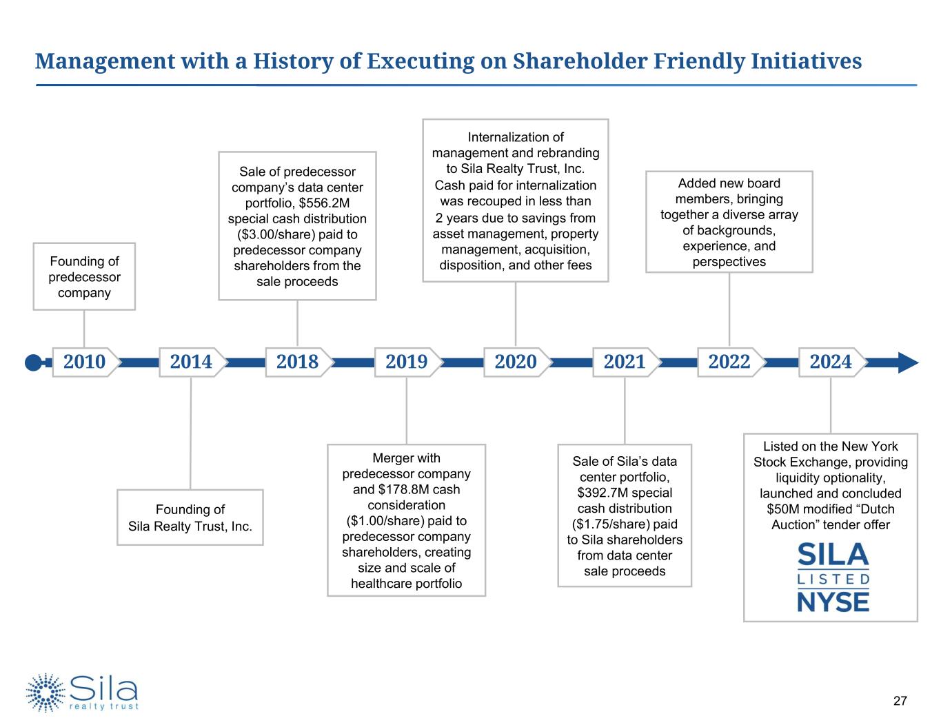27 Management with a History of Executing on Shareholder Friendly Initiatives Founding of Sila Realty Trust, Inc. 2014 Sale of predecessor company’s data center portfolio, $556.2M special cash distribution ($3.00/share) paid to predecessor company shareholders from the sale proceeds 2018 Merger with predecessor company and $178.8M cash consideration ($1.00/share) paid to predecessor company shareholders, creating size and scale of healthcare portfolio 2019 Internalization of management and rebranding to Sila Realty Trust, Inc. Cash paid for internalization was recouped in less than 2 years due to savings from asset management, property management, acquisition, disposition, and other fees 2020 Sale of Sila’s data center portfolio, $392.7M special cash distribution ($1.75/share) paid to Sila shareholders from data center sale proceeds 2021 Added new board members, bringing together a diverse array of backgrounds, experience, and perspectives 2022 Listed on the New York Stock Exchange, providing liquidity optionality, launched and concluded $50M modified “Dutch Auction” tender offer 2024 Founding of predecessor company 2010