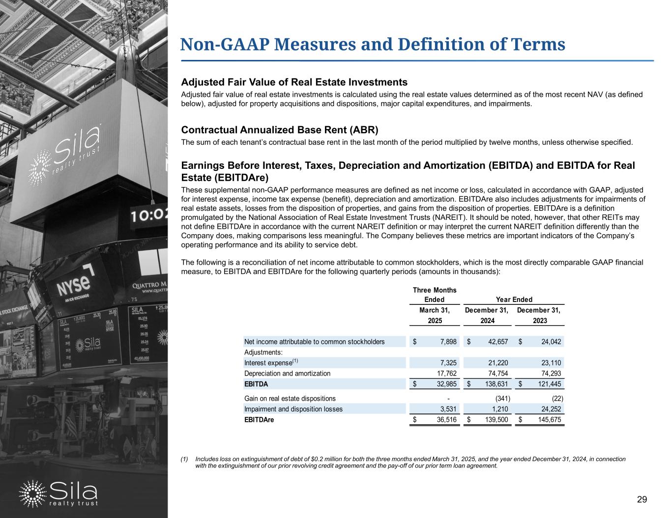 29 Non-GAAP Measures and Definition of Terms Adjusted Fair Value of Real Estate Investments Adjusted fair value of real estate investments is calculated using the real estate values determined as of the most recent NAV (as defined below), adjusted for property acquisitions and dispositions, major capital expenditures, and impairments. Contractual Annualized Base Rent (ABR) The sum of each tenant’s contractual base rent in the last month of the period multiplied by twelve months, unless otherwise specified. Earnings Before Interest, Taxes, Depreciation and Amortization (EBITDA) and EBITDA for Real Estate (EBITDAre) These supplemental non-GAAP performance measures are defined as net income or loss, calculated in accordance with GAAP, adjusted for interest expense, income tax expense (benefit), depreciation and amortization. EBITDAre also includes adjustments for impairments of real estate assets, losses from the disposition of properties, and gains from the disposition of properties. EBITDAre is a definition promulgated by the National Association of Real Estate Investment Trusts (NAREIT). It should be noted, however, that other REITs may not define EBITDAre in accordance with the current NAREIT definition or may interpret the current NAREIT definition differently than the Company does, making comparisons less meaningful. The Company believes these metrics are important indicators of the Company’s operating performance and its ability to service debt. The following is a reconciliation of net income attributable to common stockholders, which is the most directly comparable GAAP financial measure, to EBITDA and EBITDAre for the following quarterly periods (amounts in thousands): Three Months Ended March 31, December 31, December 31, 2025 2024 2023 Net income attributable to common stockholders 7,898$ 42,657$ 24,042$ Adjustments: Interest expense(1) 7,325 21,220 23,110 Depreciation and amortization 17,762 74,754 74,293 EBITDA 32,985$ 138,631$ 121,445$ Gain on real estate dispositions - (341) (22) Impairment and disposition losses 3,531 1,210 24,252 EBITDAre 36,516$ 139,500$ 145,675$ Year Ended (1) Includes loss on extinguishment of debt of $0.2 million for both the three months ended March 31, 2025, and the year ended December 31, 2024, in connection with the extinguishment of our prior revolving credit agreement and the pay-off of our prior term loan agreement.