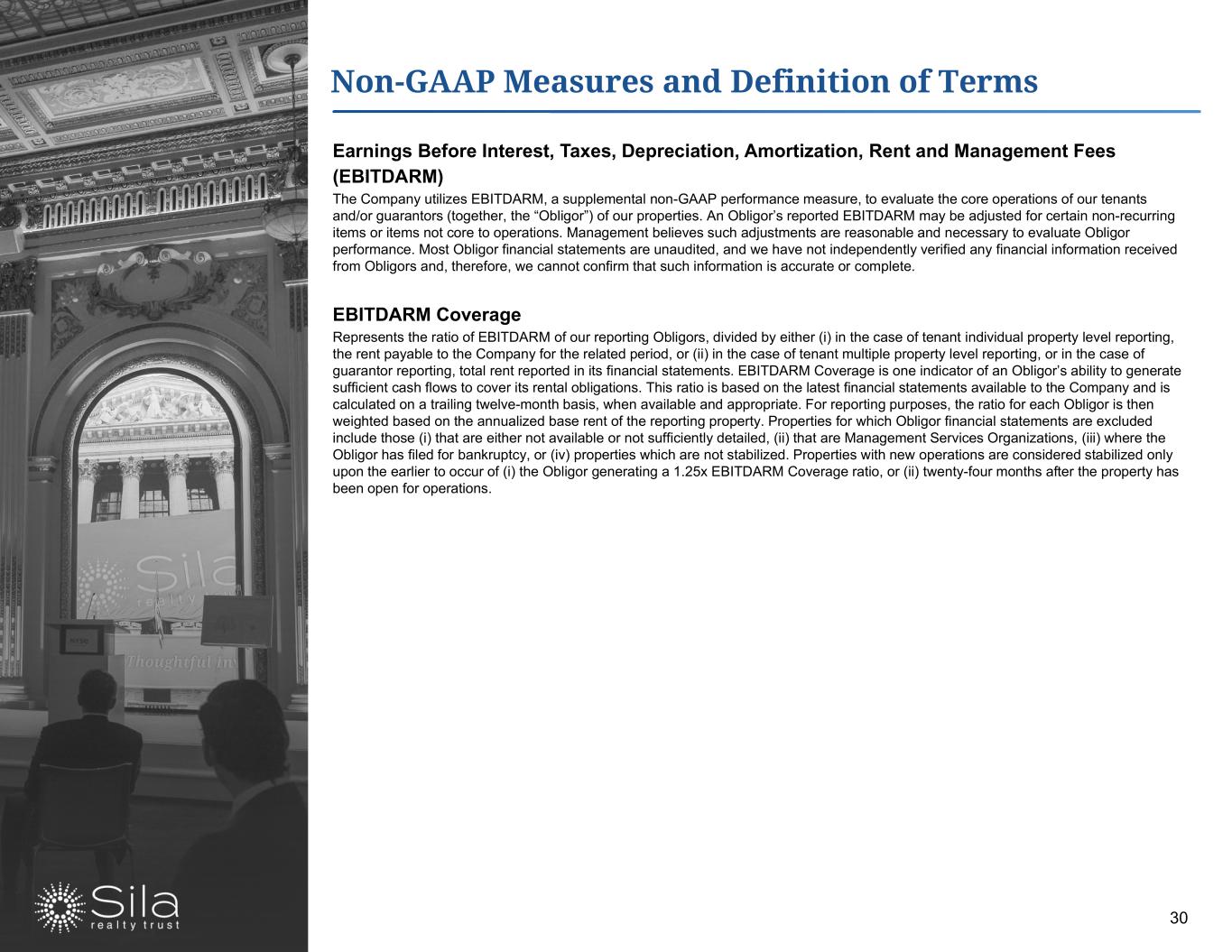 30 Non-GAAP Measures and Definition of Terms Earnings Before Interest, Taxes, Depreciation, Amortization, Rent and Management Fees (EBITDARM) The Company utilizes EBITDARM, a supplemental non-GAAP performance measure, to evaluate the core operations of our tenants and/or guarantors (together, the “Obligor”) of our properties. An Obligor’s reported EBITDARM may be adjusted for certain non-recurring items or items not core to operations. Management believes such adjustments are reasonable and necessary to evaluate Obligor performance. Most Obligor financial statements are unaudited, and we have not independently verified any financial information received from Obligors and, therefore, we cannot confirm that such information is accurate or complete. EBITDARM Coverage Represents the ratio of EBITDARM of our reporting Obligors, divided by either (i) in the case of tenant individual property level reporting, the rent payable to the Company for the related period, or (ii) in the case of tenant multiple property level reporting, or in the case of guarantor reporting, total rent reported in its financial statements. EBITDARM Coverage is one indicator of an Obligor’s ability to generate sufficient cash flows to cover its rental obligations. This ratio is based on the latest financial statements available to the Company and is calculated on a trailing twelve-month basis, when available and appropriate. For reporting purposes, the ratio for each Obligor is then weighted based on the annualized base rent of the reporting property. Properties for which Obligor financial statements are excluded include those (i) that are either not available or not sufficiently detailed, (ii) that are Management Services Organizations, (iii) where the Obligor has filed for bankruptcy, or (iv) properties which are not stabilized. Properties with new operations are considered stabilized only upon the earlier to occur of (i) the Obligor generating a 1.25x EBITDARM Coverage ratio, or (ii) twenty-four months after the property has been open for operations.