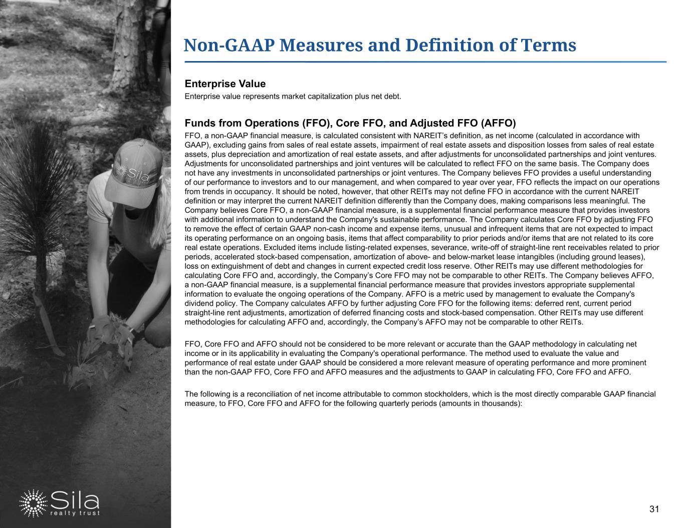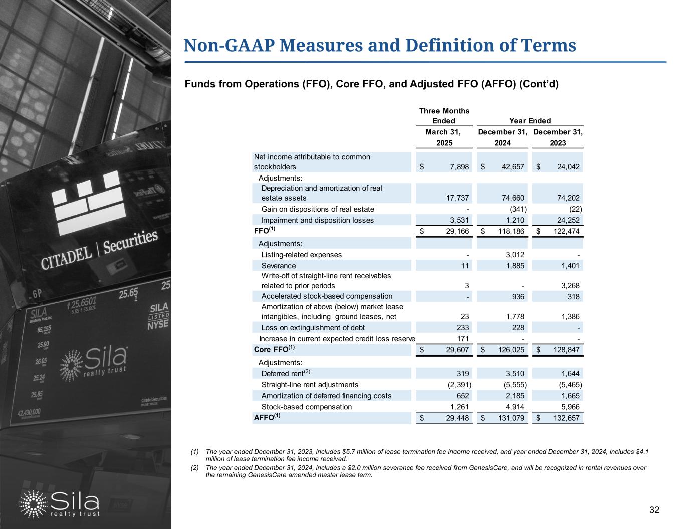 31 Non-GAAP Measures and Definition of Terms Enterprise Value Enterprise value represents market capitalization plus net debt. Funds from Operations (FFO), Core FFO, and Adjusted FFO (AFFO) FFO, a non-GAAP financial measure, is calculated consistent with NAREIT’s definition, as net income (calculated in accordance with GAAP), excluding gains from sales of real estate assets, impairment of real estate assets and disposition losses from sales of real estate assets, plus depreciation and amortization of real estate assets, and after adjustments for unconsolidated partnerships and joint ventures. Adjustments for unconsolidated partnerships and joint ventures will be calculated to reflect FFO on the same basis. The Company does not have any investments in unconsolidated partnerships or joint ventures. The Company believes FFO provides a useful understanding of our performance to investors and to our management, and when compared to year over year, FFO reflects the impact on our operations from trends in occupancy. It should be noted, however, that other REITs may not define FFO in accordance with the current NAREIT definition or may interpret the current NAREIT definition differently than the Company does, making comparisons less meaningful. The Company believes Core FFO, a non-GAAP financial measure, is a supplemental financial performance measure that provides investors with additional information to understand the Company's sustainable performance. The Company calculates Core FFO by adjusting FFO to remove the effect of certain GAAP non-cash income and expense items, unusual and infrequent items that are not expected to impact its operating performance on an ongoing basis, items that affect comparability to prior periods and/or items that are not related to its core real estate operations. Excluded items include listing-related expenses, severance, write-off of straight-line rent receivables related to prior periods, accelerated stock-based compensation, amortization of above- and below-market lease intangibles (including ground leases), loss on extinguishment of debt and changes in current expected credit loss reserve. Other REITs may use different methodologies for calculating Core FFO and, accordingly, the Company’s Core FFO may not be comparable to other REITs. The Company believes AFFO, a non-GAAP financial measure, is a supplemental financial performance measure that provides investors appropriate supplemental information to evaluate the ongoing operations of the Company. AFFO is a metric used by management to evaluate the Company's dividend policy. The Company calculates AFFO by further adjusting Core FFO for the following items: deferred rent, current period straight-line rent adjustments, amortization of deferred financing costs and stock-based compensation. Other REITs may use different methodologies for calculating AFFO and, accordingly, the Company’s AFFO may not be comparable to other REITs. FFO, Core FFO and AFFO should not be considered to be more relevant or accurate than the GAAP methodology in calculating net income or in its applicability in evaluating the Company's operational performance. The method used to evaluate the value and performance of real estate under GAAP should be considered a more relevant measure of operating performance and more prominent than the non-GAAP FFO, Core FFO and AFFO measures and the adjustments to GAAP in calculating FFO, Core FFO and AFFO. The following is a reconciliation of net income attributable to common stockholders, which is the most directly comparable GAAP financial measure, to FFO, Core FFO and AFFO for the following quarterly periods (amounts in thousands):