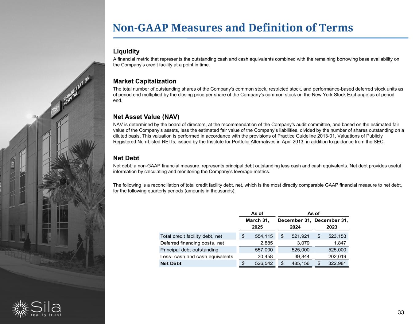 32 Non-GAAP Measures and Definition of Terms Funds from Operations (FFO), Core FFO, and Adjusted FFO (AFFO) (Cont’d) (1) The year ended December 31, 2023, includes $5.7 million of lease termination fee income received, and year ended December 31, 2024, includes $4.1 million of lease termination fee income received. (2) The year ended December 31, 2024, includes a $2.0 million severance fee received from GenesisCare, and will be recognized in rental revenues over the remaining GenesisCare amended master lease term. Three Months Ended March 31, December 31, December 31, 2025 2024 2023 Net income attributable to common stockholders 7,898$ 42,657$ 24,042$ Adjustments: Depreciation and amortization of real estate assets 17,737 74,660 74,202 Gain on dispositions of real estate - (341) (22) Impairment and disposition losses 3,531 1,210 24,252 FFO(1) 29,166$ 118,186$ 122,474$ Adjustments: Listing-related expenses - 3,012 - Severance 11 1,885 1,401 Write-off of straight-line rent receivables related to prior periods 3 - 3,268 Accelerated stock-based compensation - 936 318 Amortization of above (below) market lease intangibles, including ground leases, net 23 1,778 1,386 Loss on extinguishment of debt 233 228 - Increase in current expected credit loss reserve 171 - - Core FFO(1) 29,607$ 126,025$ 128,847$ Adjustments: Deferred rent(2) 319 3,510 1,644 Straight-line rent adjustments (2,391) (5,555) (5,465) Amortization of deferred financing costs 652 2,185 1,665 Stock-based compensation 1,261 4,914 5,966 AFFO(1) 29,448$ 131,079$ 132,657$ Year Ended