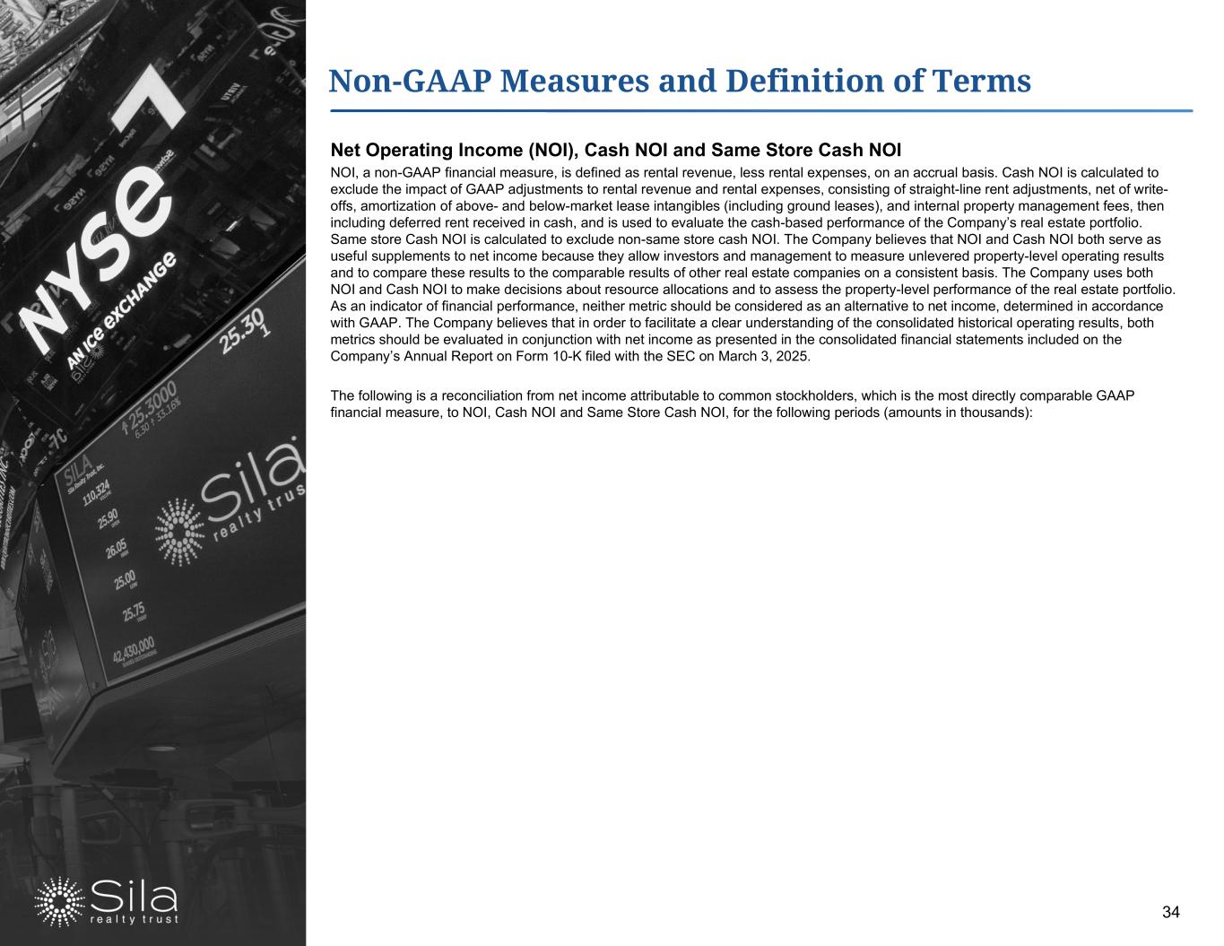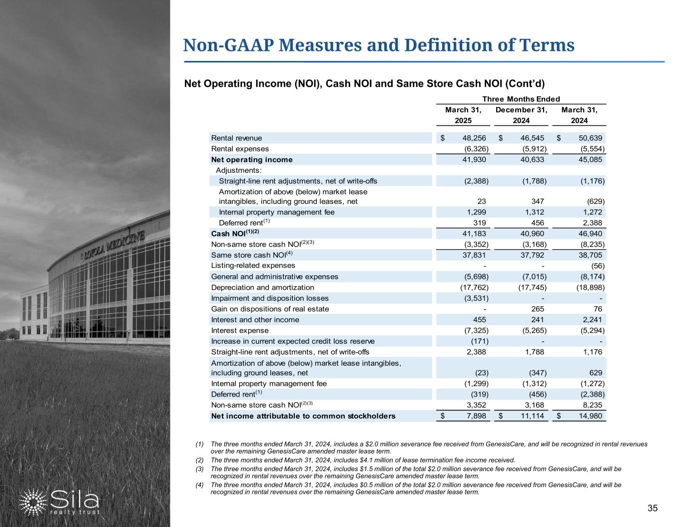 34 Non-GAAP Measures and Definition of Terms Net Operating Income (NOI), Cash NOI and Same Store Cash NOI NOI, a non-GAAP financial measure, is defined as rental revenue, less rental expenses, on an accrual basis. Cash NOI is calculated to exclude the impact of GAAP adjustments to rental revenue and rental expenses, consisting of straight-line rent adjustments, net of write- offs, amortization of above- and below-market lease intangibles (including ground leases), and internal property management fees, then including deferred rent received in cash, and is used to evaluate the cash-based performance of the Company’s real estate portfolio. Same store Cash NOI is calculated to exclude non-same store cash NOI. The Company believes that NOI and Cash NOI both serve as useful supplements to net income because they allow investors and management to measure unlevered property-level operating results and to compare these results to the comparable results of other real estate companies on a consistent basis. The Company uses both NOI and Cash NOI to make decisions about resource allocations and to assess the property-level performance of the real estate portfolio. As an indicator of financial performance, neither metric should be considered as an alternative to net income, determined in accordance with GAAP. The Company believes that in order to facilitate a clear understanding of the consolidated historical operating results, both metrics should be evaluated in conjunction with net income as presented in the consolidated financial statements included on the Company’s Annual Report on Form 10-K filed with the SEC on March 3, 2025. The following is a reconciliation from net income attributable to common stockholders, which is the most directly comparable GAAP financial measure, to NOI, Cash NOI and Same Store Cash NOI, for the following periods (amounts in thousands):