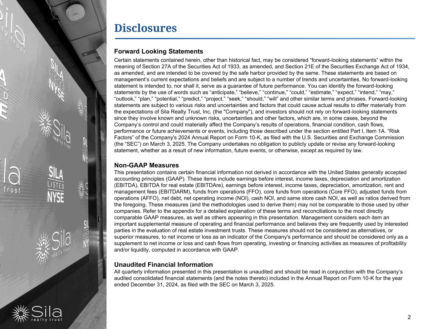 2 Disclosures Forward Looking Statements Certain statements contained herein, other than historical fact, may be considered “forward-looking statements” within the meaning of Section 27A of the Securities Act of 1933, as amended, and Section 21E of the Securities Exchange Act of 1934, as amended, and are intended to be covered by the safe harbor provided by the same. These statements are based on management’s current expectations and beliefs and are subject to a number of trends and uncertainties. No forward-looking statement is intended to, nor shall it, serve as a guarantee of future performance. You can identify the forward-looking statements by the use of words such as “anticipate,” “believe,” “continue,” “could,” “estimate,” “expect,” “intend,” “may,” “outlook,” “plan,” “potential,” “predict,” “project,” “seek,” “should,” “will” and other similar terms and phrases. Forward-looking statements are subject to various risks and uncertainties and factors that could cause actual results to differ materially from the expectations of Sila Realty Trust, Inc. (the "Company"), and investors should not rely on forward-looking statements since they involve known and unknown risks, uncertainties and other factors, which are, in some cases, beyond the Company’s control and could materially affect the Company’s results of operations, financial condition, cash flows, performance or future achievements or events, including those described under the section entitled Part I, Item 1A. “Risk Factors” of the Company's 2024 Annual Report on Form 10-K, as filed with the U.S. Securities and Exchange Commission (the “SEC”) on March 3, 2025. The Company undertakes no obligation to publicly update or revise any forward-looking statement, whether as a result of new information, future events, or otherwise, except as required by law. Non-GAAP Measures This presentation contains certain financial information not derived in accordance with the United States generally accepted accounting principles (GAAP). These items include earnings before interest, income taxes, depreciation and amortization (EBITDA), EBITDA for real estate (EBITDAre), earnings before interest, income taxes, depreciation, amortization, rent and management fees (EBITDARM), funds from operations (FFO), core funds from operations (Core FFO), adjusted funds from operations (AFFO), net debt, net operating income (NOI), cash NOI, and same store cash NOI, as well as ratios derived from the foregoing. These measures (and the methodologies used to derive them) may not be comparable to those used by other companies. Refer to the appendix for a detailed explanation of these terms and reconciliations to the most directly comparable GAAP measures, as well as others appearing in this presentation. Management considers each item an important supplemental measure of operating and financial performance and believes they are frequently used by interested parties in the evaluation of real estate investment trusts. These measures should not be considered as alternatives, or superior measures, to net income or loss as an indicator of the Company's performance and should be considered only as a supplement to net income or loss and cash flows from operating, investing or financing activities as measures of profitability and/or liquidity, computed in accordance with GAAP. Unaudited Financial Information All quarterly information presented in this presentation is unaudited and should be read in conjunction with the Company’s audited consolidated financial statements (and the notes thereto) included in the Annual Report on Form 10-K for the year ended December 31, 2024, as filed with the SEC on March 3, 2025. 2