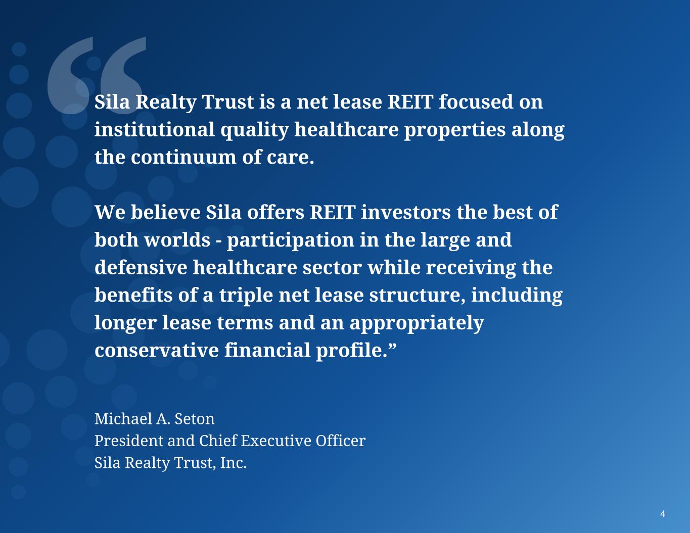 Sila Realty Trust is a net lease REIT focused on institutional quality healthcare properties along the continuum of care. We believe Sila offers REIT investors the best of both worlds - participation in the large and defensive healthcare sector while receiving the benefits of a triple net lease structure, including longer lease terms and an appropriately conservative financial profile.” Michael A. Seton President and Chief Executive Officer Sila Realty Trust, Inc. 4