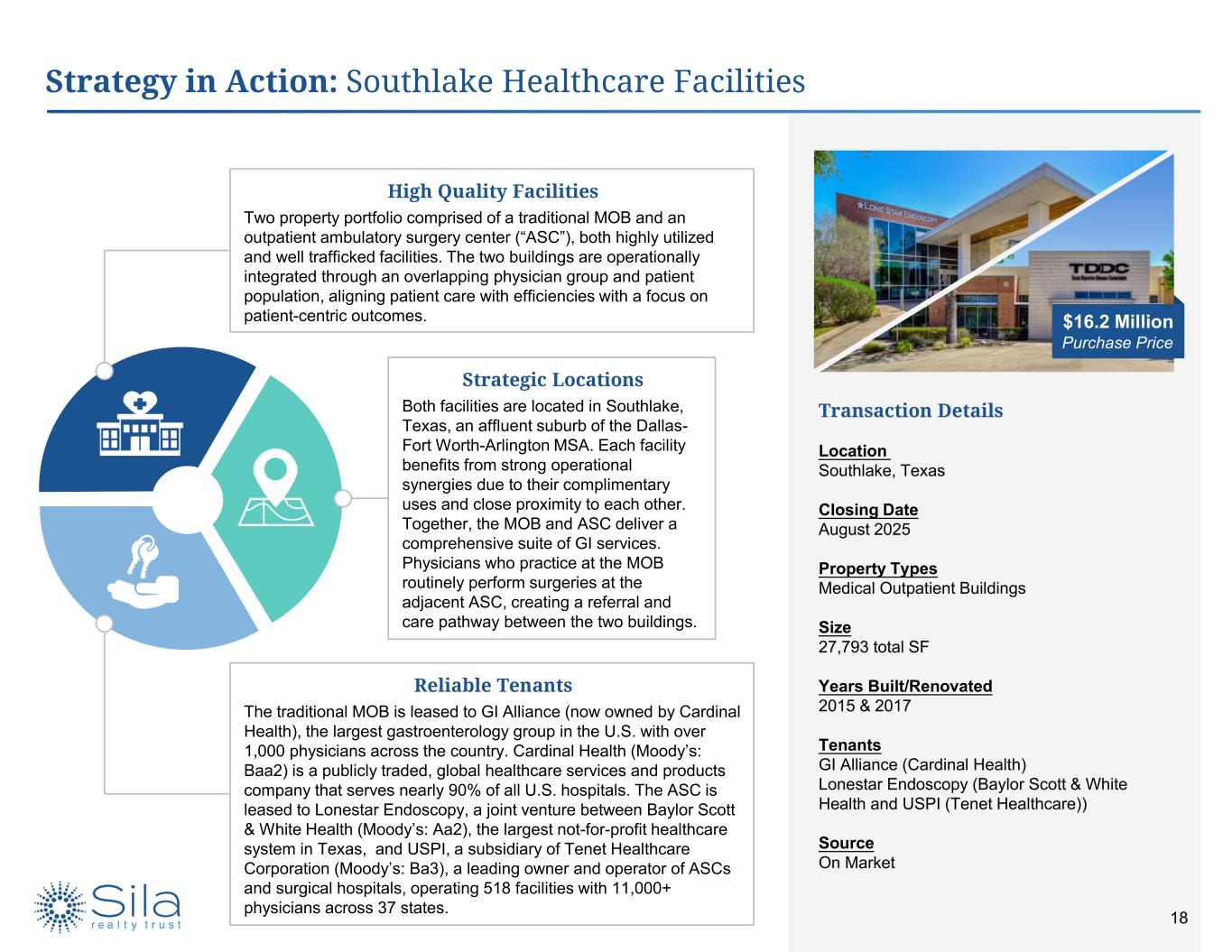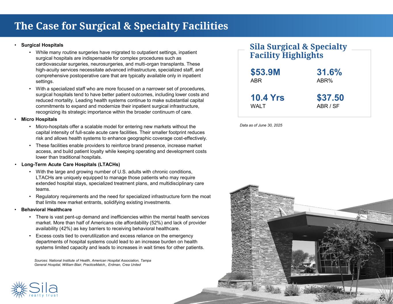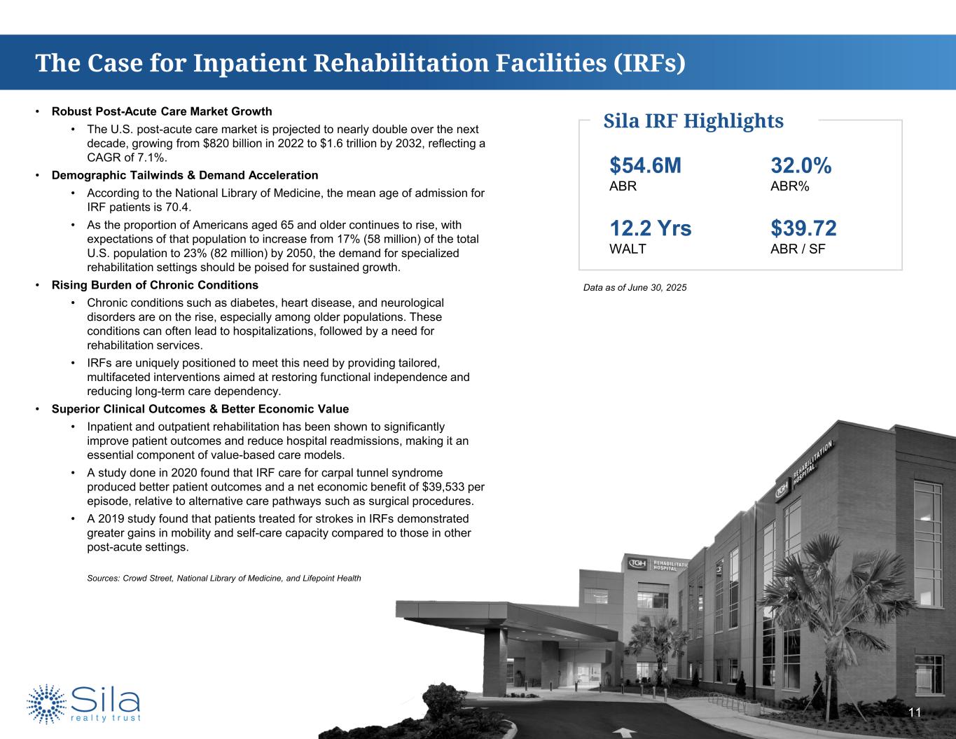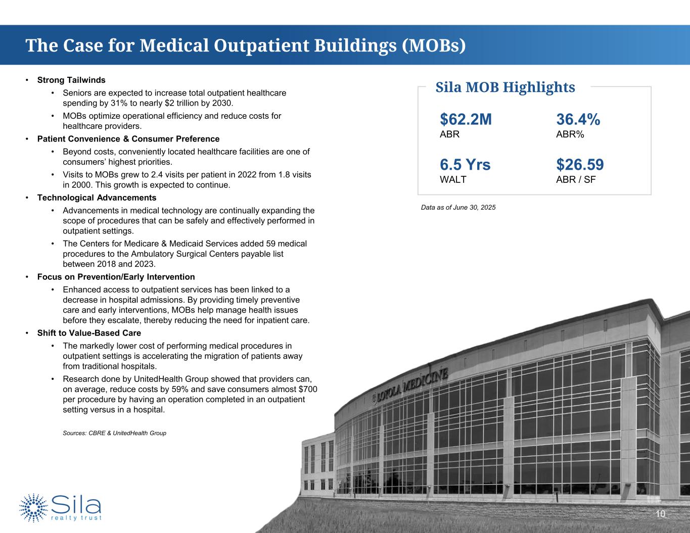 10 now and into the future. Sources: CBRE & UnitedHealth Group $62.2M ABR 36.4% ABR% 6.5 Yrs WALT $26.59 ABR / SF Sila MOB Highlights The Case for Medical Outpatient Buildings (MOBs) • Strong Tailwinds • Seniors are expected to increase total outpatient healthcare spending by 31% to nearly $2 trillion by 2030. • MOBs optimize operational efficiency and reduce costs for healthcare providers. • Patient Convenience & Consumer Preference • Beyond costs, conveniently located healthcare facilities are one of consumers’ highest priorities. • Visits to MOBs grew to 2.4 visits per patient in 2022 from 1.8 visits in 2000. This growth is expected to continue. • Technological Advancements • Advancements in medical technology are continually expanding the scope of procedures that can be safely and effectively performed in outpatient settings. • The Centers for Medicare & Medicaid Services added 59 medical procedures to the Ambulatory Surgical Centers payable list between 2018 and 2023. • Focus on Prevention/Early Intervention • Enhanced access to outpatient services has been linked to a decrease in hospital admissions. By providing timely preventive care and early interventions, MOBs help manage health issues before they escalate, thereby reducing the need for inpatient care. • Shift to Value-Based Care • The markedly lower cost of performing medical procedures in outpatient settings is accelerating the migration of patients away from traditional hospitals. • Research done by UnitedHealth Group showed that providers can, on average, reduce costs by 59% and save consumers almost $700 per procedure by having an operation completed in an outpatient setting versus in a hospital. Data as of June 30, 2025