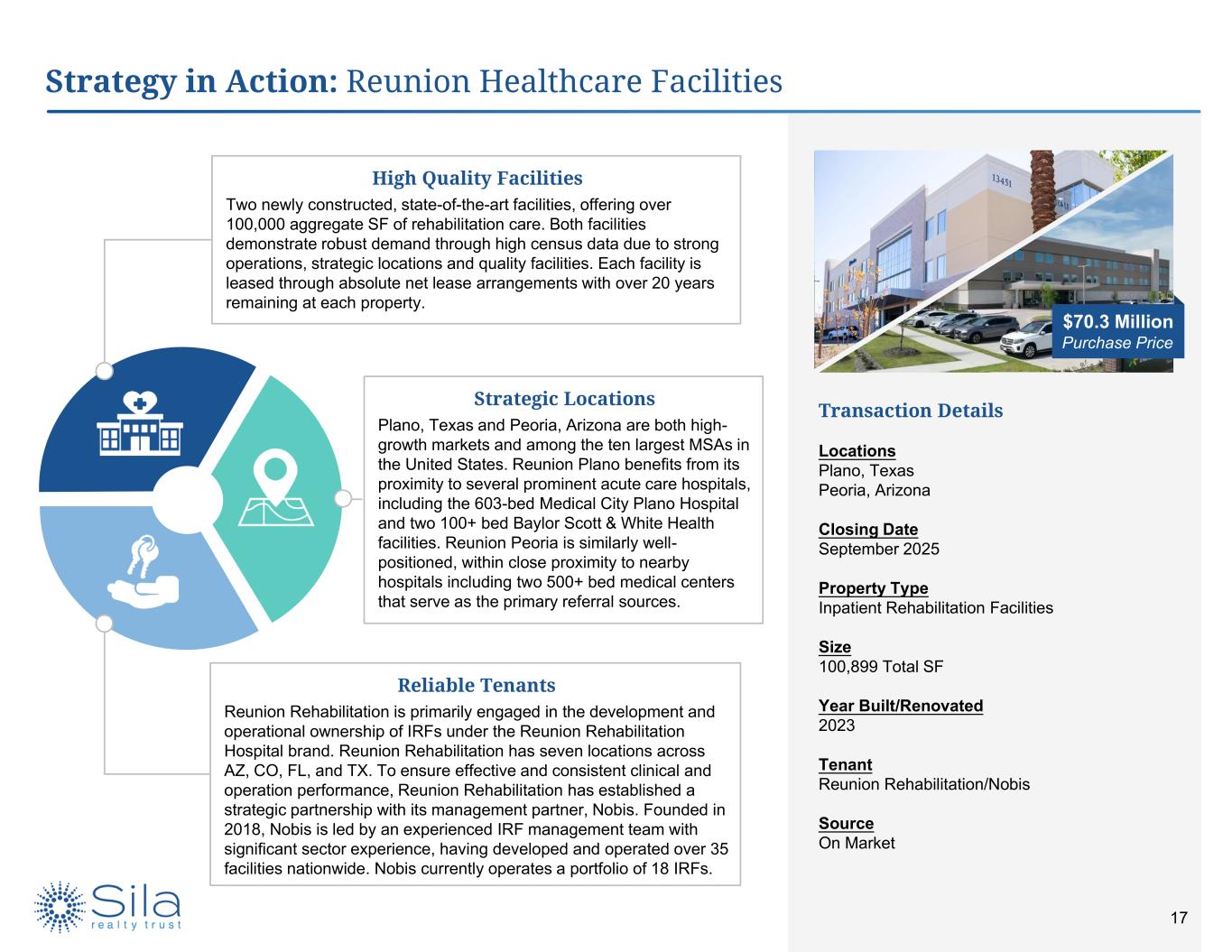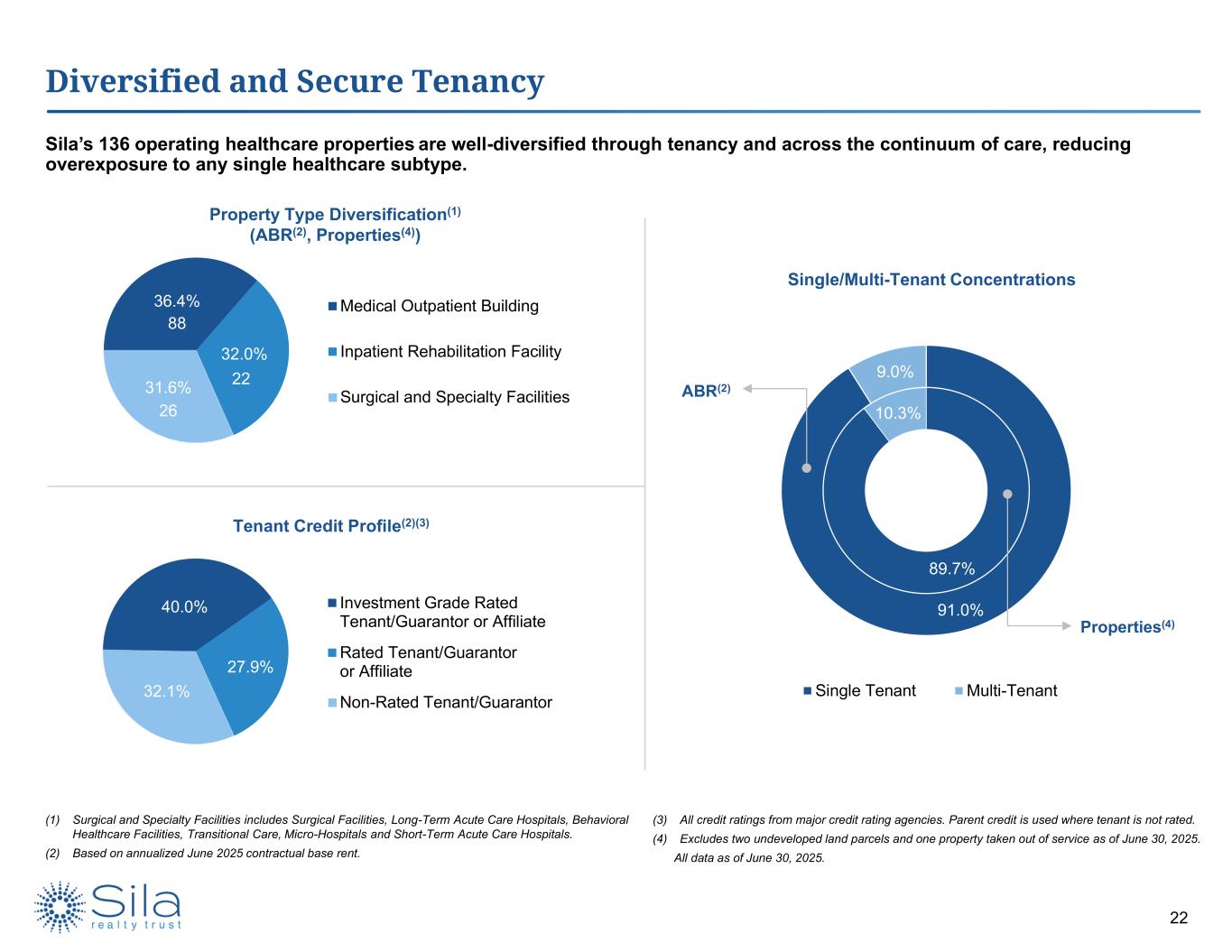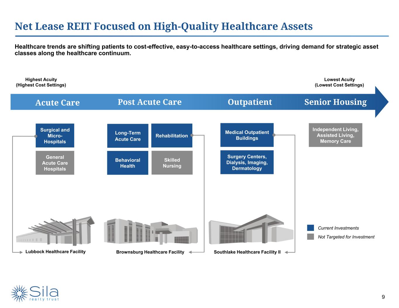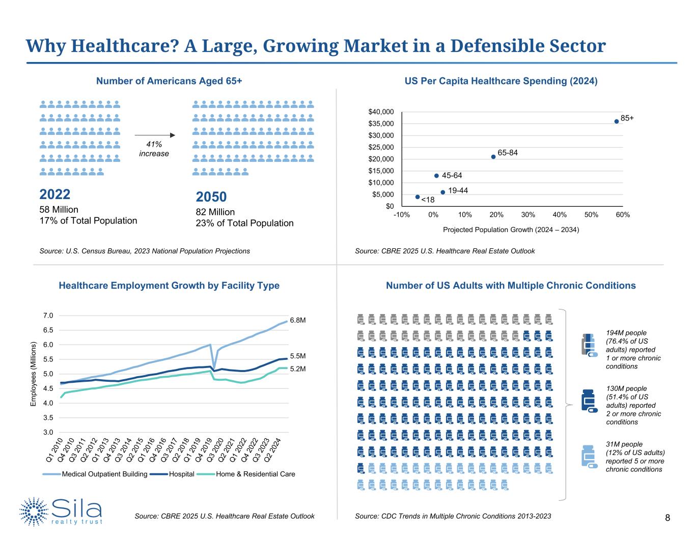 10 now and into the future. Sources: CBRE & UnitedHealth Group $62.2M ABR 36.4% ABR% 6.5 Yrs WALT $26.59 ABR / SF Sila MOB Highlights The Case for Medical Outpatient Buildings (MOBs) • Strong Tailwinds • Seniors are expected to increase total outpatient healthcare spending by 31% to nearly $2 trillion by 2030. • MOBs optimize operational efficiency and reduce costs for healthcare providers. • Patient Convenience & Consumer Preference • Beyond costs, conveniently located healthcare facilities are one of consumers’ highest priorities. • Visits to MOBs grew to 2.4 visits per patient in 2022 from 1.8 visits in 2000. This growth is expected to continue. • Technological Advancements • Advancements in medical technology are continually expanding the scope of procedures that can be safely and effectively performed in outpatient settings. • The Centers for Medicare & Medicaid Services added 59 medical procedures to the Ambulatory Surgical Centers payable list between 2018 and 2023. • Focus on Prevention/Early Intervention • Enhanced access to outpatient services has been linked to a decrease in hospital admissions. By providing timely preventive care and early interventions, MOBs help manage health issues before they escalate, thereby reducing the need for inpatient care. • Shift to Value-Based Care • The markedly lower cost of performing medical procedures in outpatient settings is accelerating the migration of patients away from traditional hospitals. • Research done by UnitedHealth Group showed that providers can, on average, reduce costs by 59% and save consumers almost $700 per procedure by having an operation completed in an outpatient setting versus in a hospital. Data as of June 30, 2025