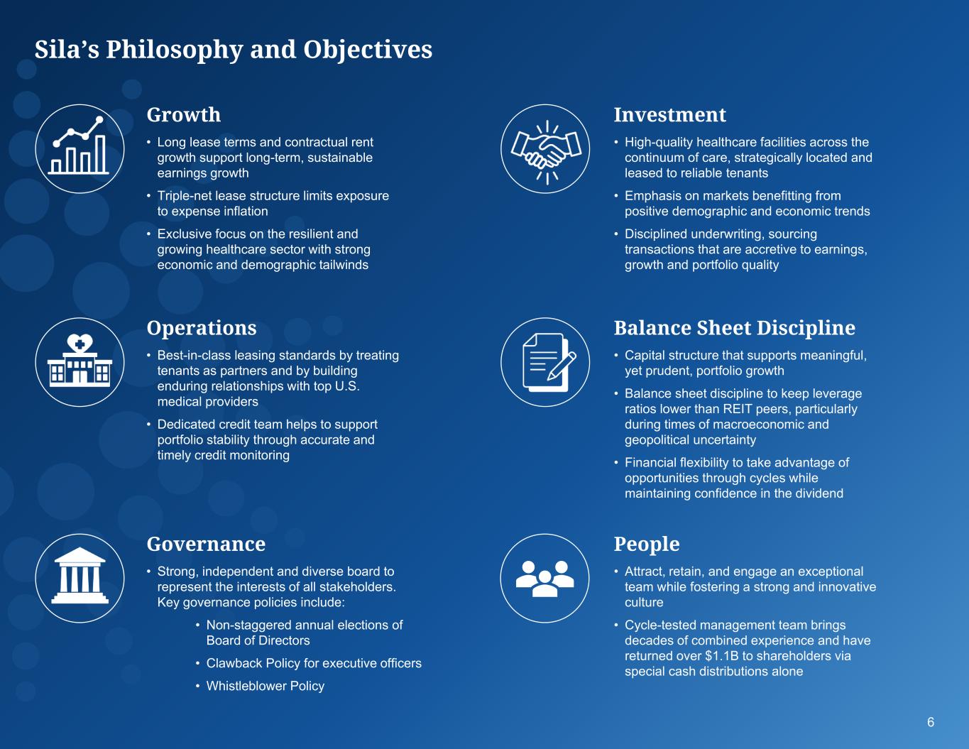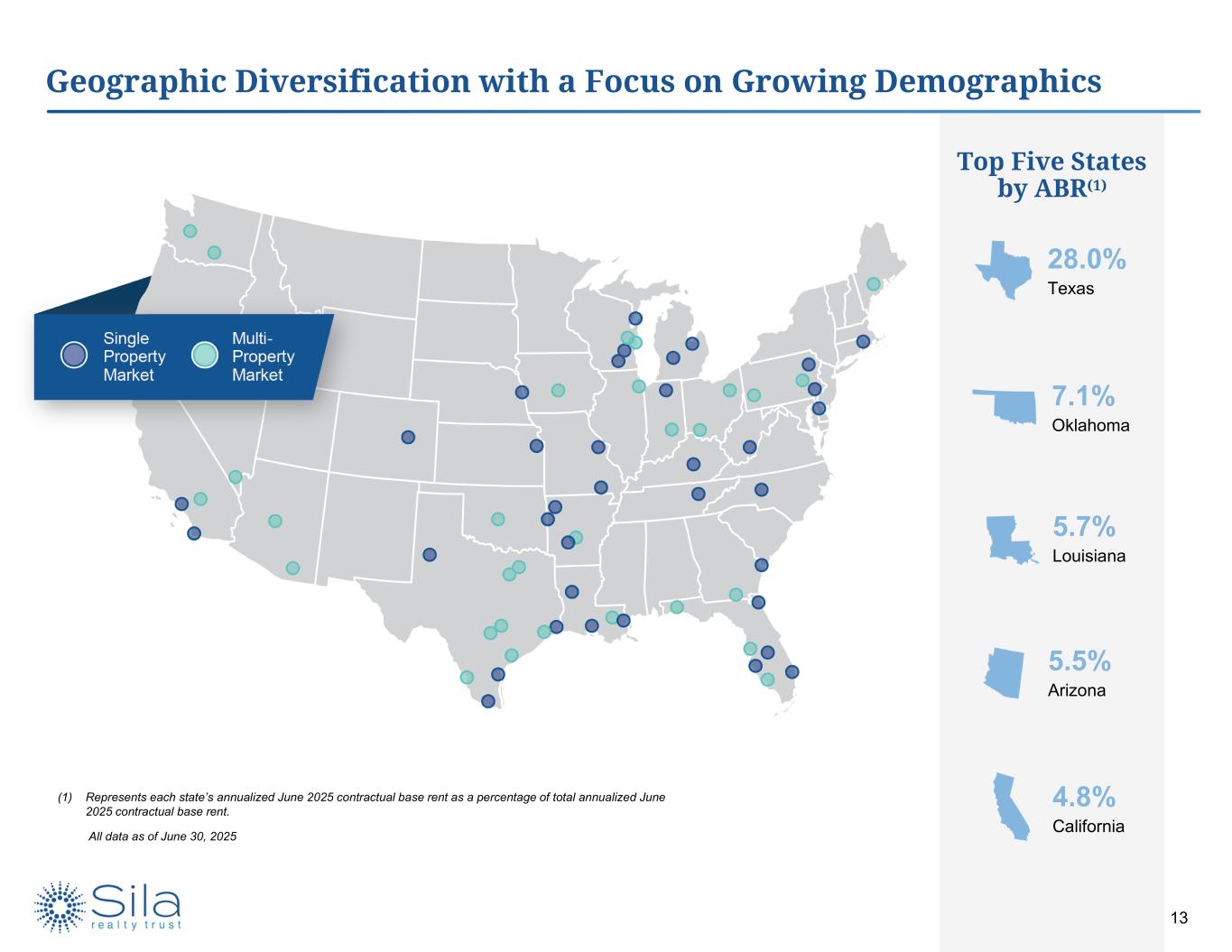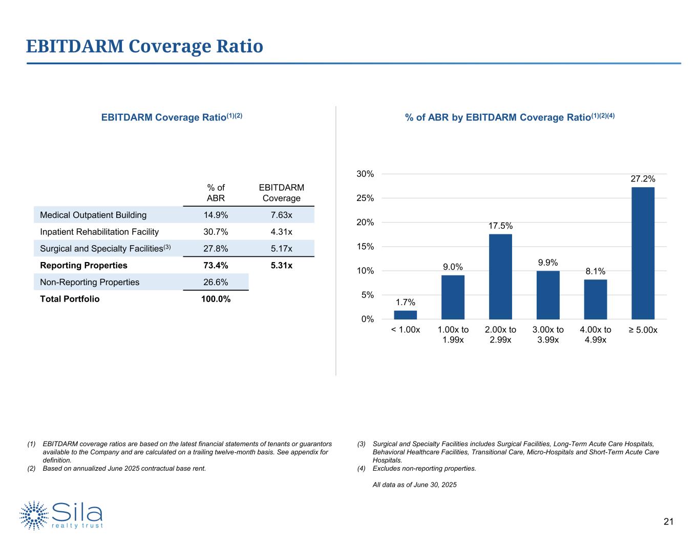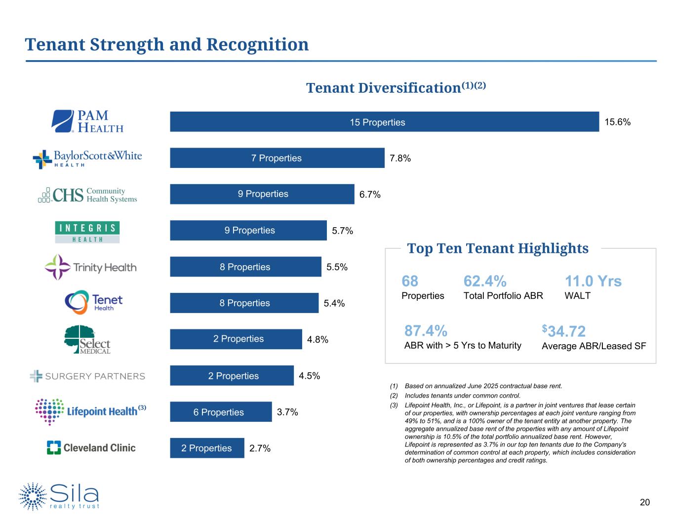 10 now and into the future. Sources: CBRE & UnitedHealth Group $62.2M ABR 36.4% ABR% 6.5 Yrs WALT $26.59 ABR / SF Sila MOB Highlights The Case for Medical Outpatient Buildings (MOBs) • Strong Tailwinds • Seniors are expected to increase total outpatient healthcare spending by 31% to nearly $2 trillion by 2030. • MOBs optimize operational efficiency and reduce costs for healthcare providers. • Patient Convenience & Consumer Preference • Beyond costs, conveniently located healthcare facilities are one of consumers’ highest priorities. • Visits to MOBs grew to 2.4 visits per patient in 2022 from 1.8 visits in 2000. This growth is expected to continue. • Technological Advancements • Advancements in medical technology are continually expanding the scope of procedures that can be safely and effectively performed in outpatient settings. • The Centers for Medicare & Medicaid Services added 59 medical procedures to the Ambulatory Surgical Centers payable list between 2018 and 2023. • Focus on Prevention/Early Intervention • Enhanced access to outpatient services has been linked to a decrease in hospital admissions. By providing timely preventive care and early interventions, MOBs help manage health issues before they escalate, thereby reducing the need for inpatient care. • Shift to Value-Based Care • The markedly lower cost of performing medical procedures in outpatient settings is accelerating the migration of patients away from traditional hospitals. • Research done by UnitedHealth Group showed that providers can, on average, reduce costs by 59% and save consumers almost $700 per procedure by having an operation completed in an outpatient setting versus in a hospital. Data as of June 30, 2025