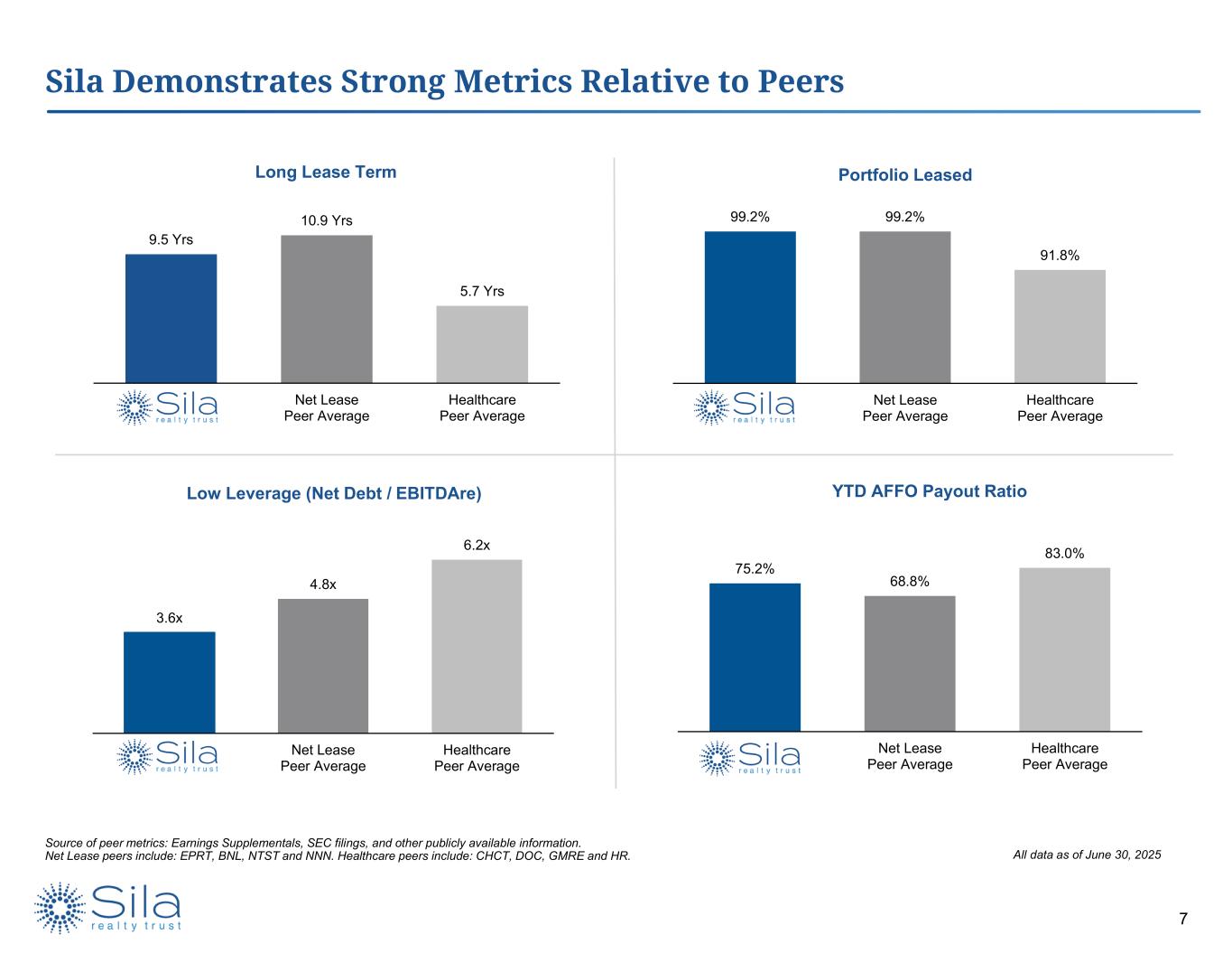 Sila’s Philosophy and Objectives Growth • Long lease terms and contractual rent growth support long-term, sustainable earnings growth • Triple-net lease structure limits exposure to expense inflation • Exclusive focus on the resilient and growing healthcare sector with strong economic and demographic tailwinds Governance • Strong, independent and diverse board to represent the interests of all stakeholders. Key governance policies include: • Non-staggered annual elections of Board of Directors • Clawback Policy for executive officers • Whistleblower Policy Balance Sheet Discipline • Capital structure that supports meaningful, yet prudent, portfolio growth • Balance sheet discipline to keep leverage ratios lower than REIT peers, particularly during times of macroeconomic and geopolitical uncertainty • Financial flexibility to take advantage of opportunities through cycles while maintaining confidence in the dividend Operations • Best-in-class leasing standards by treating tenants as partners and by building enduring relationships with top U.S. medical providers • Dedicated credit team helps to support portfolio stability through accurate and timely credit monitoring 6 People • Attract, retain, and engage an exceptional team while fostering a strong and innovative culture • Cycle-tested management team brings decades of combined experience and have returned over $1.1B to shareholders via special cash distributions alone Investment • High-quality healthcare facilities across the continuum of care, strategically located and leased to reliable tenants • Emphasis on markets benefitting from positive demographic and economic trends • Disciplined underwriting, sourcing transactions that are accretive to earnings, growth and portfolio quality